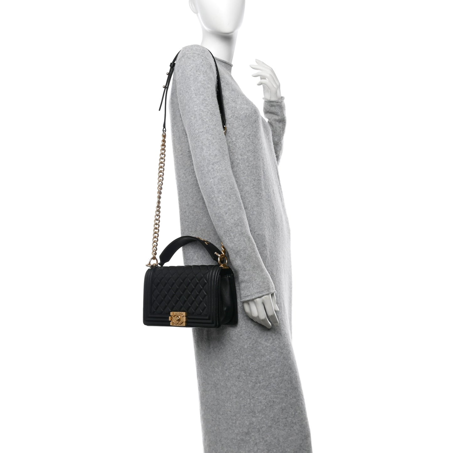 This is an authentic CHANEL Calfskin Medium Boy Logo Top Handle Flap in Black. This chic shoulder bag is crafted of diamond quilted calfskin leather in black. The bag features a leather top handle with a Chanel logo in aged gold, and an aged gold chain link shoulder strap with a leather shoulder pad. The crossover flap opens with a boy CC press lock to a black fabric interior with a patch pocket.Follow this item for alerts. Chanel is a registered trademark of Chanel. FASHIONPHILE is not affiliated with Chanel.