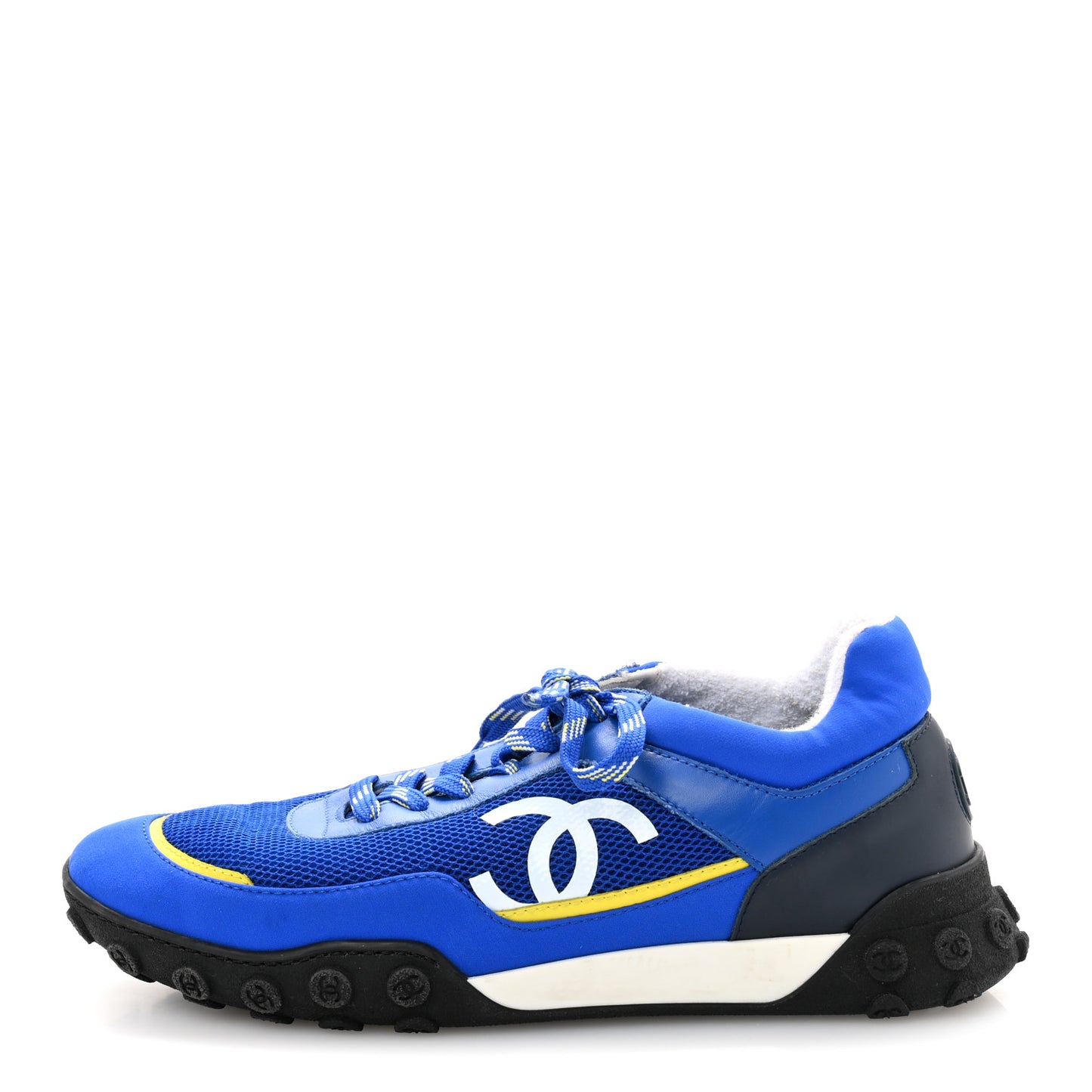 This is an authentic pair of CHANEL Calfskin Mesh Lycra Womens Logo Sneakers 38 in Royal Blue. These stunning sneakers are crafted of blue mesh nylon fabric with black and blue leather trim. The shoes feature a blue CC logo at the heel and rugged rubber soles for traction.Follow this item for alerts. Chanel is a registered trademark of Chanel. FASHIONPHILE is not affiliated with Chanel.