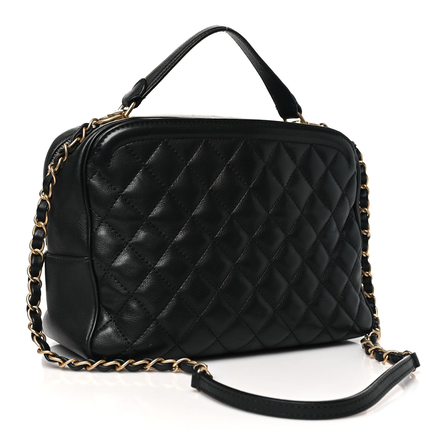 This is an authentic CHANEL Calfskin Quilted CC Medium Vanity Case in Black. This chic travel bag is crafted of diamond-quilted calfskin leather in black. It features a black leather handle, matte gold chain link black leather threaded shoulder straps and a Channel CC logo in gold. The two top zippers open to a black fabric interior with a zipper and patched pocket.Follow this item for alerts. Chanel is a registered trademark of Chanel. FASHIONPHILE is not affiliated with Chanel.