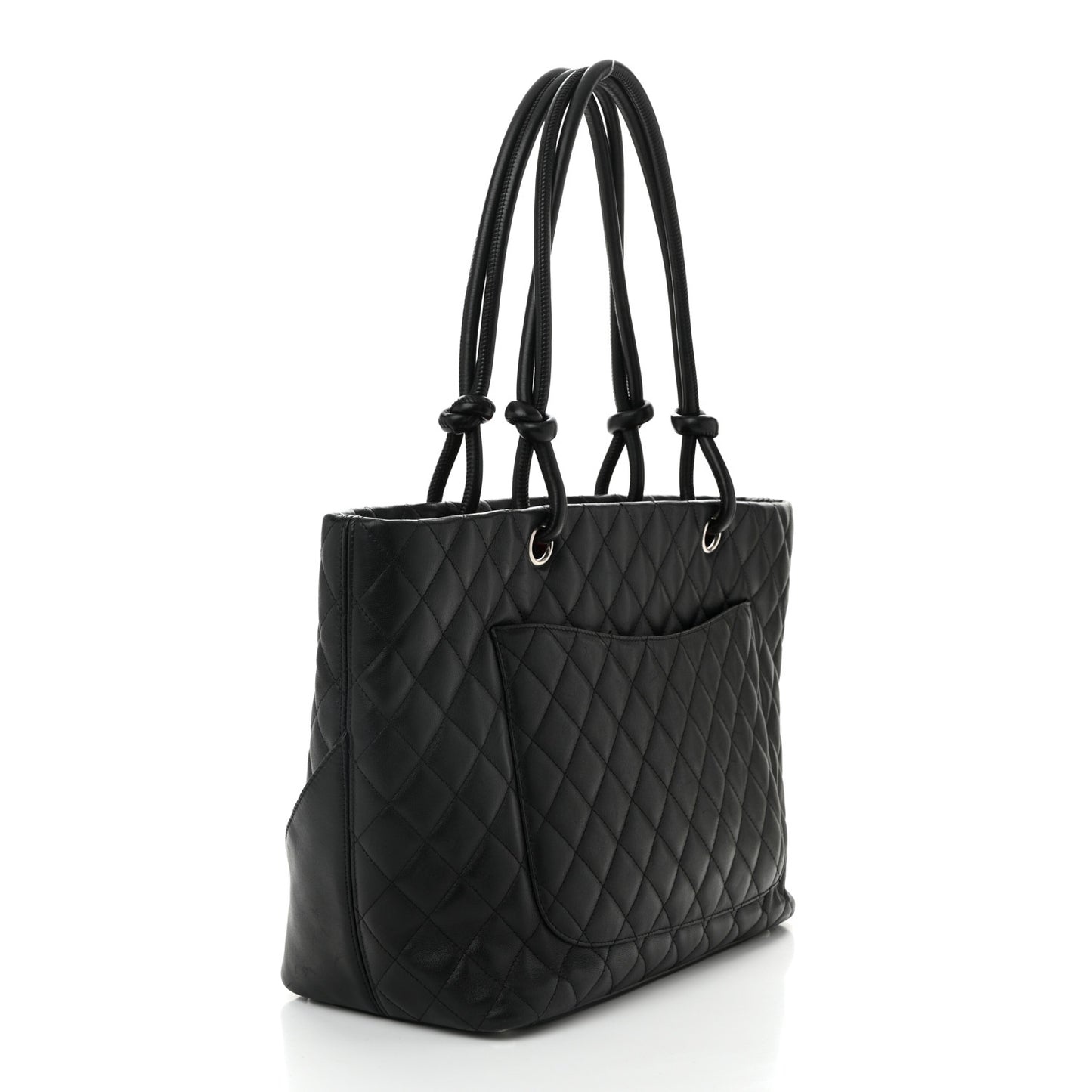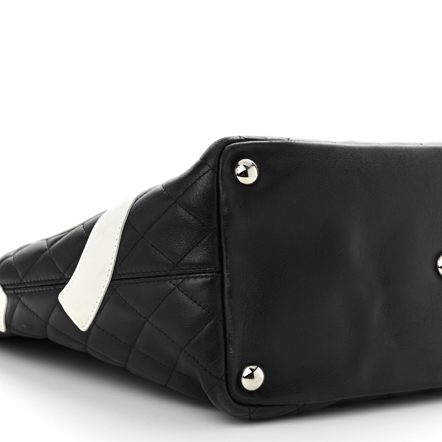 This is an authentic CHANEL Calfskin Quilted Large Cambon Tote in Black and White. This stylish shoulder bag is beautifully crafted of soft diamond quilted calfskin leather in black. The handbag features leather rope top handles that are knotted at the ends and a large offset leather Chanel CC logo patch to one side. The top zipper opens to a bright pink Chanel monogram fabric interior with zipper and patch pockets.Follow this item for alerts. Chanel is a registered trademark of Chanel. FASHIONPHILE is not affiliated with Chanel.