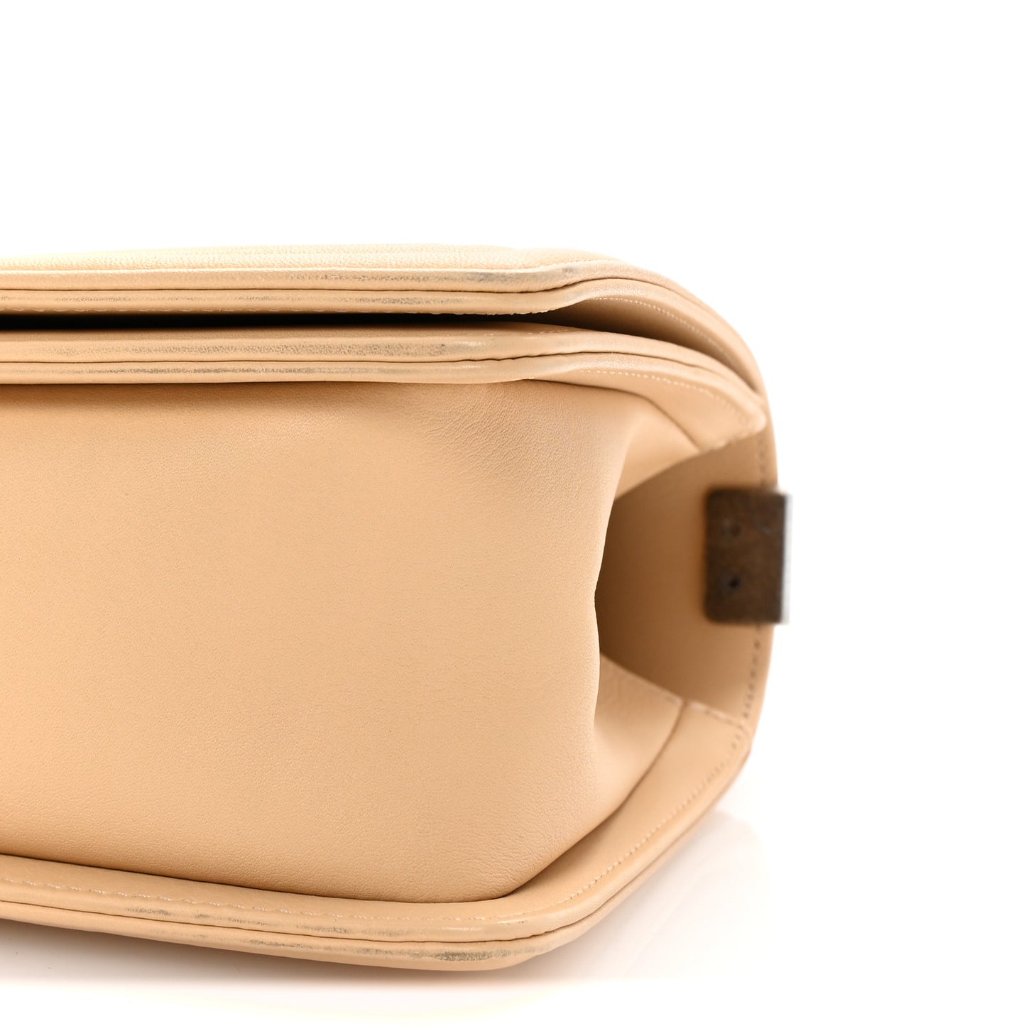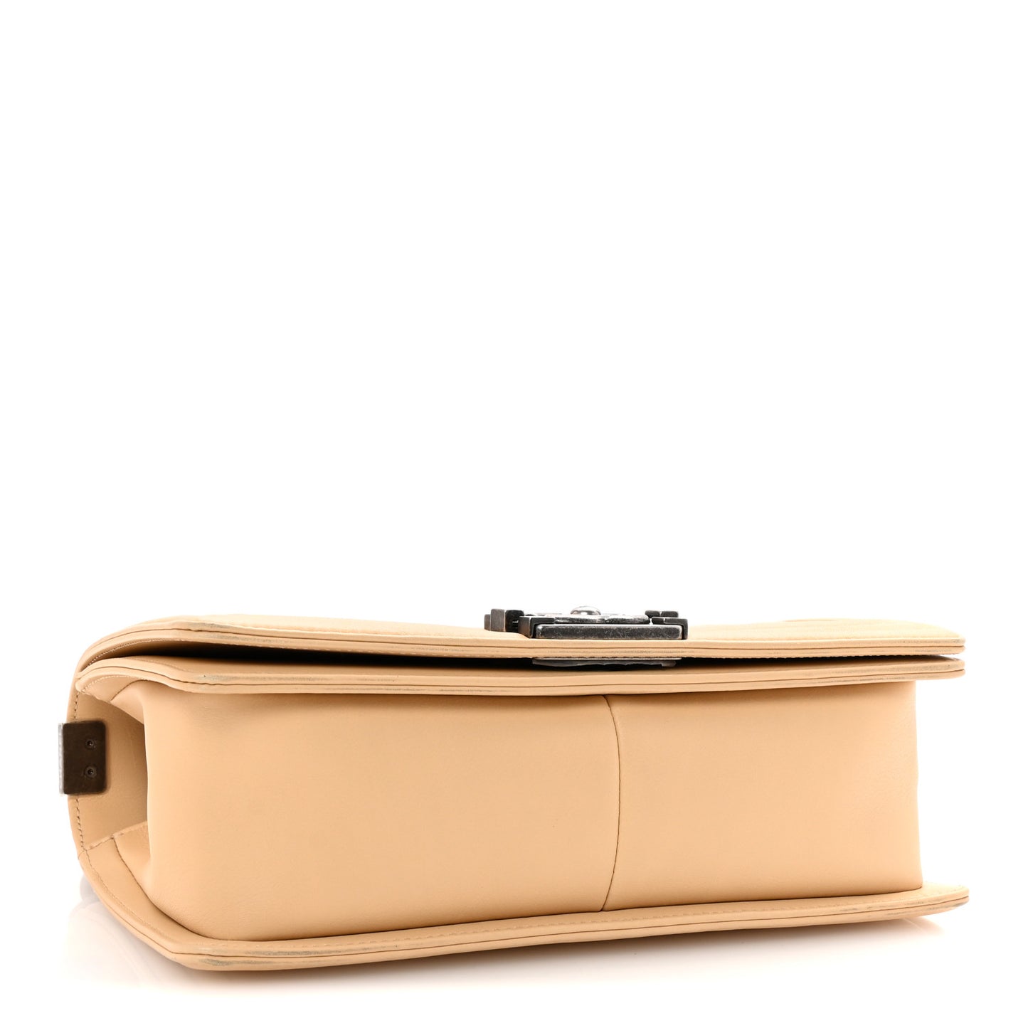 This is an authentic CHANEL Calfskin Quilted Medium Boy Flap in Beige. This stylish shoulder bag is crafted of beautiful diamond quilted calfskin leather in beige. The bag features a ruthenium chain shoulder strap with a leather shoulder pad and a full front flap with linear quilted borders and a ruthenium Chanel CC Boy press lock. This opens to a matching fabric interior with a flat pocket.Follow this item for alerts. Chanel is a registered trademark of Chanel. FASHIONPHILE is not affiliated with Chanel.