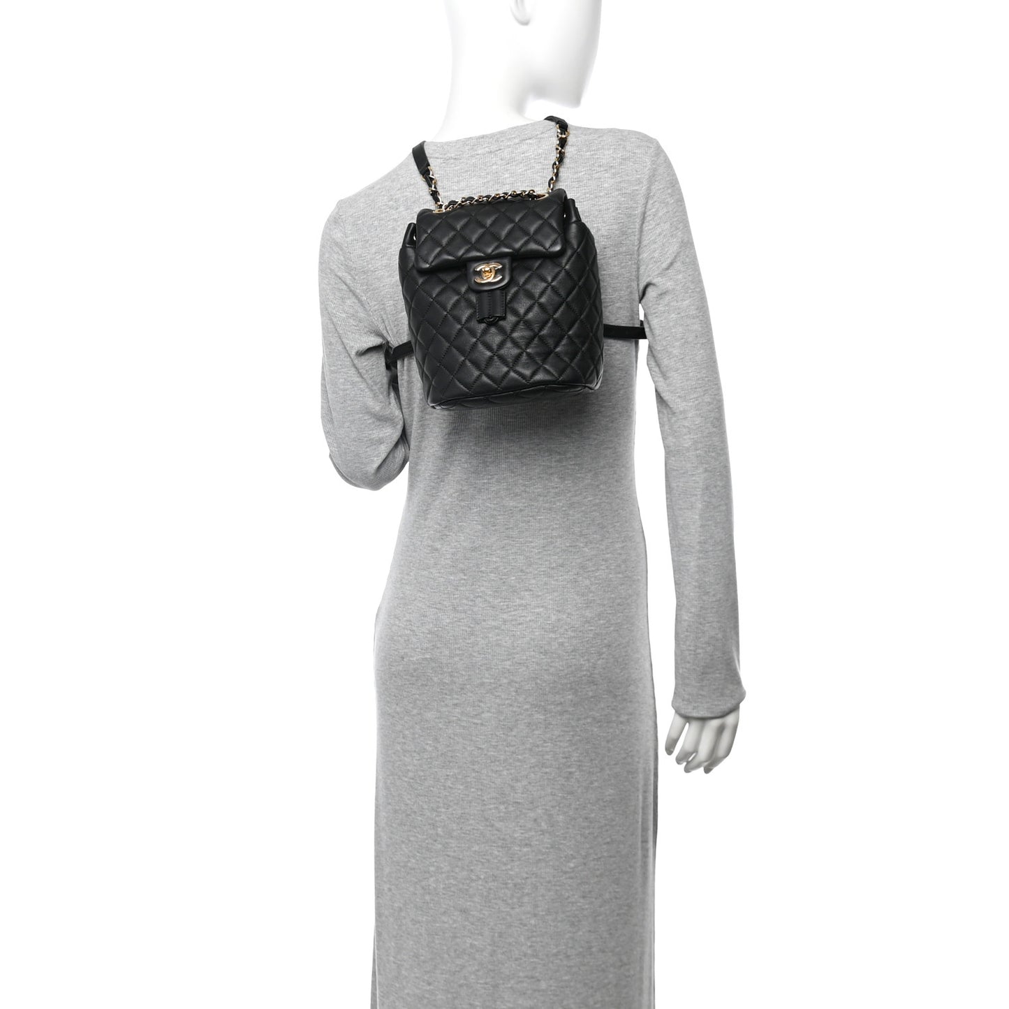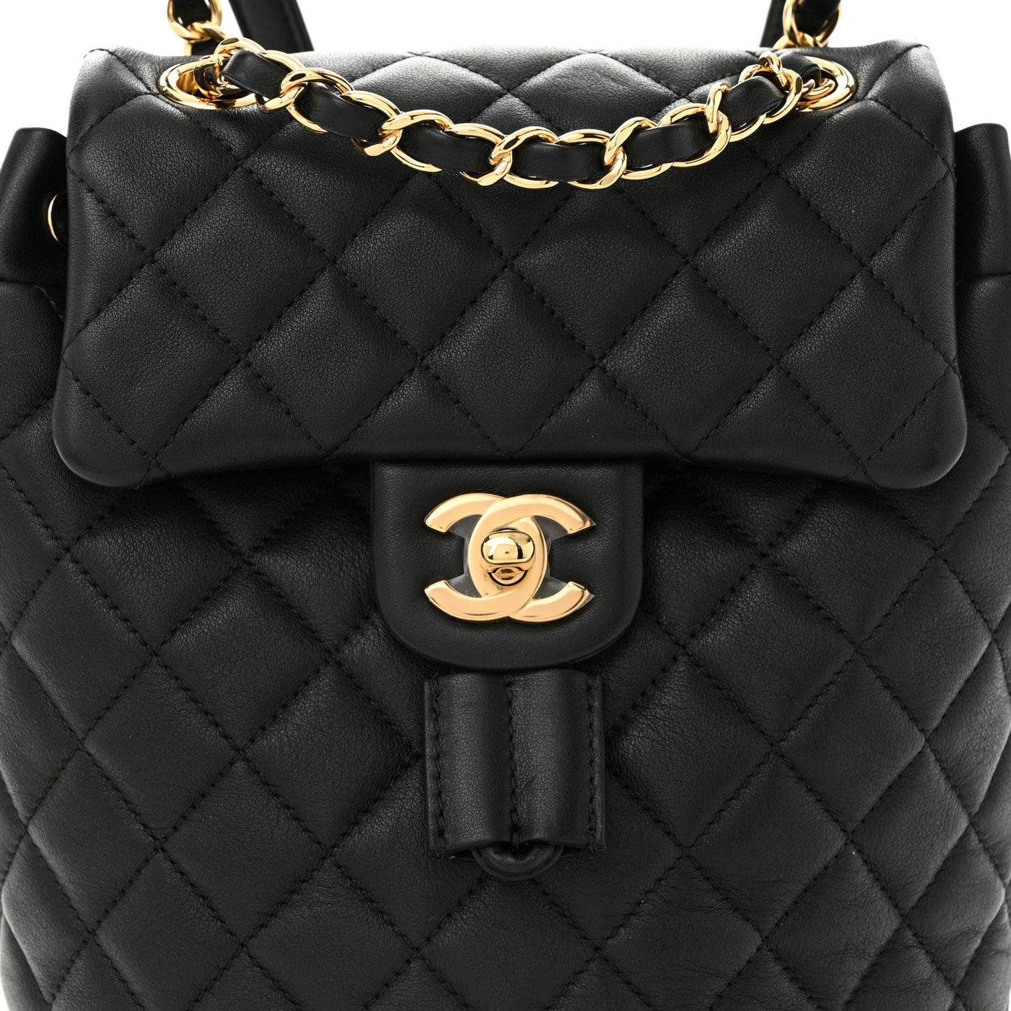 This is an authentic CHANEL Calfskin Quilted Mini Urban Spirit Backpack in Black. This stylish backpack is beautifully crafted of soft and smooth diamond-quilted calfskin leather in black. It features polished gold chain link leather threaded shoulder straps, an exterior rear patch pocket, a facing external flap that opens with a polished gold Chanel CC turn lock and an open top that closes with a cinch cord. This opens to a spacious black fabric interior with zipper and patch pockets.Follow this item for alerts. Chanel is a registered trademark of Chanel. FASHIONPHILE is not affiliated with Chanel.