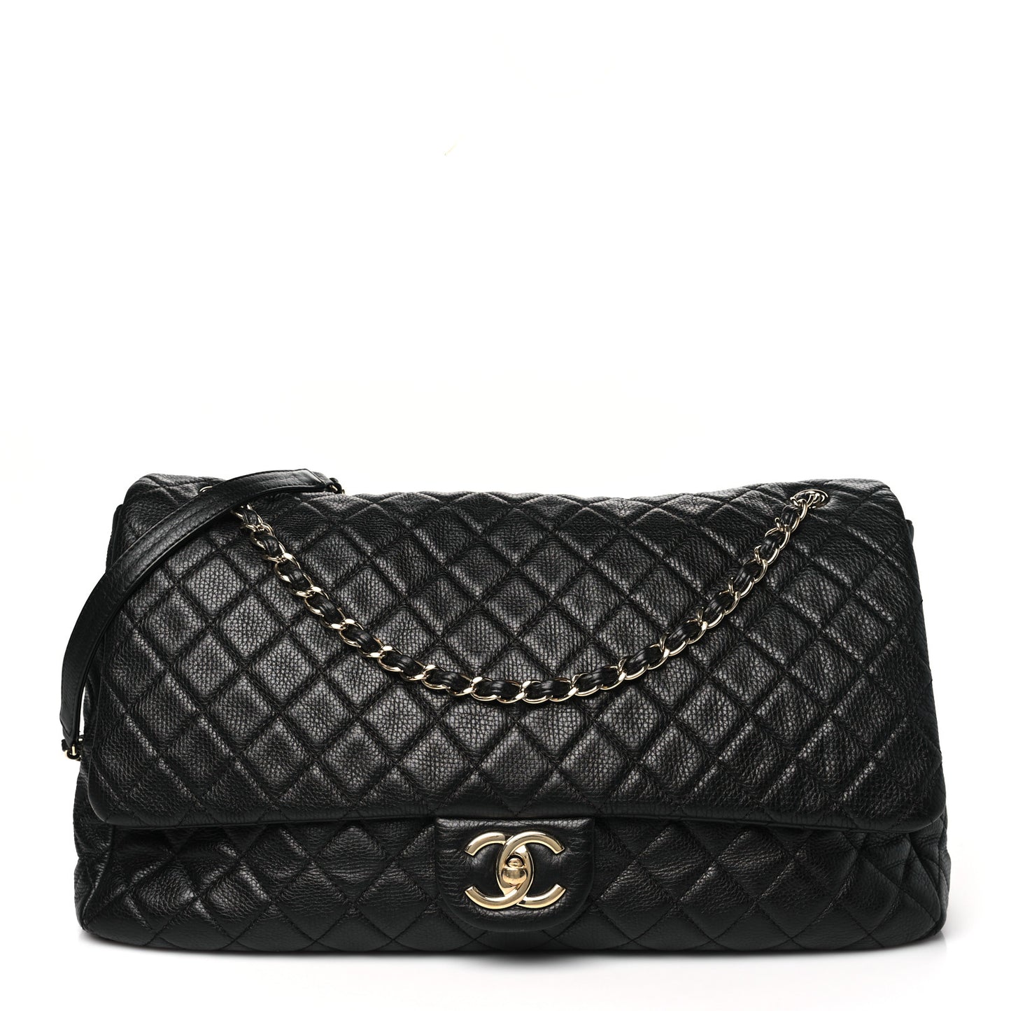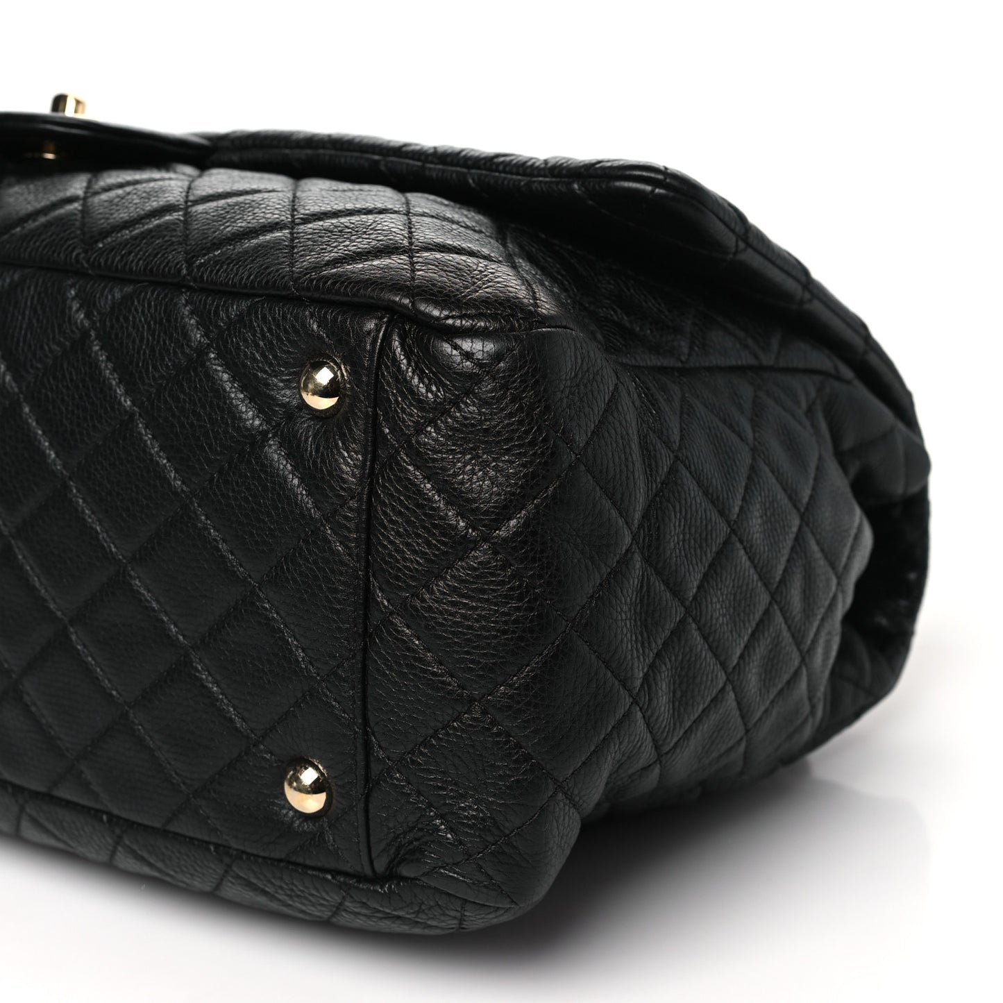 This is an authentic CHANEL Calfskin Quilted XXL Travel Flap Bag in Black. This chic oversized flap is crafted of black calfskin quilted leather in black. The shoulder bag features a rear patch pocket, a chain-link shoulder strap threaded with black leather and a leather shoulder pad. The CC turn lock opens to a spacious partitioned black fabric interior with patch pockets and a front zipper compartment.Follow this item for alerts. Chanel is a registered trademark of Chanel. FASHIONPHILE is not affiliated with Chanel.