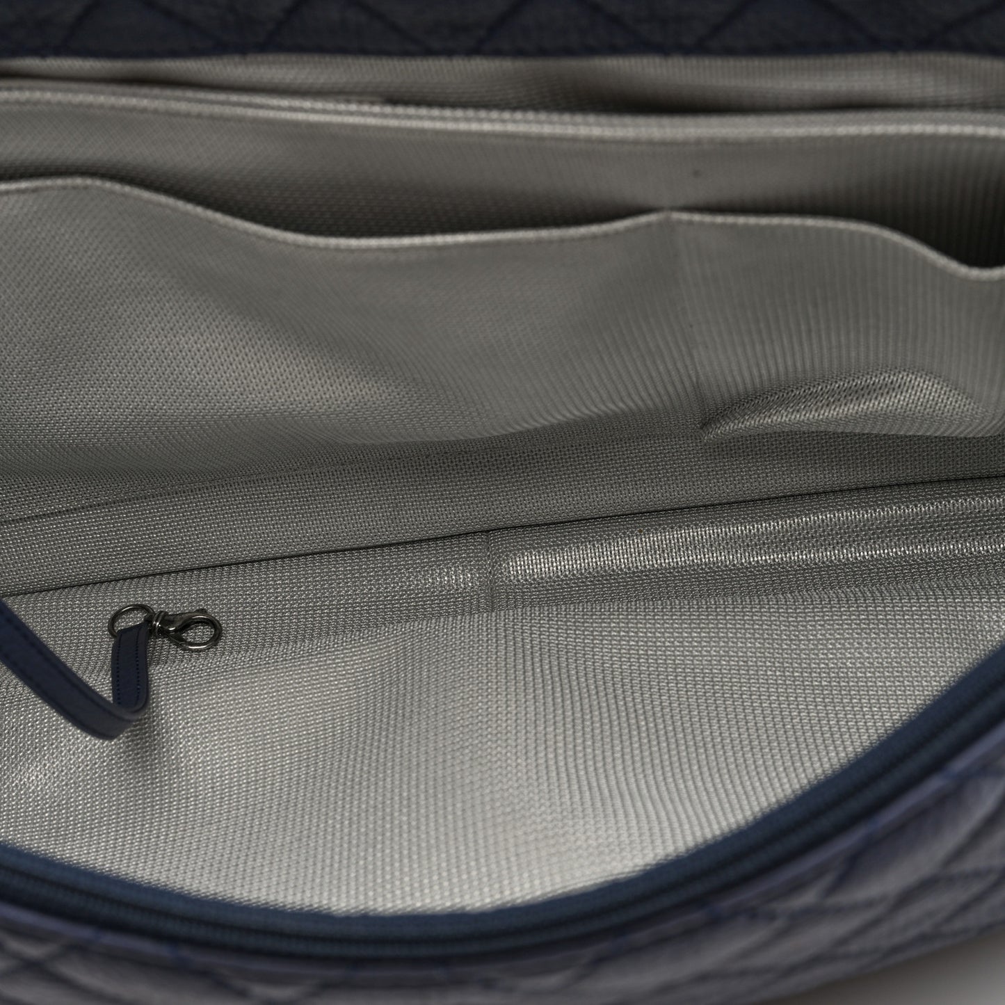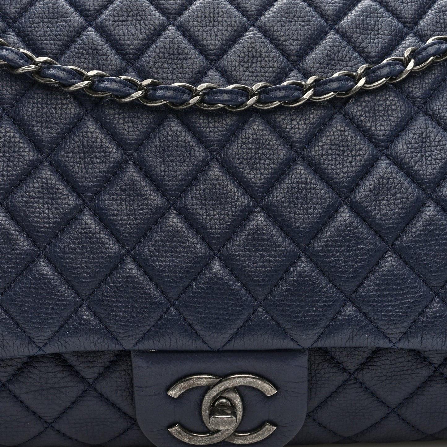 This is an authentic CHANEL Calfskin Quilted XXL Travel Flap Bag in Navy. This chic oversized flap is crafted of navy blue calfskin quilted leather. The shoulder bag features aged silver tone chain link shoulder straps threaded with blue leather and a thin shoulder pad. The front CC turn lock opens to a spacious silver interior with two large compartments and a front zipper compartment.Follow this item for alerts. Chanel is a registered trademark of Chanel. FASHIONPHILE is not affiliated with Chanel.