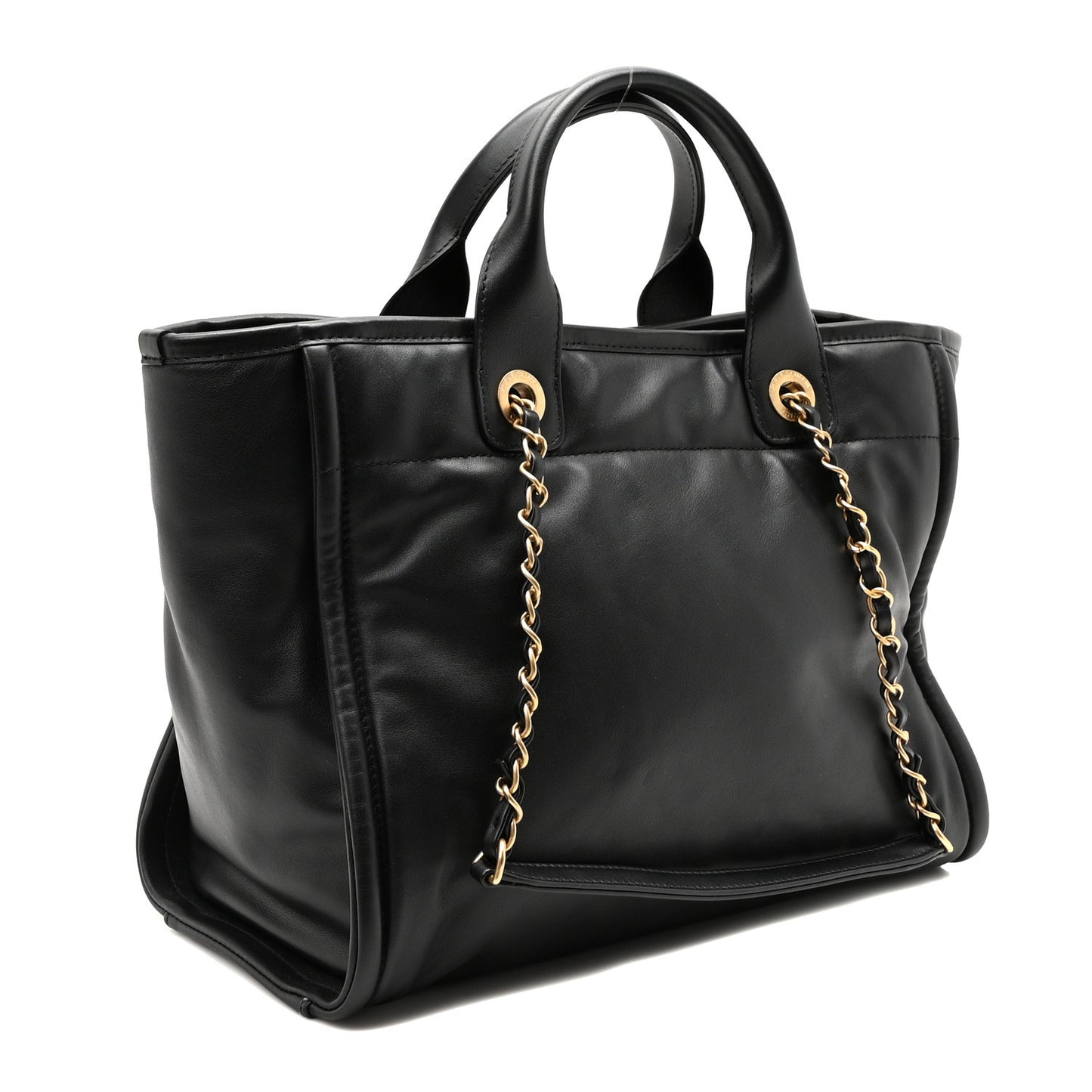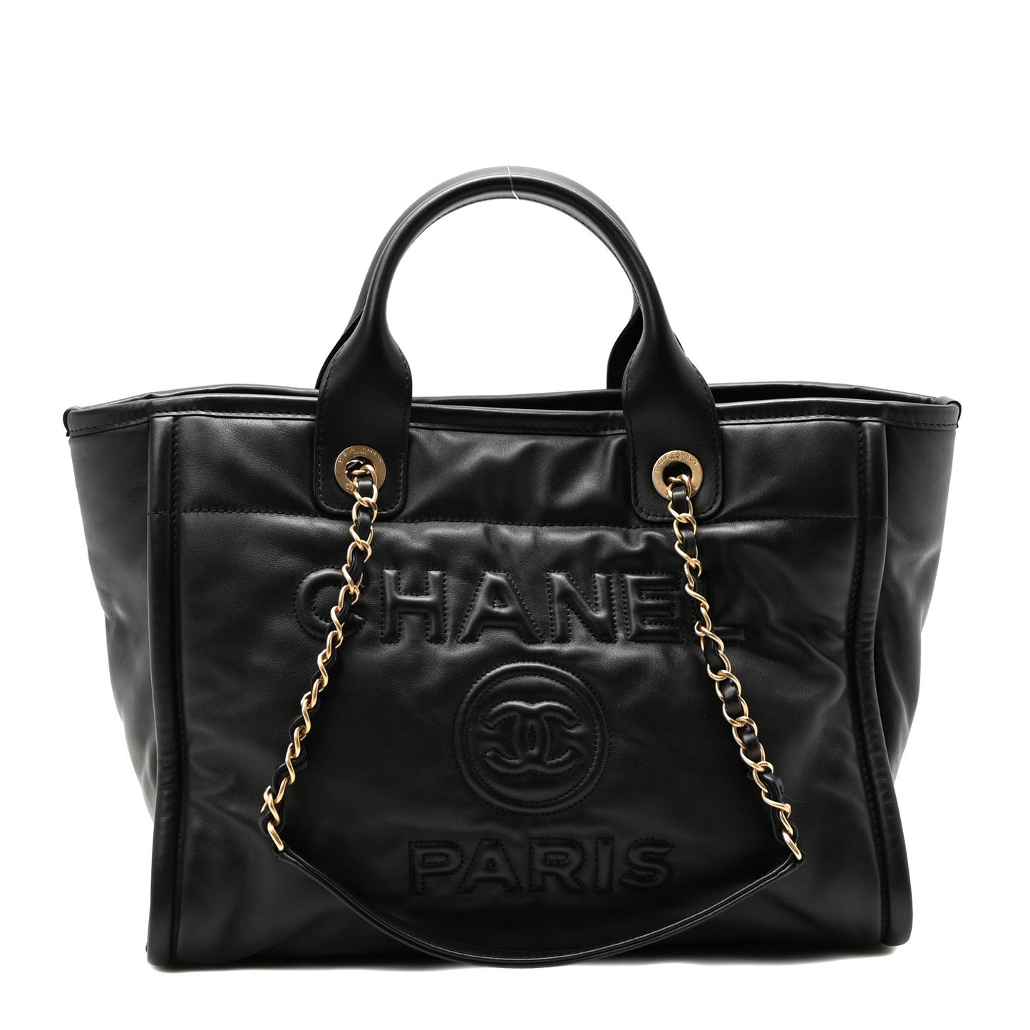 This is an authentic CHANEL Calfskin Small Deauville Tote in Black. This stylish handbag is crafted of calfskin leather in black, with a stitched Chanel advertisement logo on the front. The bag features black leather top handles and leather threaded aged gold chain-link shoulder straps. The top is open to a red fabric interior with zipper and patch pockets.Follow this item for alerts. Chanel is a registered trademark of Chanel. FASHIONPHILE is not affiliated with Chanel.