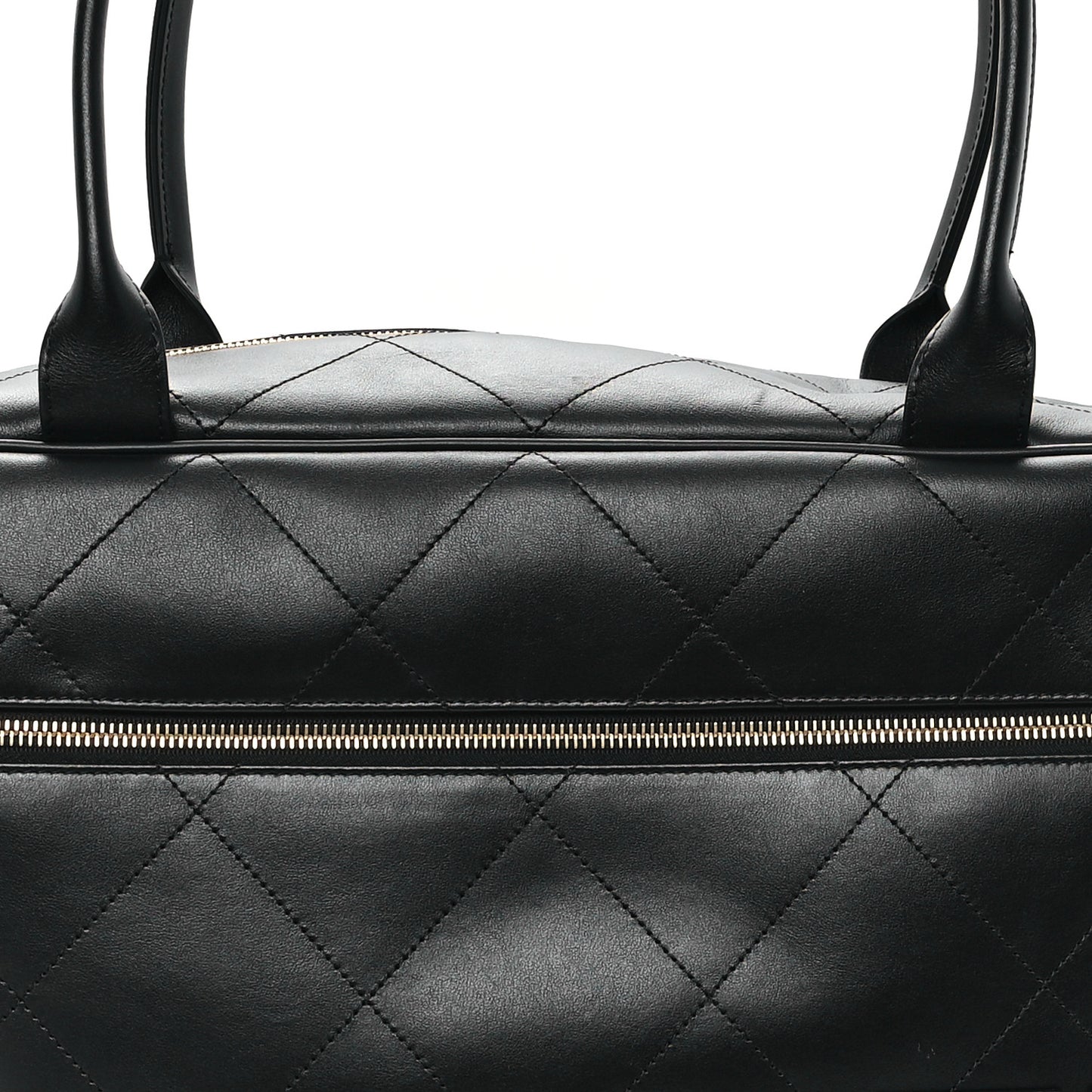 This is an authentic CHANEL Calfskin Quilted Logo Maxi Bowling Bag in Black. This travel bag is crafted of quilted black calfskin leather. The bag features rolled leather handles, matching black leather Chanel monogram and an aged gold Chanel CC logo medallion zipper pull on the front pocket. The top zipper opens to a blue fabric interior with zipper and 2 patch pockets.Follow this item for alerts. Chanel is a registered trademark of Chanel. FASHIONPHILE is not affiliated with Chanel.