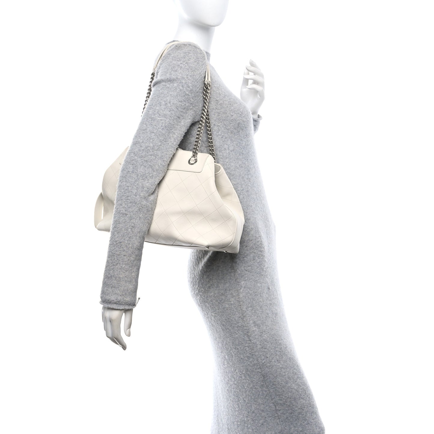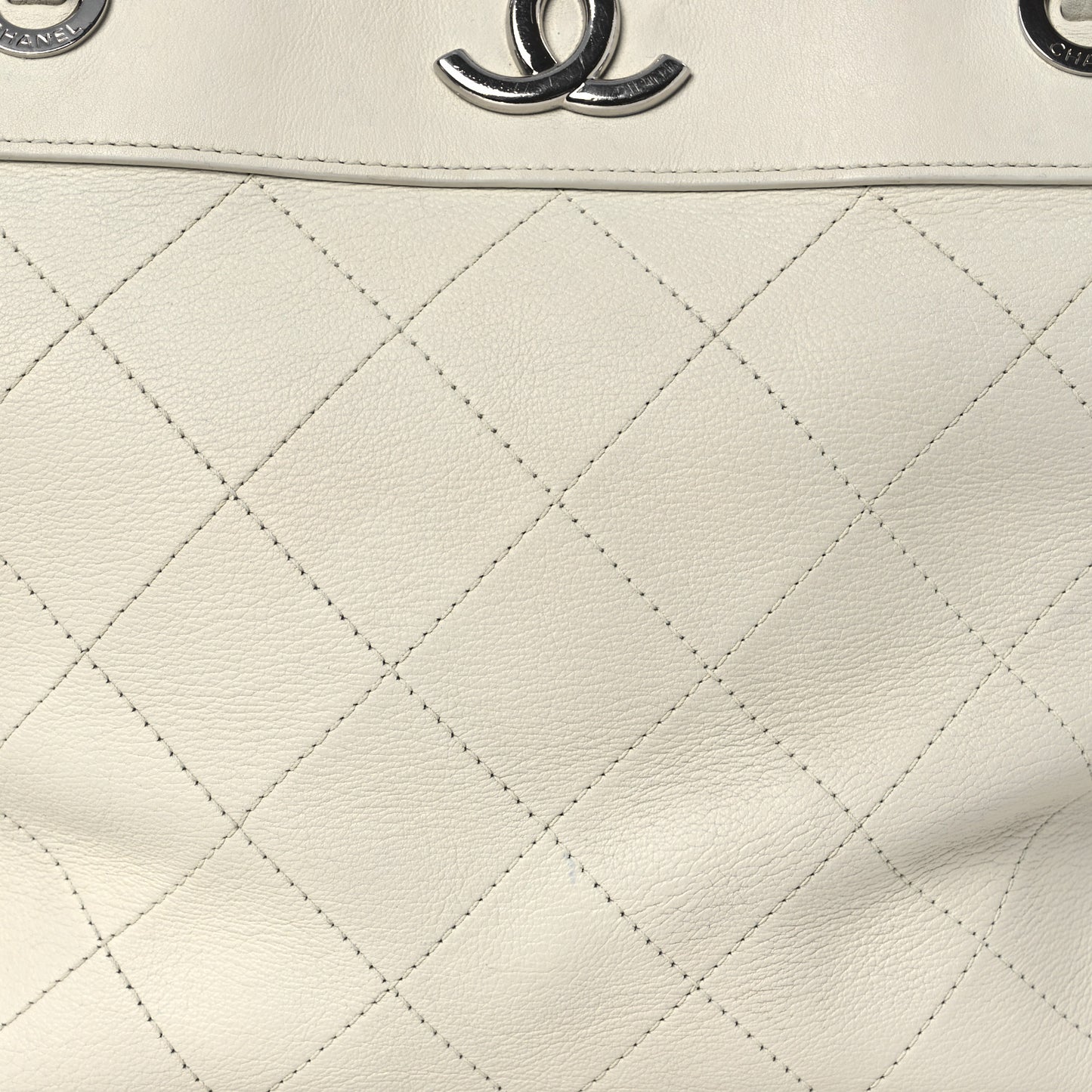 This an authentic CHANEL Calfskin Stitched Small Urban Shopping Tote in White. This stylish tote is crafted of luxurious diamond stitched calfskin leather in white. The bag features silver chain links with leather threaded leather, shoulder pads, and a silver Chanel CC logo on the front. The top is open to a beige fabric interior with zipper pockets.Follow this item for alerts. Chanel is a registered trademark of Chanel. FASHIONPHILE is not affiliated with Chanel.