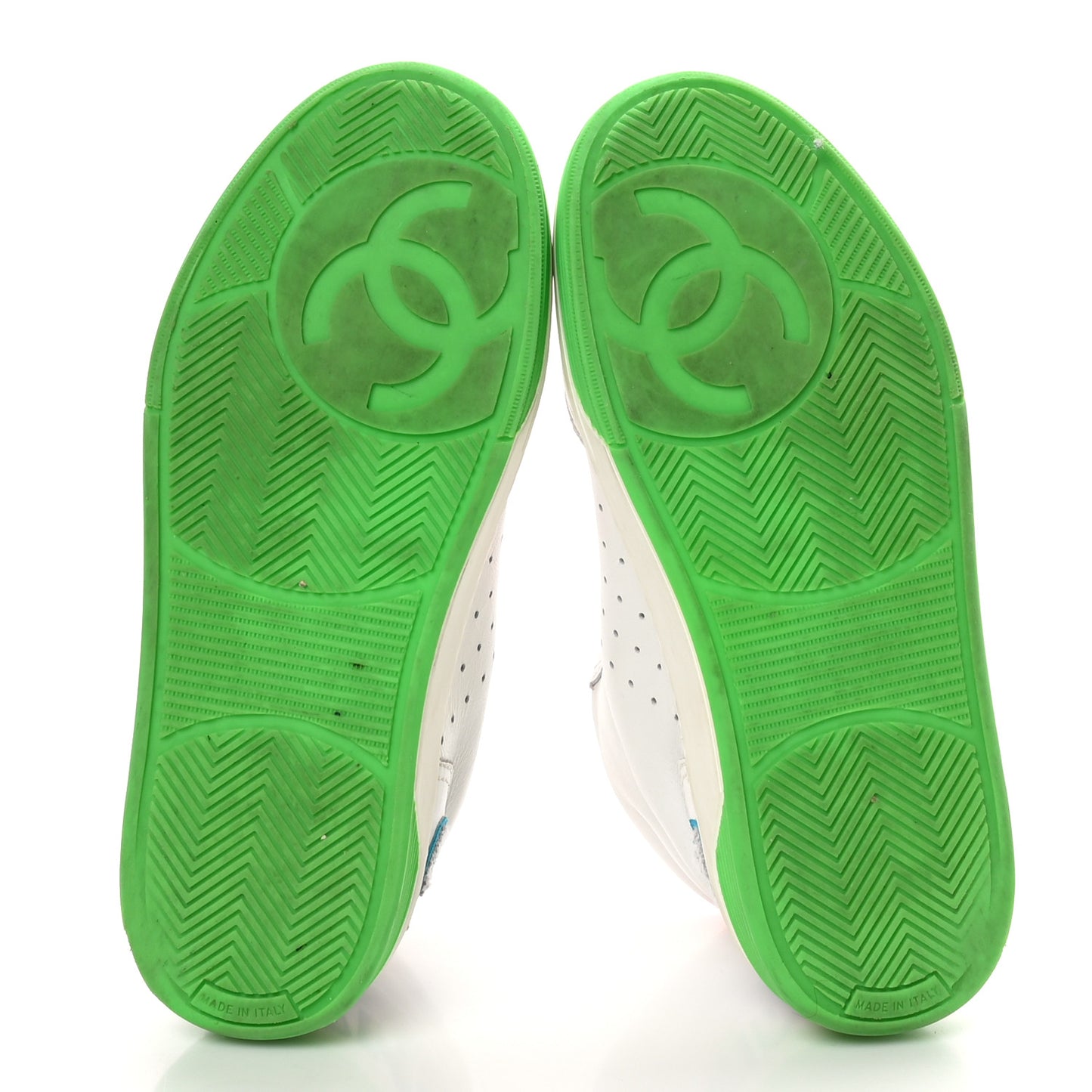 This is an authentic pair of CHANEL Calfskin Womens Logo High Top Sneakers size 35.5 in White and Multicolor. These stylish sneakers are crafted of white calfskin leather and a terry cloth CHANEL logo on the back with neon color accents.Follow this item for alerts. Chanel is a registered trademark of Chanel. FASHIONPHILE is not affiliated with Chanel.