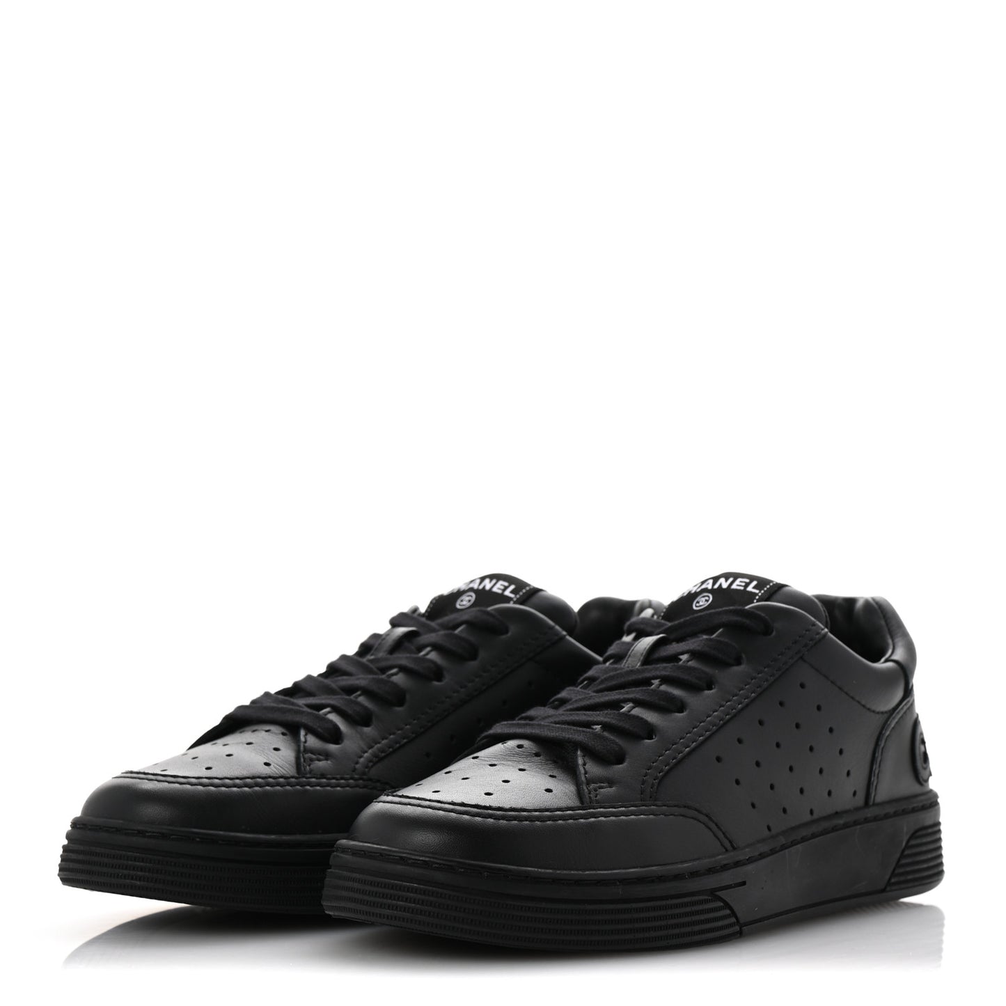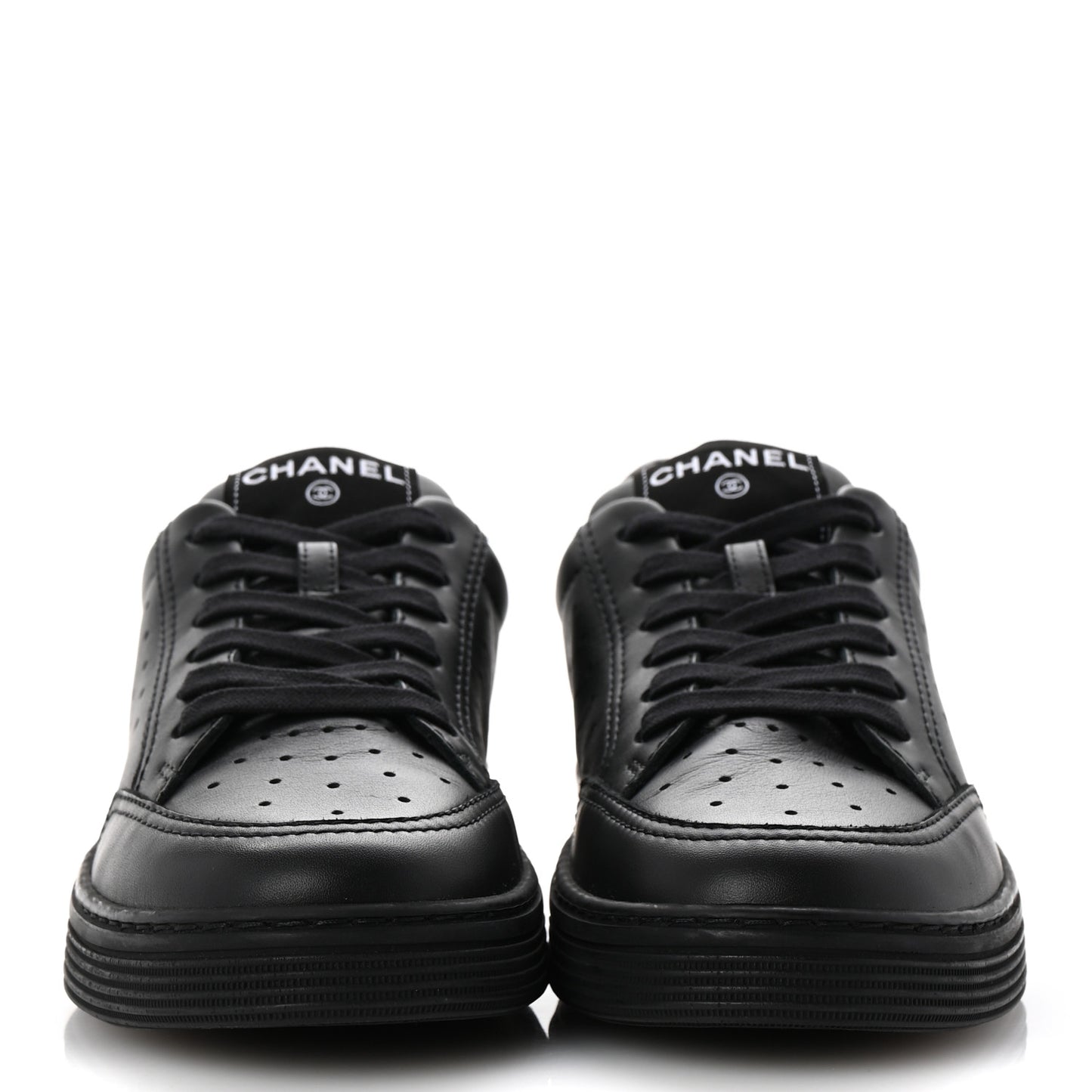 This is an authentic pair of CHANEL Calfskin Womens Logo Sneakers size 38.5 in Black. These stylish sneakers are crafted of calfskin leather in black with a black CC logo and laces.Follow this item for alerts. Chanel is a registered trademark of Chanel. FASHIONPHILE is not affiliated with Chanel.