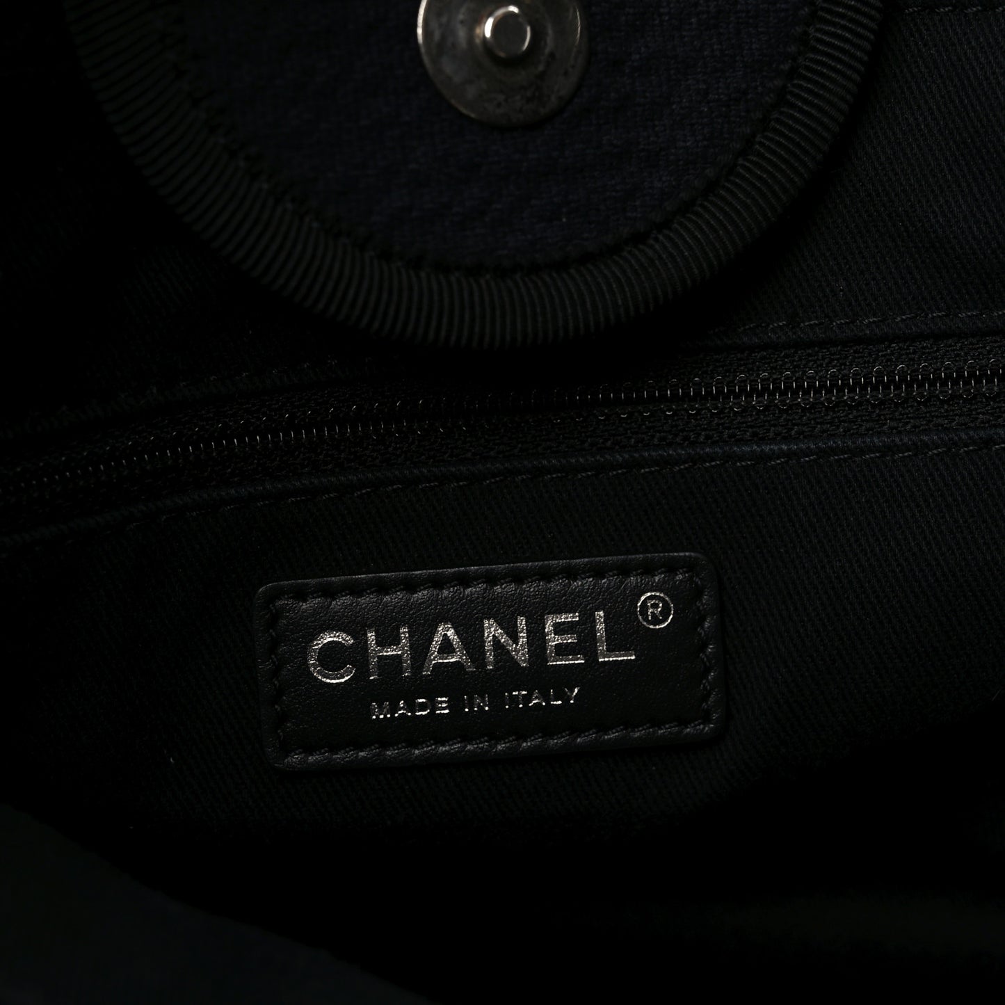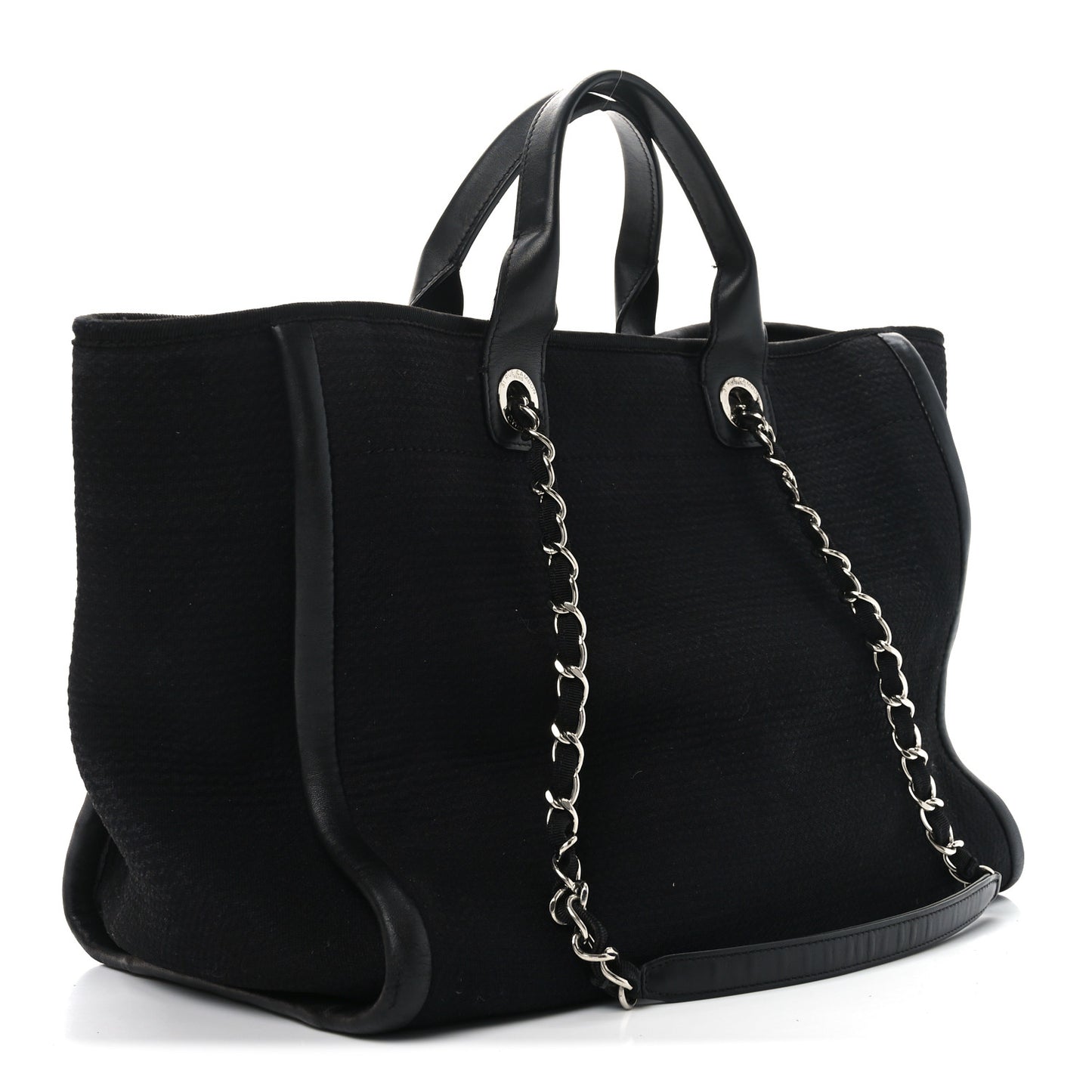 This is an authentic CHANEL Canvas Medium Deauville Tote in Black. This tote is crafted of black canvas and silver hardware. The top opens to a black fabric interior with a zipper pocket and patch pockets.Follow this item for alerts. Chanel is a registered trademark of Chanel. FASHIONPHILE is not affiliated with Chanel.