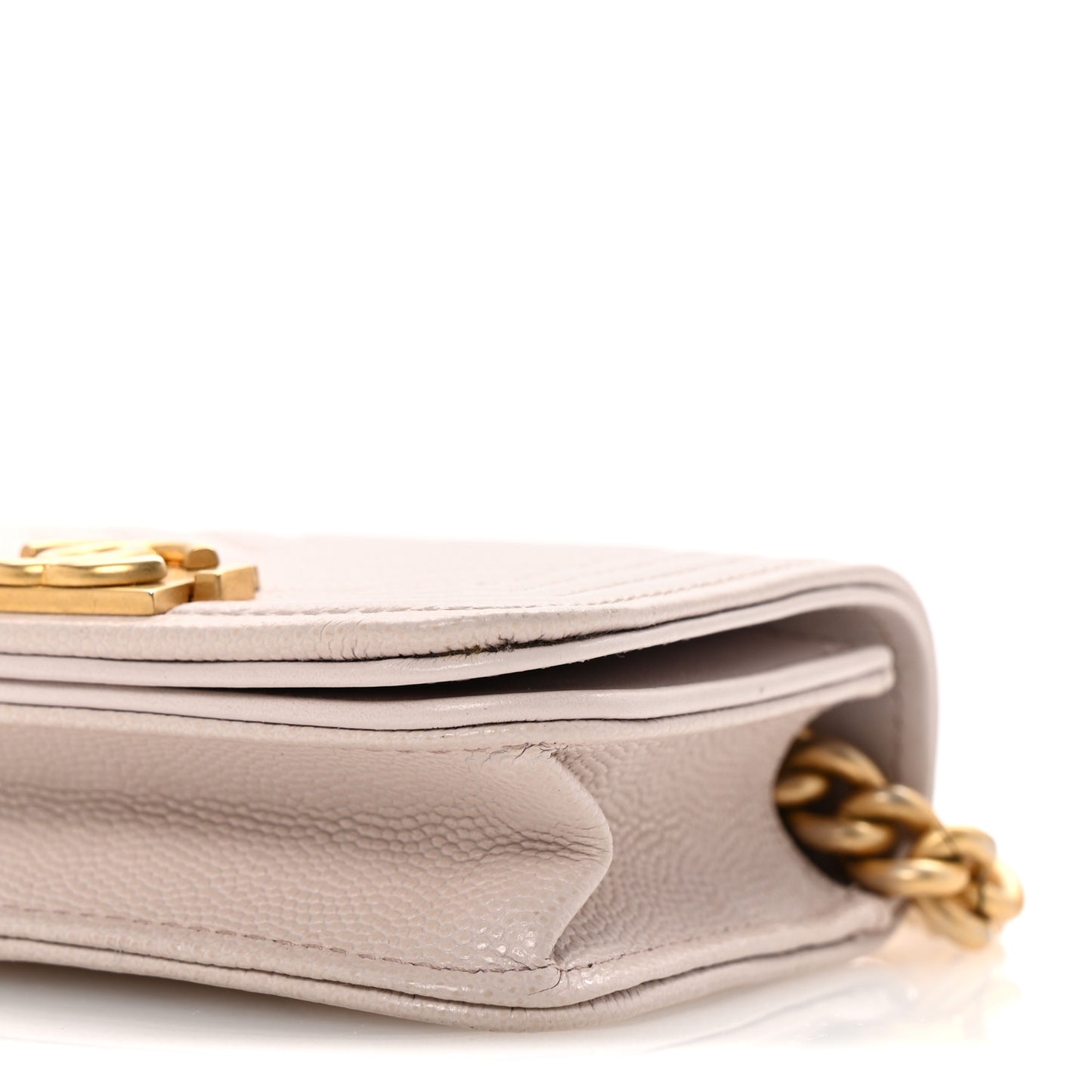 This is an authentic CHANEL Caviar Chevron Boy Flap Waist Belt Bag in Light Purple. This chic belt bag is crafted of calfskin leather in light purple. The bag features an embroidered chevron print with gold tone chain accents. It has an aged gold chain link strap with leather and an aged gold CC boy push lock. This opens to a matching fabric interior.Follow this item for alerts. Chanel is a registered trademark of Chanel. FASHIONPHILE is not affiliated with Chanel.