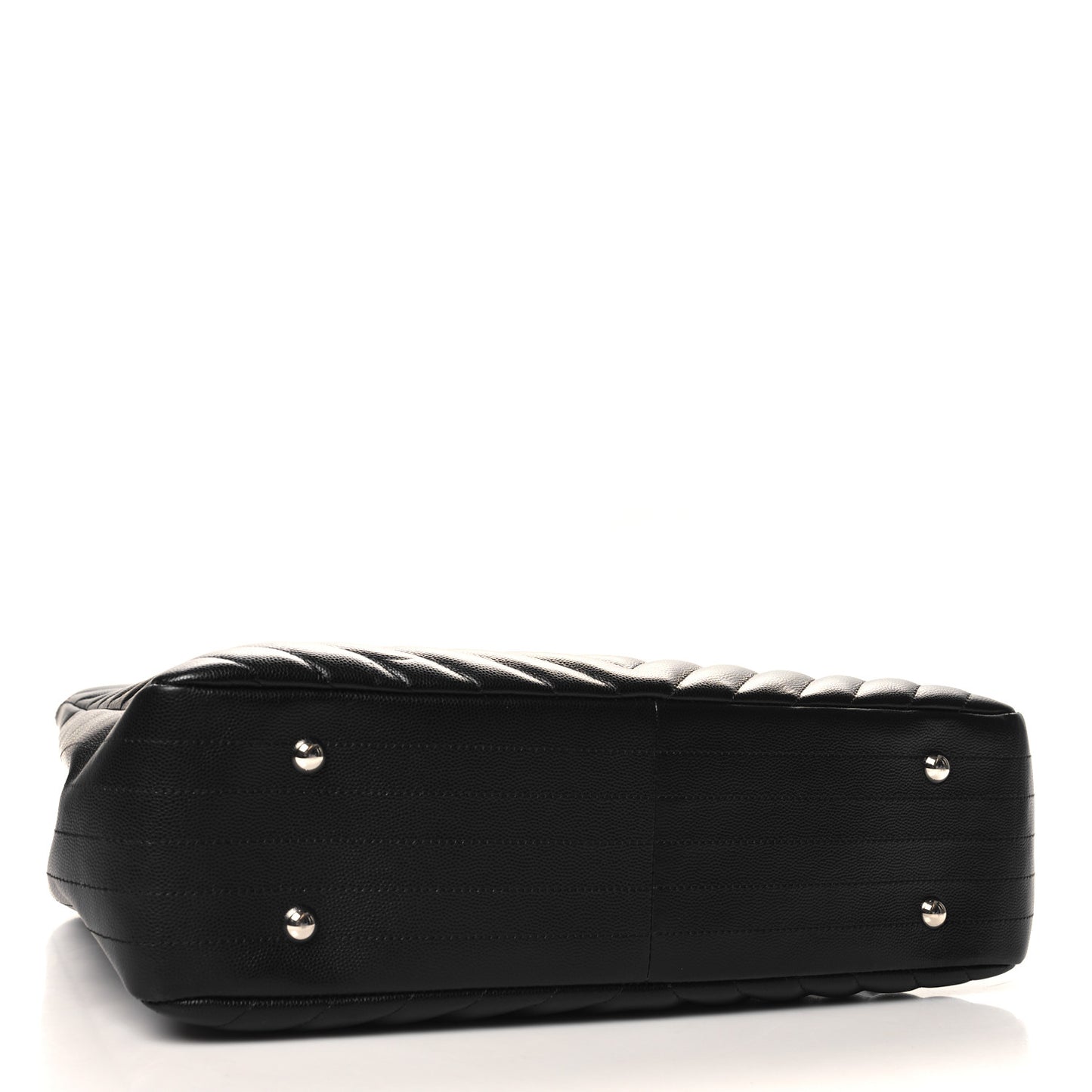 This is an authentic CHANEL Caviar Chevron Quilted Large Shopping Tote in Black. This handbag is crafted of diamond quilted black caviar leather. This tote features polished silver leather threaded chain shoulder straps with shoulder pads, and a polished silver Chanel CC logo on the front, a flat pocket on the back.Follow this item for alerts. Chanel is a registered trademark of Chanel. FASHIONPHILE is not affiliated with Chanel.