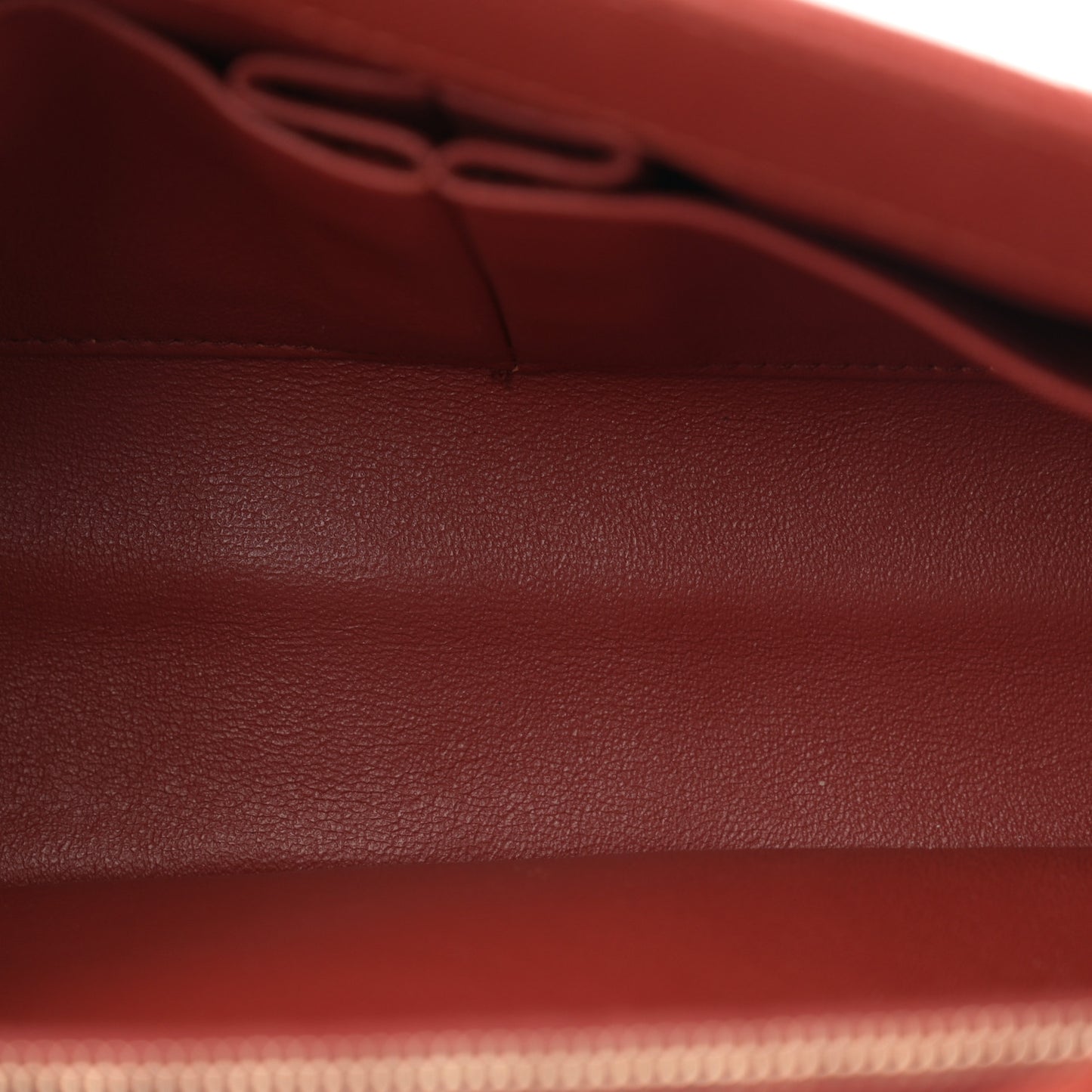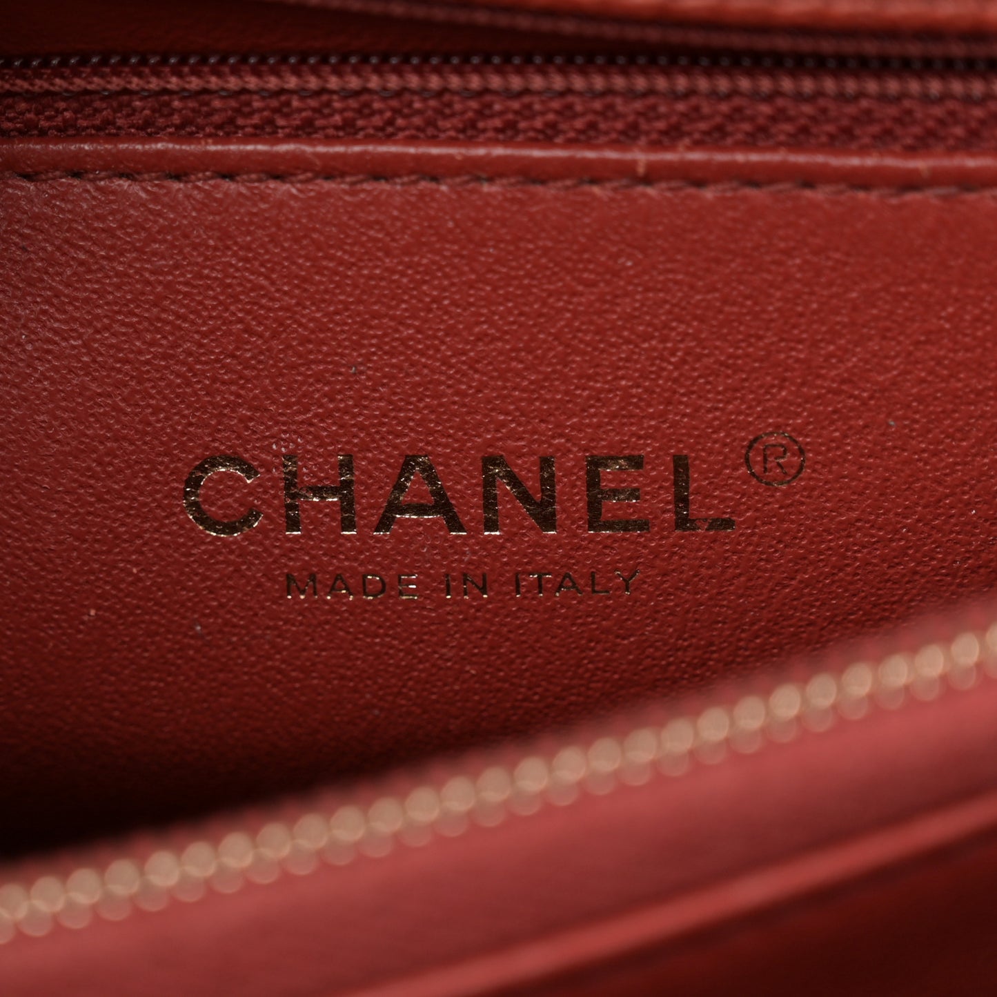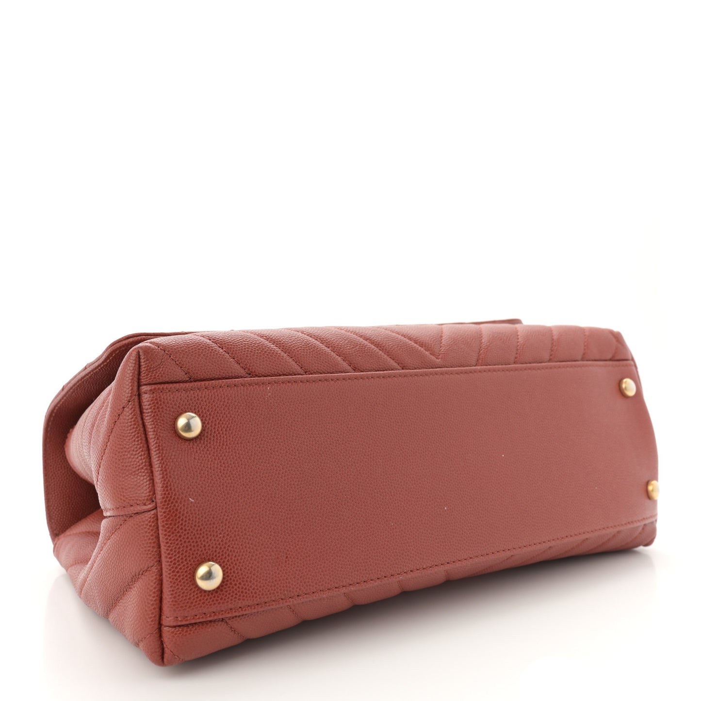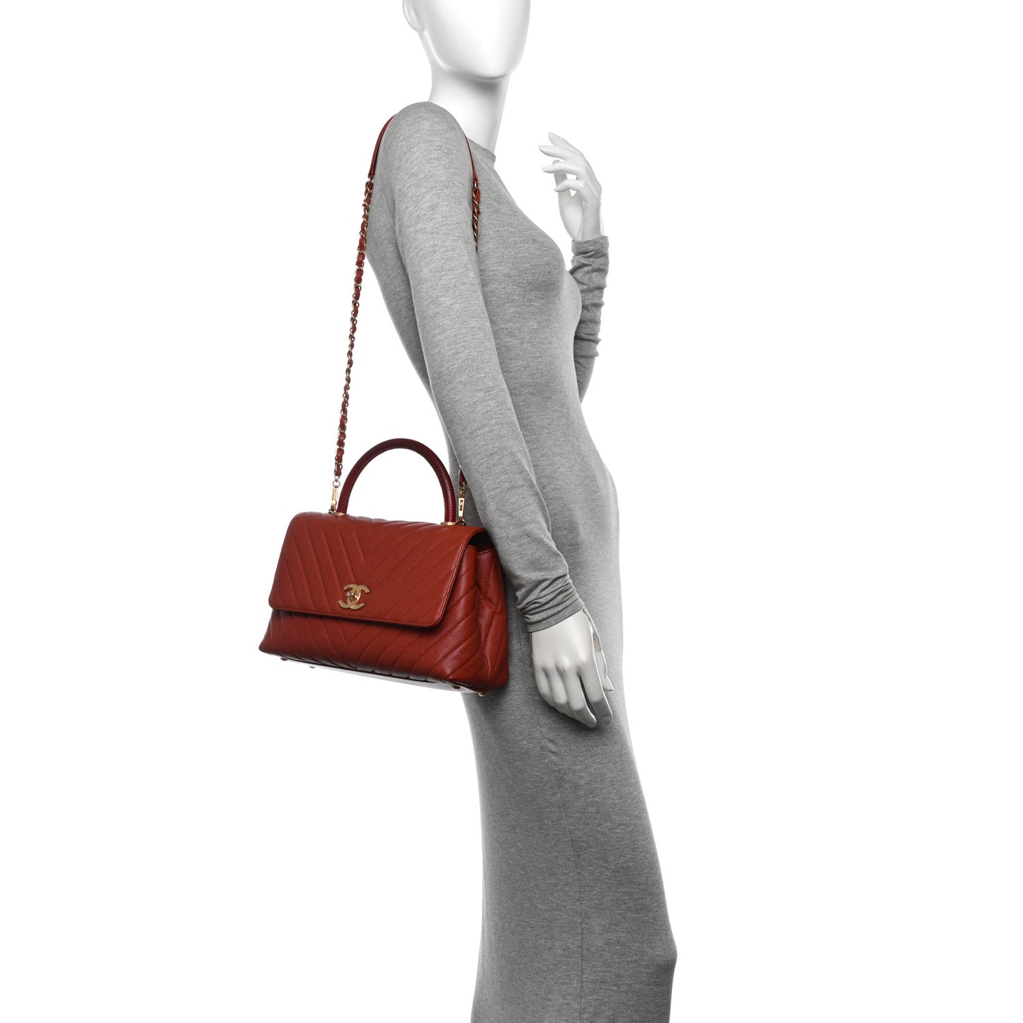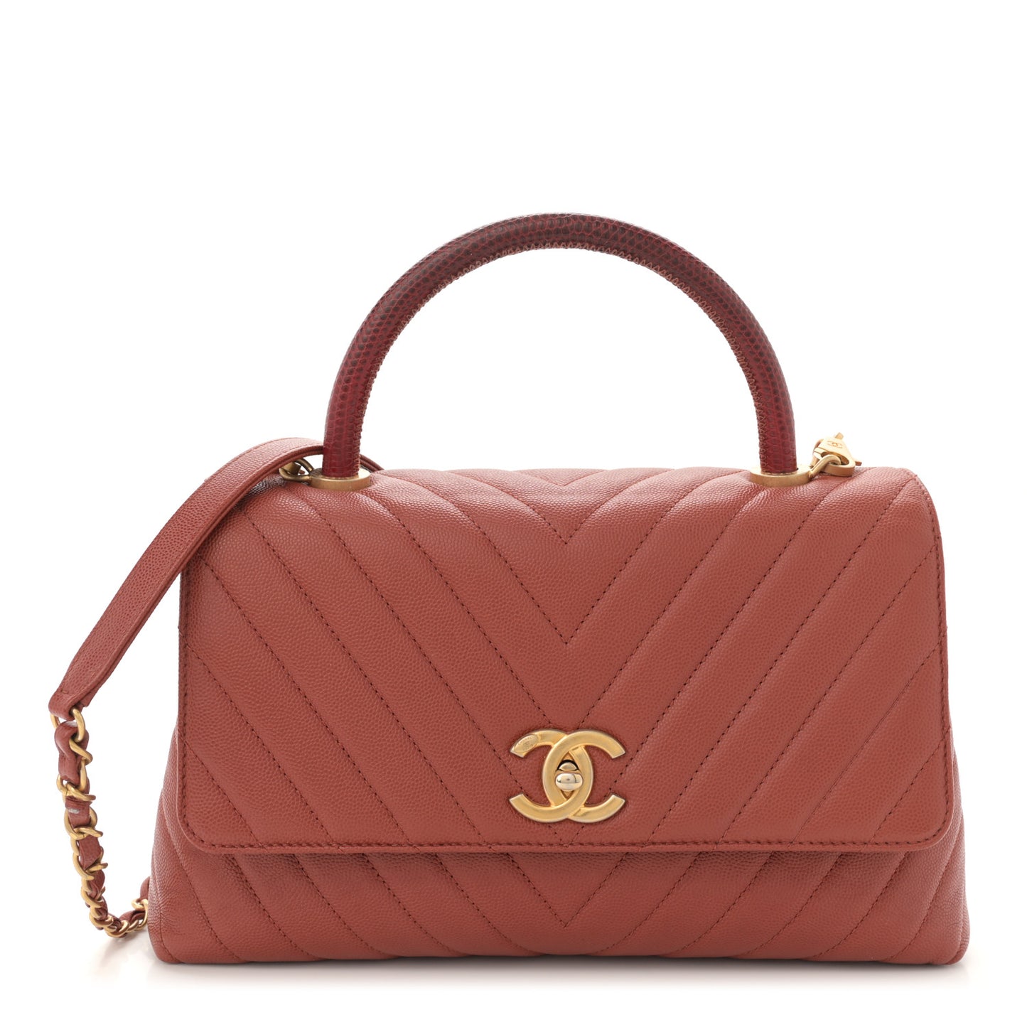 This is an authentic CHANEL Caviar Lizard Chevron Quilted Small Coco Handle Flap in Dark Orange. This sleek classic tote is crafted of chevron stitched grained caviar calfskin leather in deep orange. The shoulder bag features an orange lizard top handle, a leather threaded aged gold shoulder strap with a shoulder pad, and an aged gold CC turn lock closure. This opens the flap to a partitioned leather interior with zipper and patch pockets and a central zipper compartment.Follow this item for alerts. Chanel is a registered trademark of Chanel. FASHIONPHILE is not affiliated with Chanel.