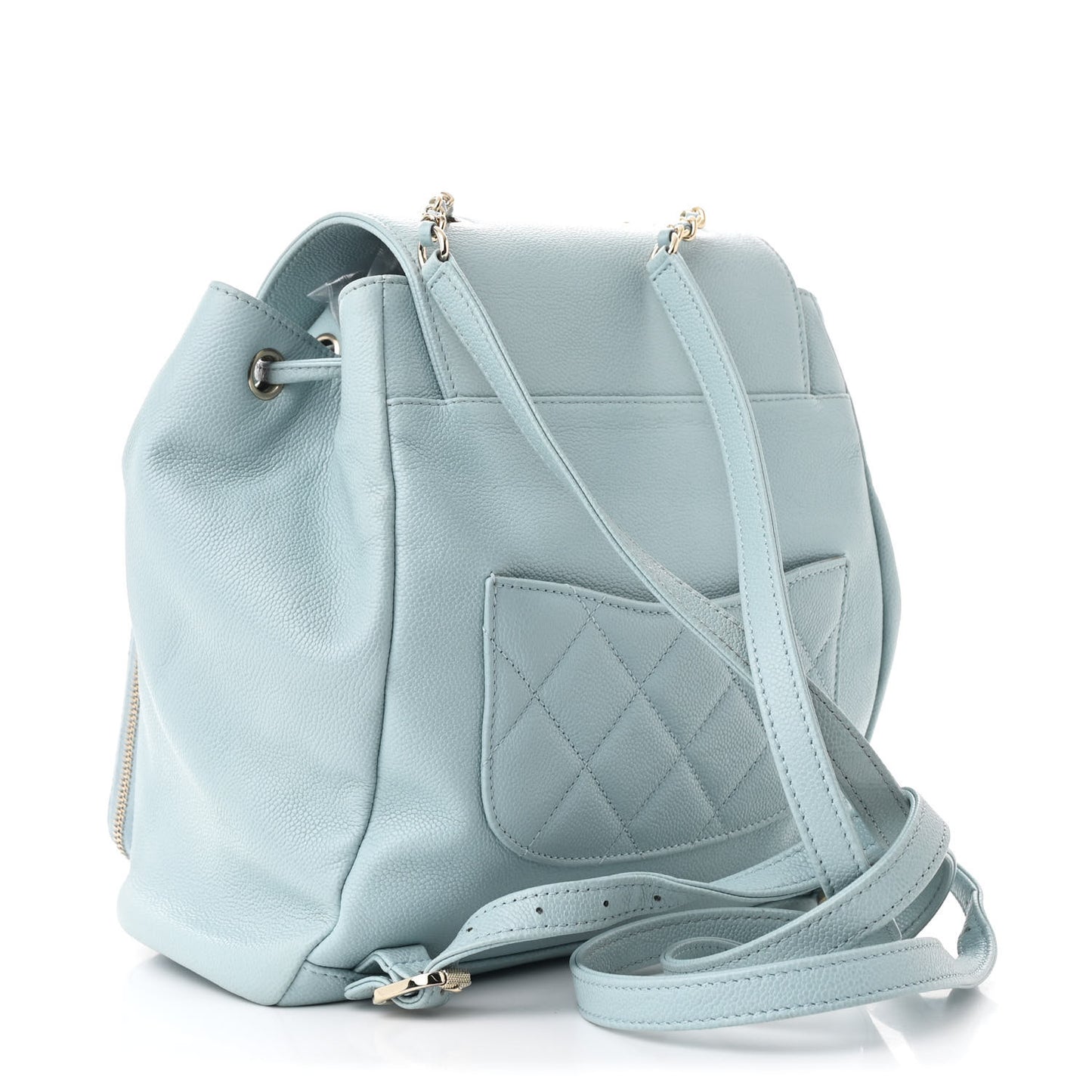 This is an authentic CHANEL Caviar Quilted Business Affinity Backpack in Light Blue. This stylish backpack is beautifully crafted of blue caviar leather. It features polished gold hardware, adjustable leather straps, a cinch cord, and an external zipper pocket. The facing flap has a polished gold Chanel CC turn lock. This opens to a spacious fabric interior with a zipper pocket.Follow this item for alerts. Chanel is a registered trademark of Chanel. FASHIONPHILE is not affiliated with Chanel.