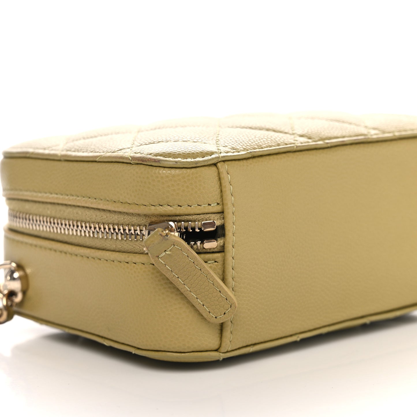 This is an authentic CHANEL Caviar Quilted Camera Bag in Green. This chic shoulder bag is finely crafted of luxurious diamond quilted caviar leather in green. The bag features a leather-threaded gold chain shoulder strap and a gold Chanel CC symbol on the front. The top zipper opens to a matching partitioned leather and fabric interior with card slots.Follow this item for alerts. Chanel is a registered trademark of Chanel. FASHIONPHILE is not affiliated with Chanel.
