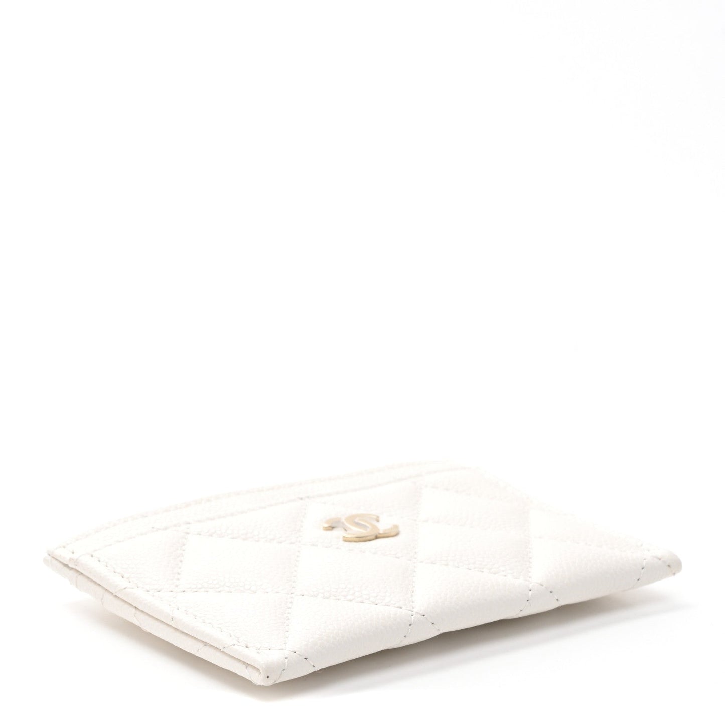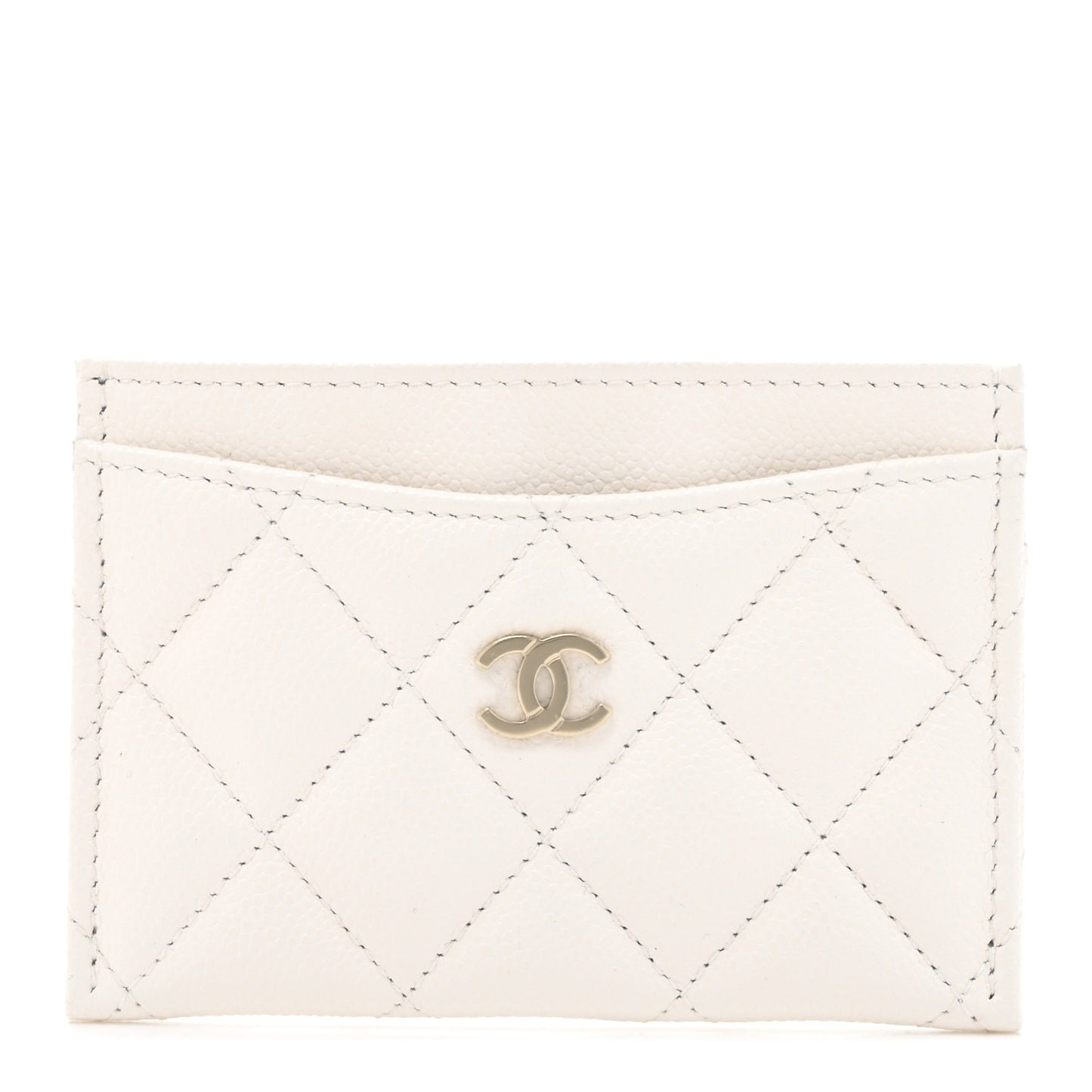 This is an authentic CHANEL Caviar Quilted Card Holder in White. This simple and very chic card holder is crafted of luxurious white caviar leather. It features a polished light gold Chanel CC logo and the card slots on either side of the main compartment open to an all white fabric interior.Follow this item for alerts. Chanel is a registered trademark of Chanel. FASHIONPHILE is not affiliated with Chanel.