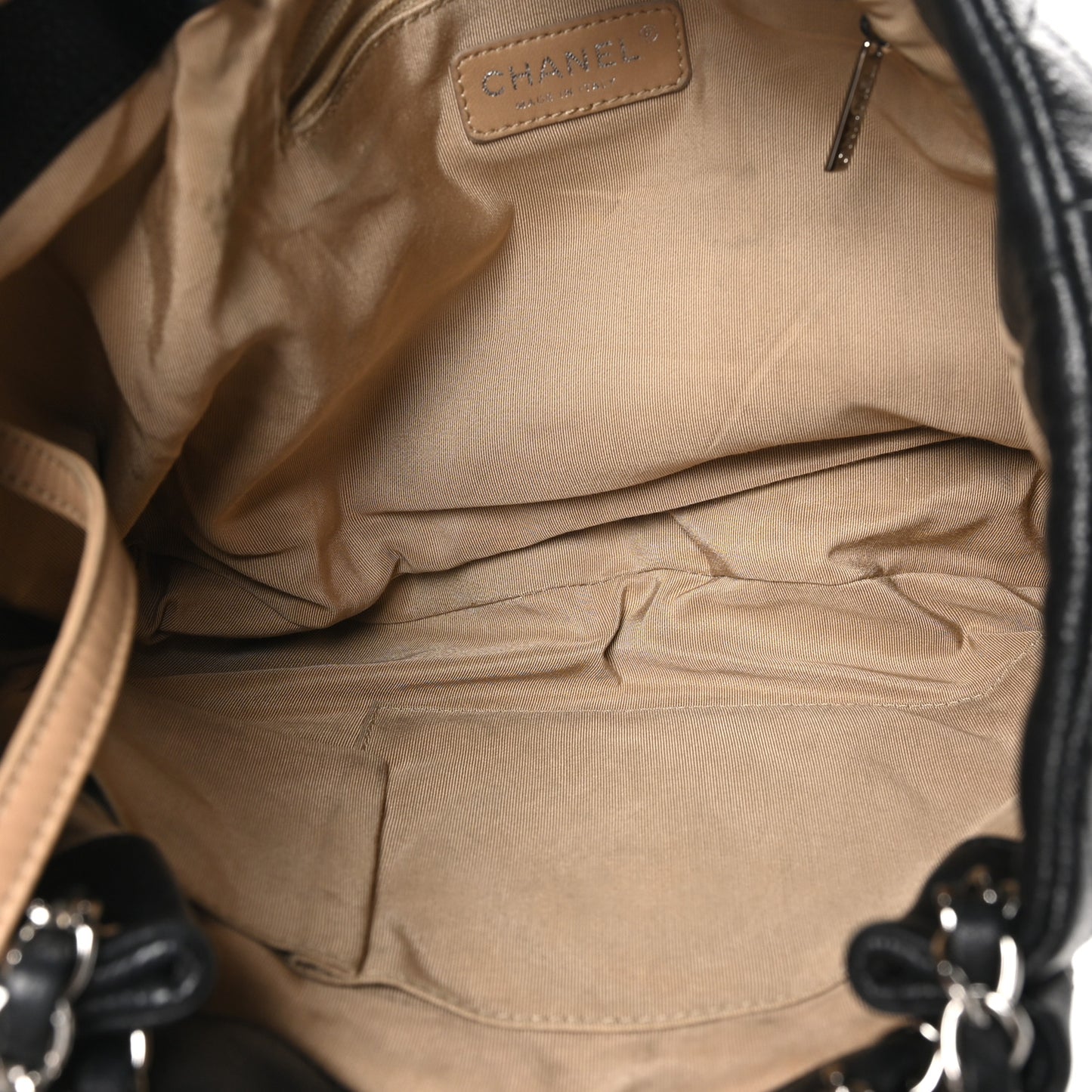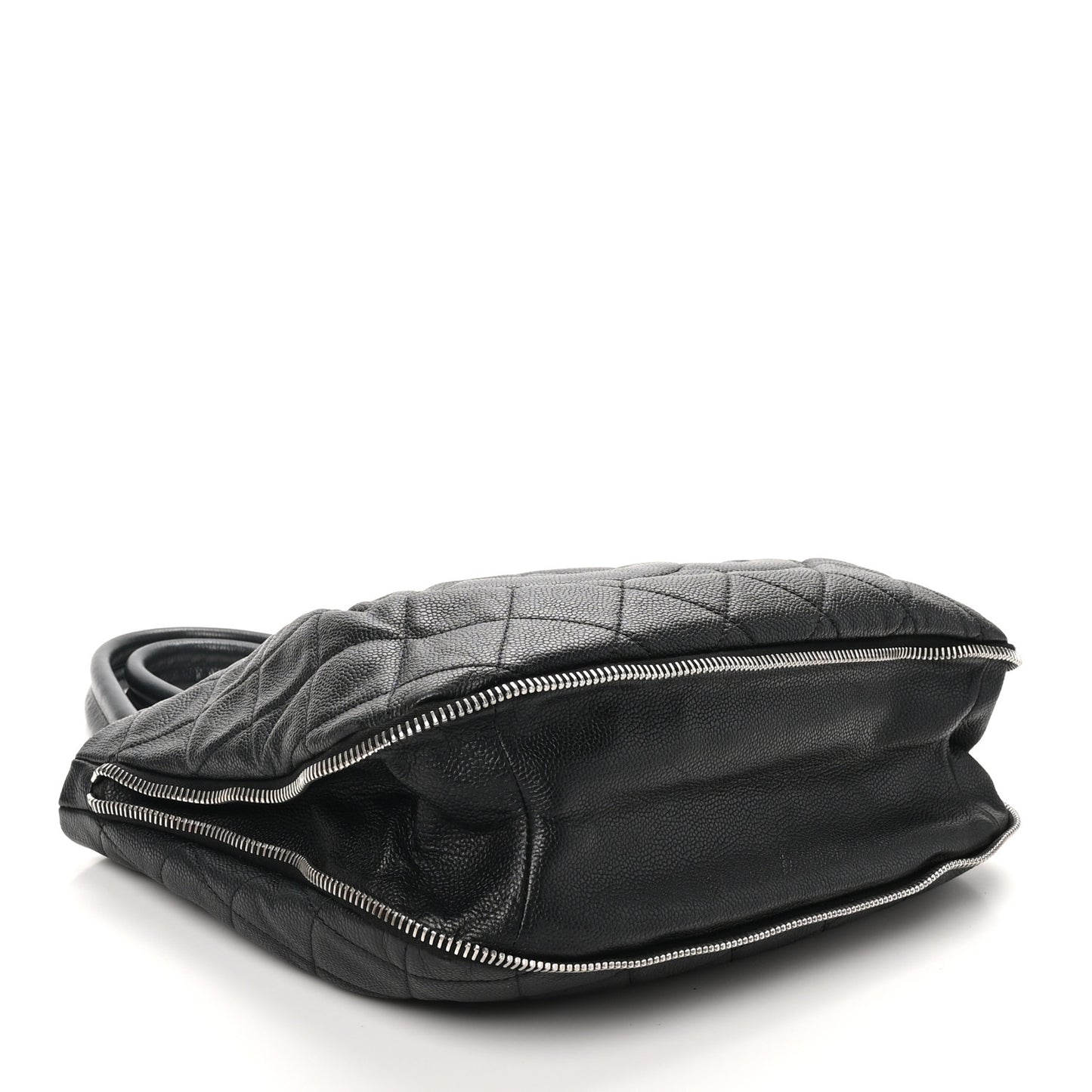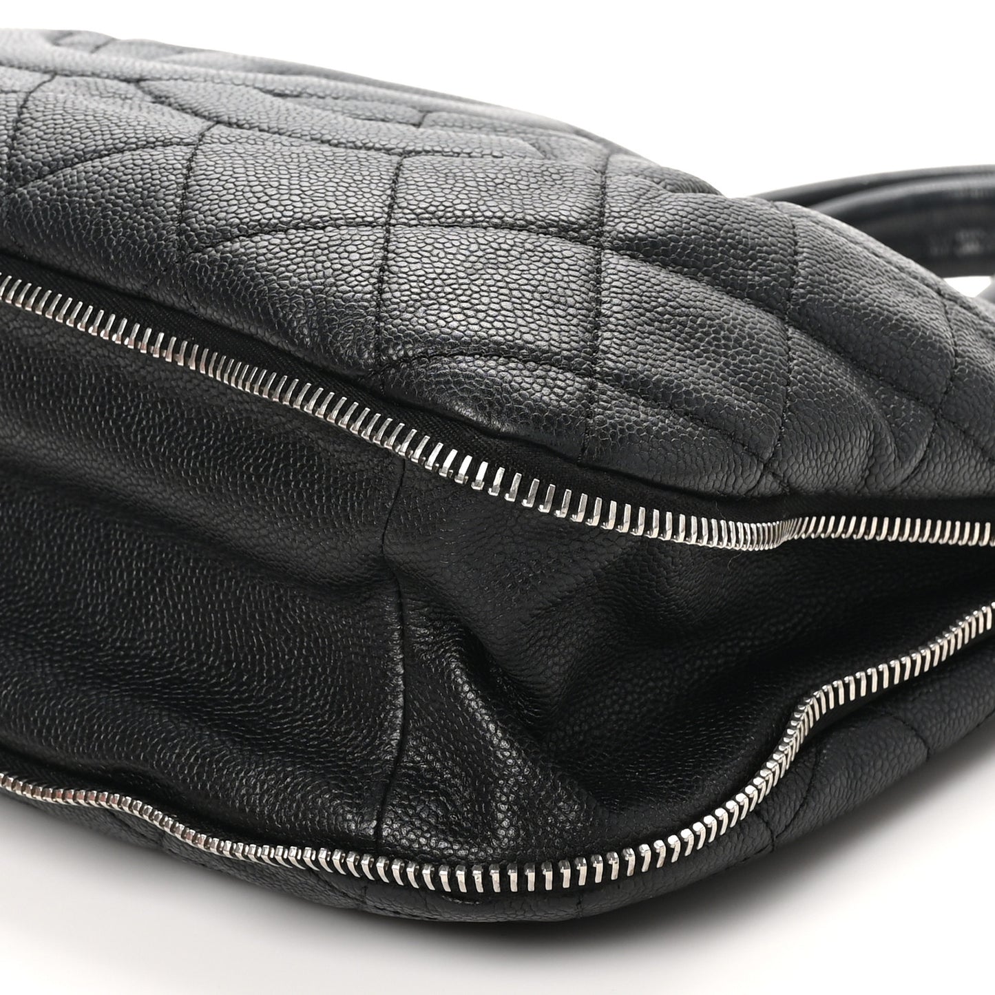This is an authentic CHANEL Caviar Quilted CC Zip Around Shoulder Bag in Black. This chic shoulder bag is crafted of quilted calfskin leather in black. It features an expandable base, canvas and leather shoulder strap, silver hardware, and a black rubber CC logo. The bag has an open top and a beige fabric interior with zipper and patch pockets.Follow this item for alerts. Chanel is a registered trademark of Chanel. FASHIONPHILE is not affiliated with Chanel.