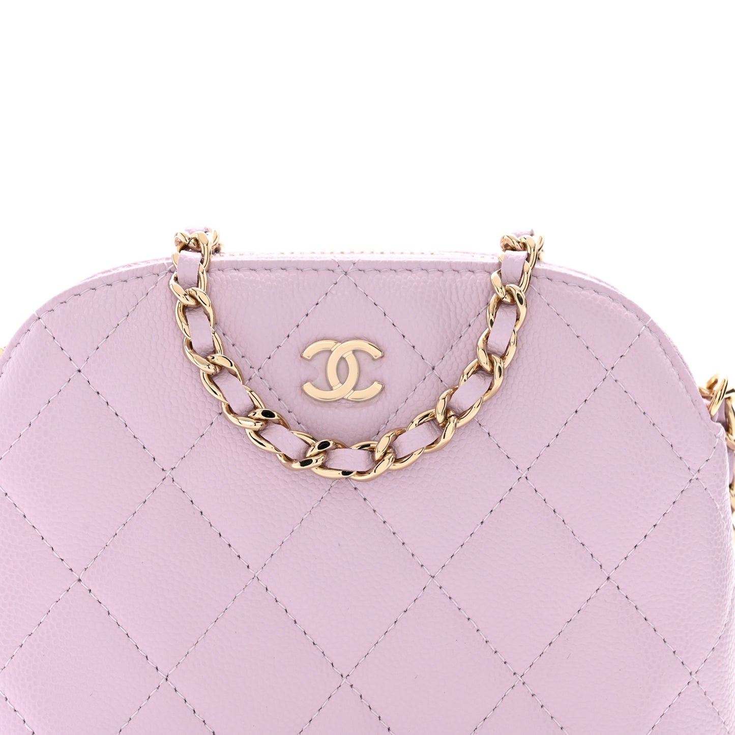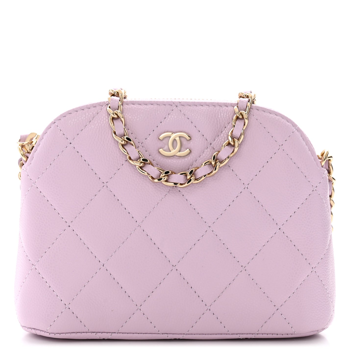 This is an authentic CHANEL Caviar Quilted Clutch With Chain in Light Purple. This chic shoulder bag is finely crafted of luxurious diamond quilted caviar leather in light purple. The bag features a leather-threaded gold chain shoulder strap and a gold Chanel CC symbol on the front. The top zipper opens to a black graphic CC fabric interior with a card slot.Follow this item for alerts. Chanel is a registered trademark of Chanel. FASHIONPHILE is not affiliated with Chanel.