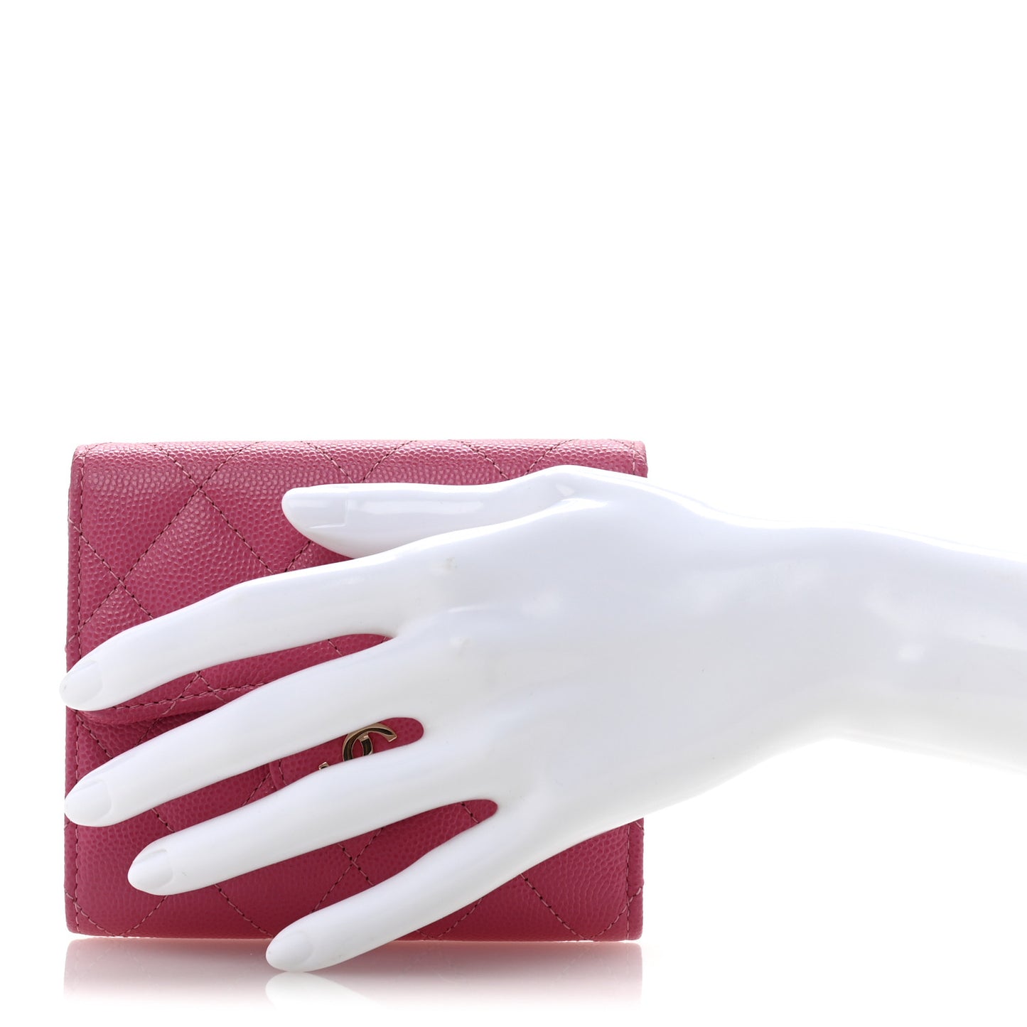 This is an authentic CHANEL Caviar Quilted Compact Flap Wallet in Pink. This stylish wallet is crafted of diamond-quilted caviar leather in pink. The crossover flap features a polished light gold CC logo and opens to a leather interior with card slots, patch patch pockets, and billfolds.Follow this item for alerts. Chanel is a registered trademark of Chanel. FASHIONPHILE is not affiliated with Chanel.