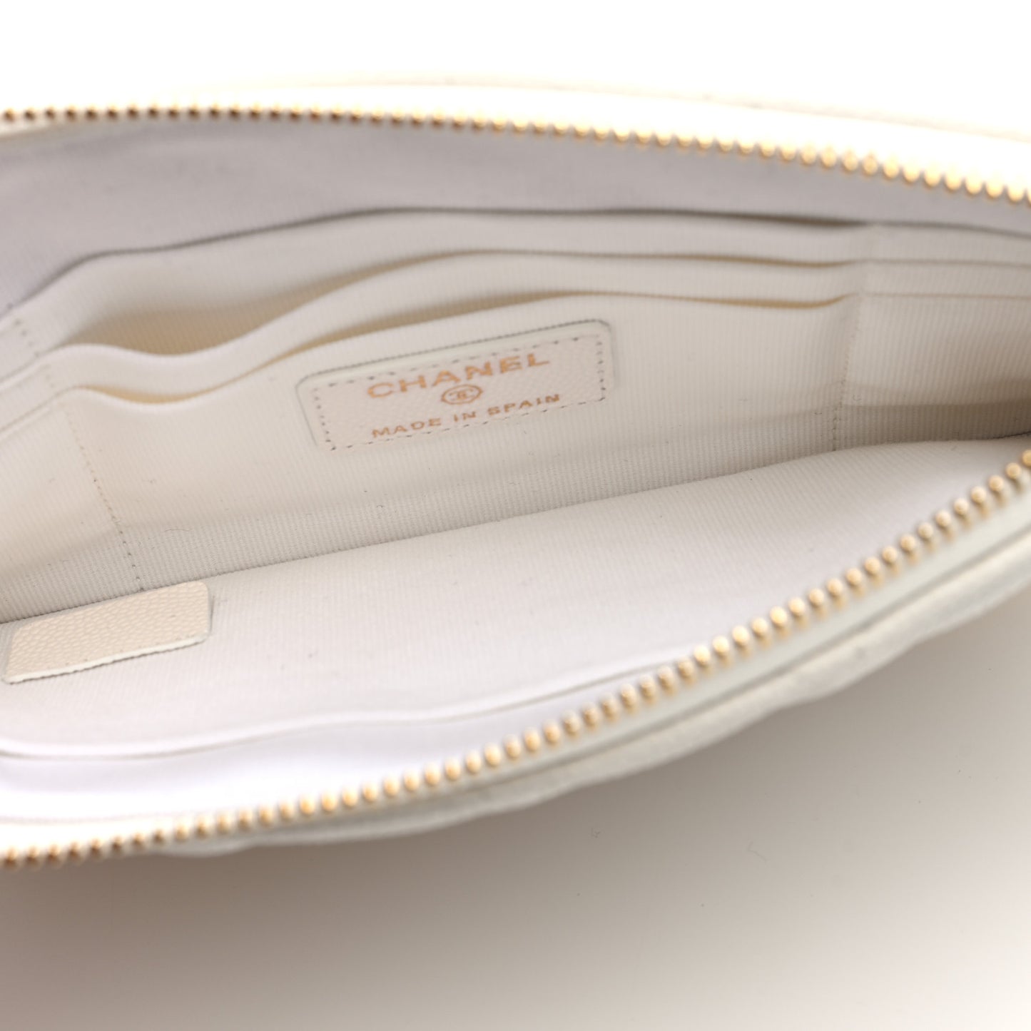 This is an authentic CHANEL Caviar Quilted Cosmetic Case in White. This chic pouch is crafted of diamond quilted caviar leather in white, with a small gold Chanel CC logo on the front. The top zipper opens to a matching fabric interior with card slots and a patch pocket.Follow this item for alerts. Chanel is a registered trademark of Chanel. FASHIONPHILE is not affiliated with Chanel.