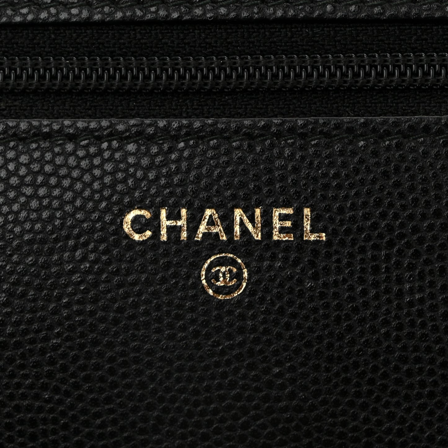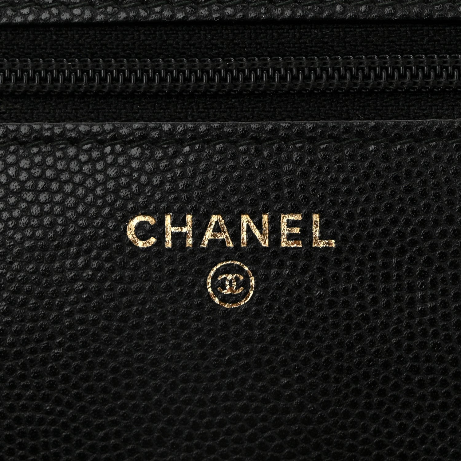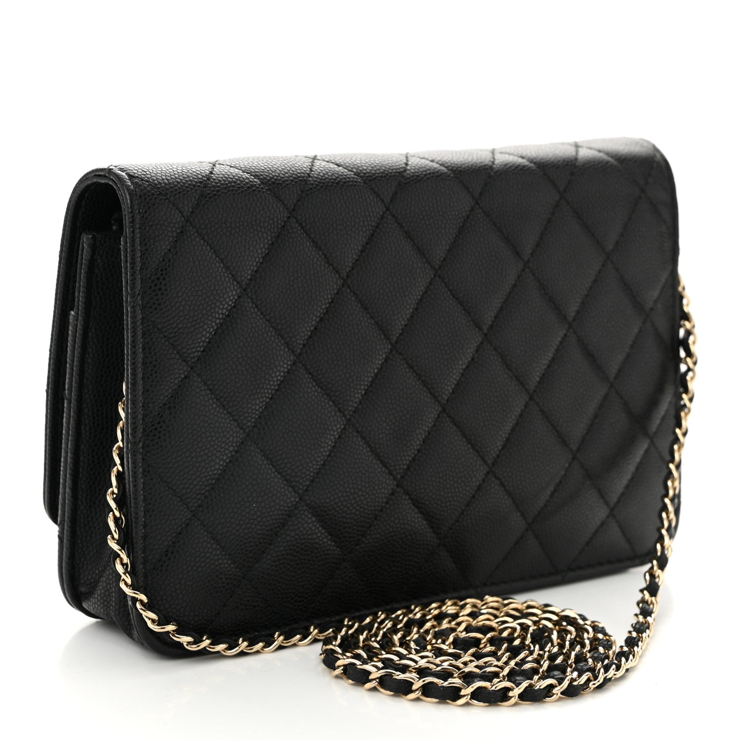 This is an authentic CHANEL Caviar Quilted Golden Class Wallet On Chain WOC in Black. This stylish shoulder bag is crafted of diamond quilted caviar leather in black. It features a leather threaded gold chain shoulder strap and a gold CC clasp on the front. The flap opens to a black leather and fabric interior with card slots, a flat pocket, and a zipper compartment.Follow this item for alerts. Chanel is a registered trademark of Chanel. FASHIONPHILE is not affiliated with Chanel.