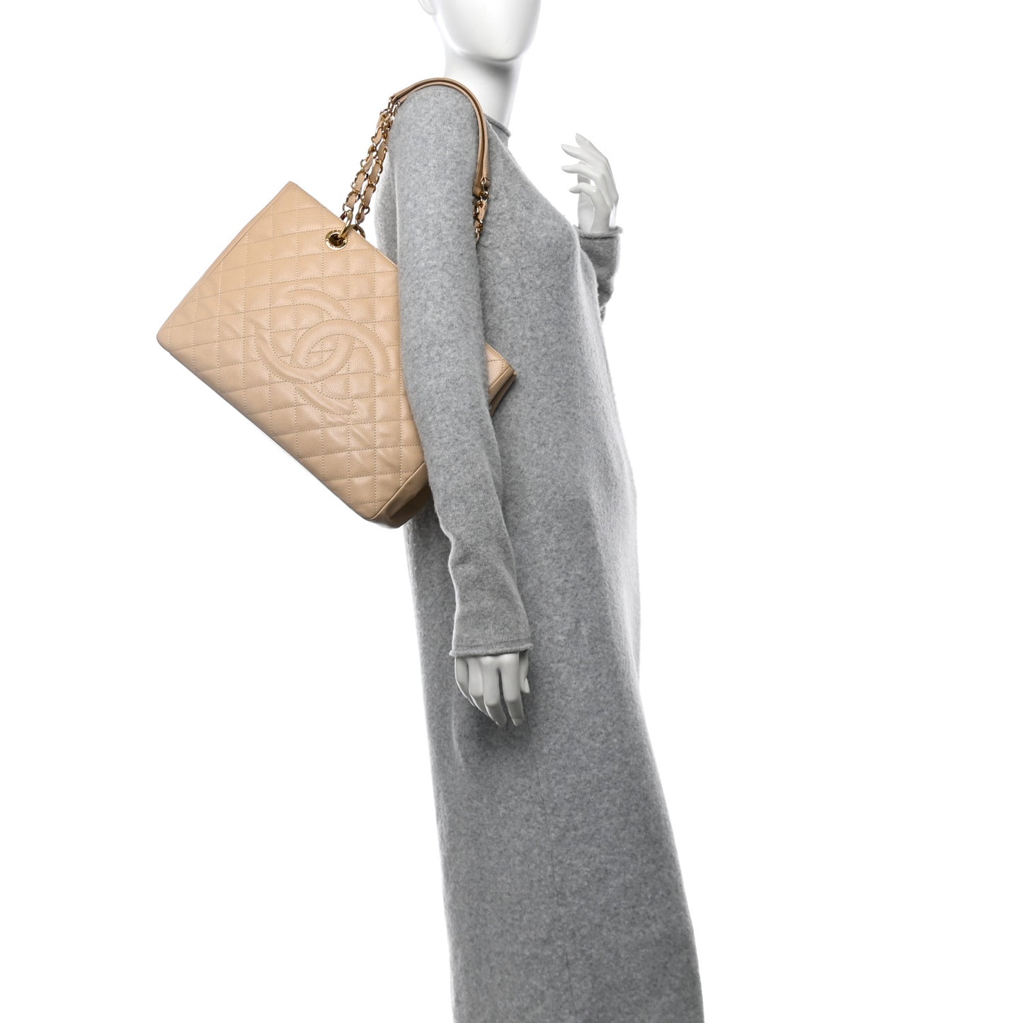 This is an authentic CHANEL Caviar Quilted Grand Shopping Tote GST in Beige Clair. This tote is beautifully crafted of luxurious diamond quilted caviar leather in beige. The bag features a gold chain link leather threaded shoulder straps with shoulder pads, a stitched Chanel CC logo and a rear patch pocket. The top opens to a partitioned beige fabric interior with a central zipper compartment.Follow this item for alerts. Chanel is a registered trademark of Chanel. FASHIONPHILE is not affiliated with Chanel.