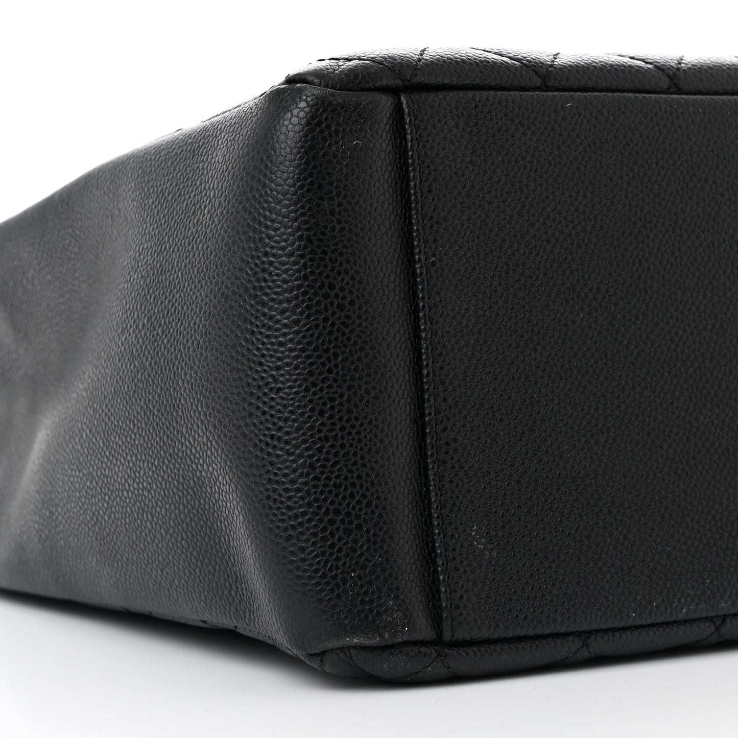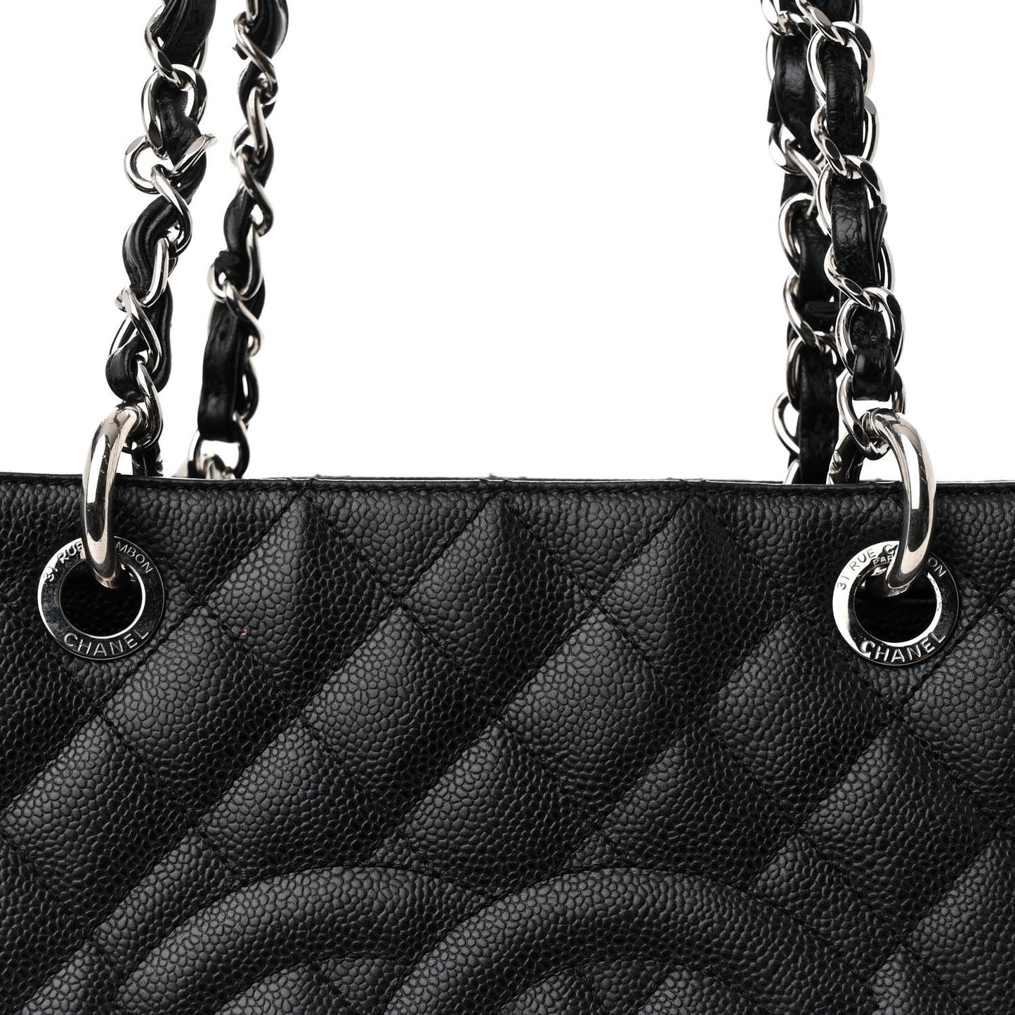 This is an authentic CHANEL Caviar Quilted Grand Shopping Tote GST in Black. This stunning tote is beautifully crafted of luxurious diamond quilted caviar leather in black. The features include leather threaded silver chain link shoulder straps with leather shoulder pads, a prominent frontal stitched Chanel CC logo and a rear patch pocket. The top is open to a black satin partitioned interior with zipper and patch pockets.Follow this item for alerts. Chanel is a registered trademark of Chanel. FASHIONPHILE is not affiliated with Chanel.