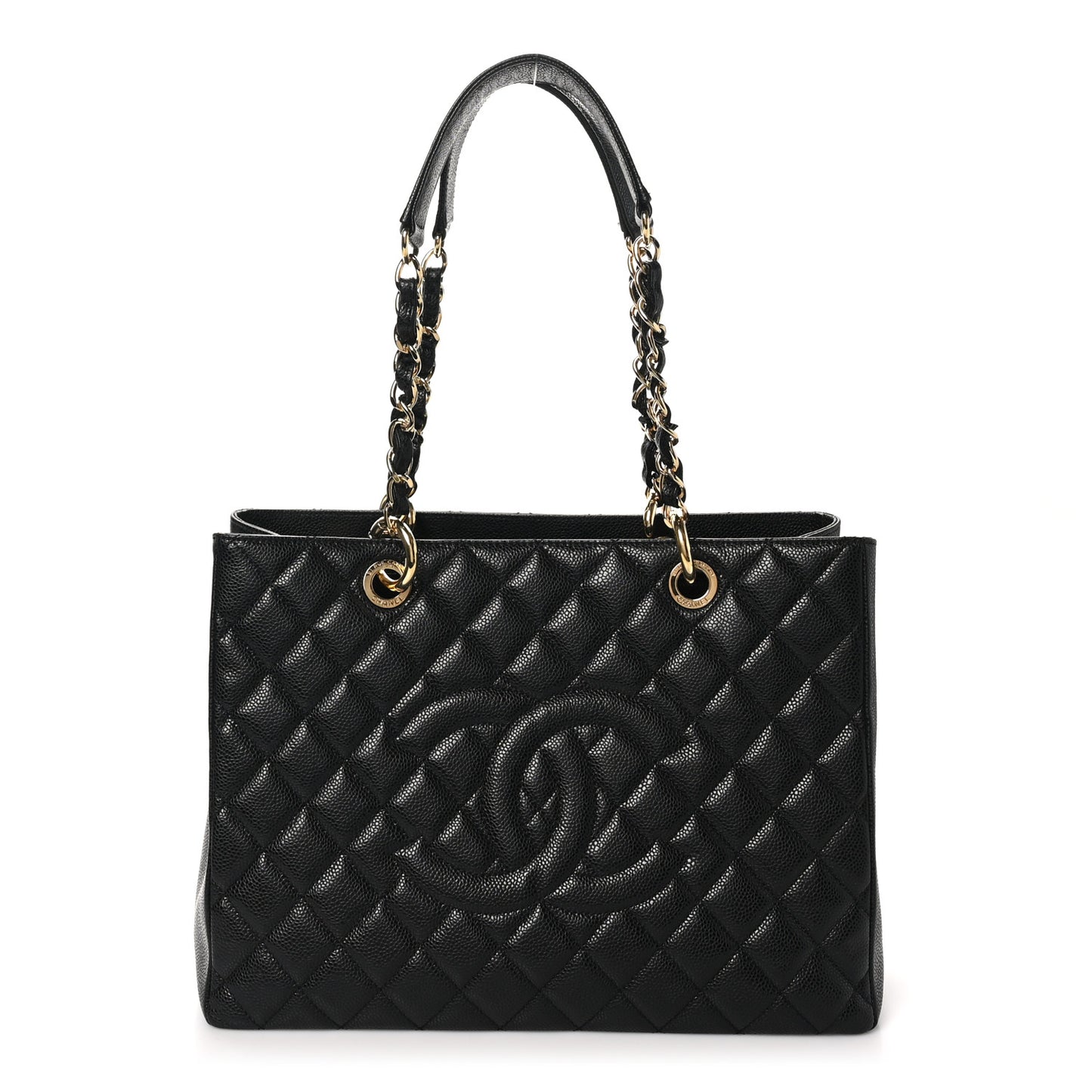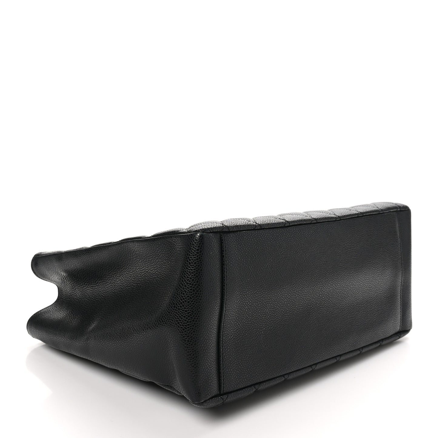 This is an authentic CHANEL Caviar Quilted Grand Shopping Tote GST in Black. This stylish tote is crafted of black diamond quilted caviar leather. This shoulder bag features leather threaded polished gold chain-link shoulder straps with shoulder pads, a quilted Chanel CC logo on the front, and a flat pocket on the rear. The top opens to a partitioned black satin interior with a central zipper compartment, zipper pocket, and patch pocket.Follow this item for alerts. Chanel is a registered trademark of Chanel. FASHIONPHILE is not affiliated with Chanel.
