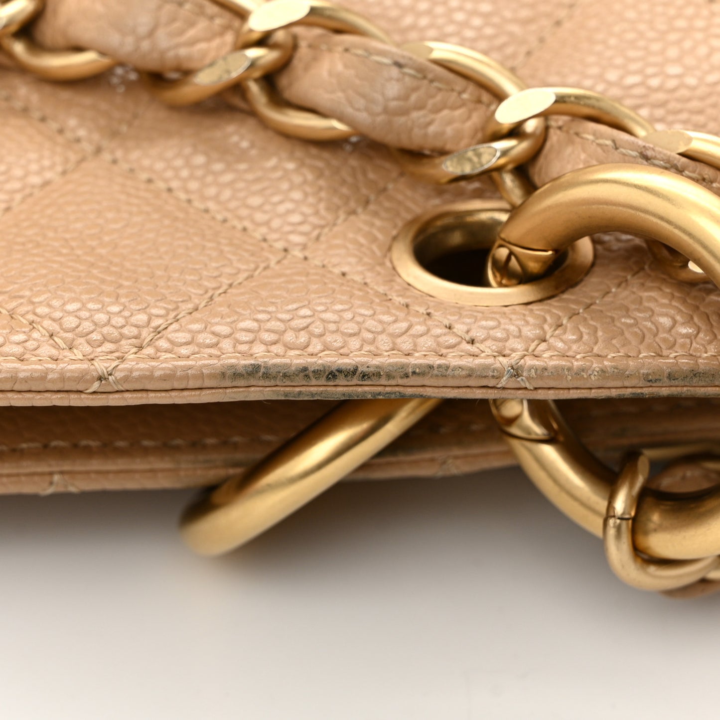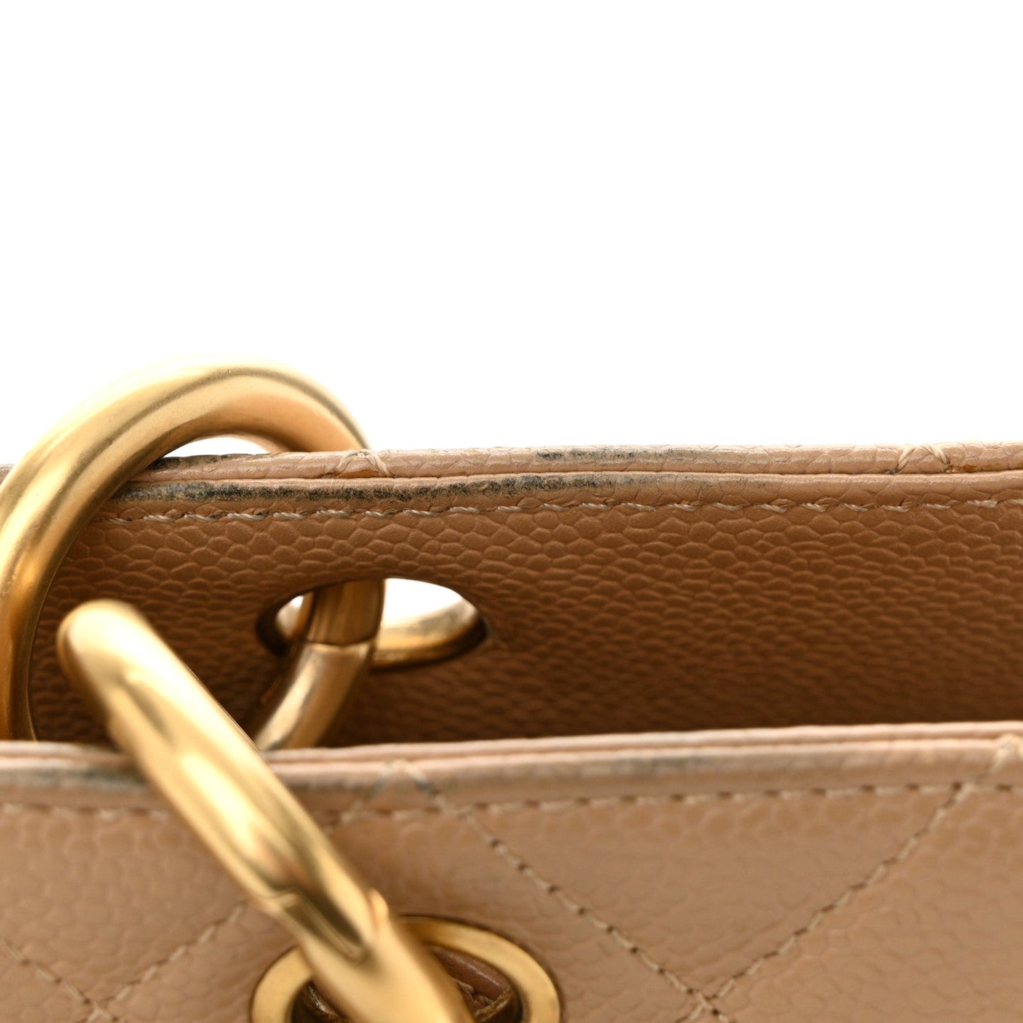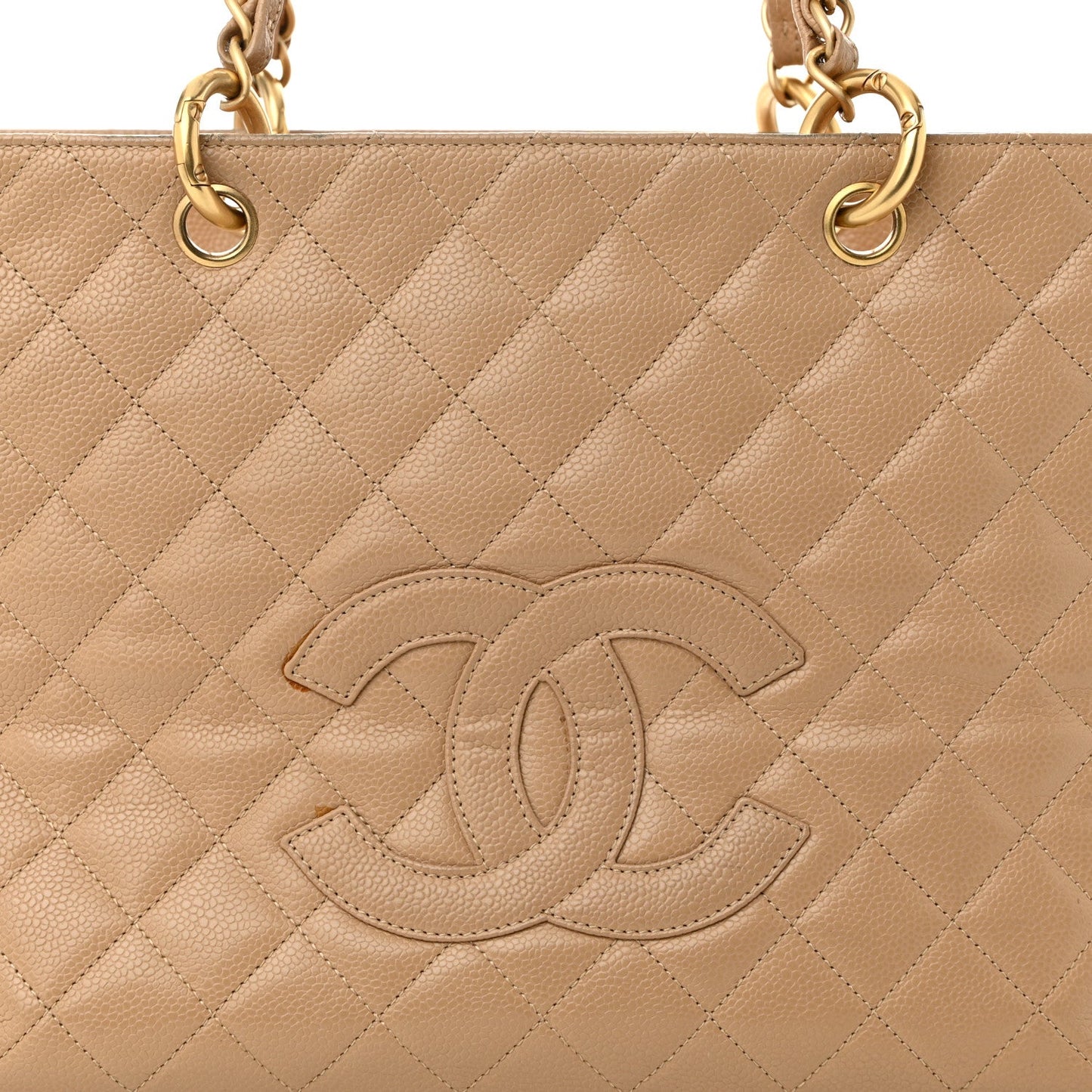 This is an authentic CHANEL Caviar Quilted Grand Shopping Tote GTT in Beige. This tote is beautifully crafted of luxurious diamond quilted caviar leather in beige. The bag features a gold chain link leather threaded shoulder straps with shoulder pads, a stitched Chanel CC logo and a rear patch pocket. The top opens to a beige leather interior with a zipper compartment.Follow this item for alerts. Chanel is a registered trademark of Chanel. FASHIONPHILE is not affiliated with Chanel.