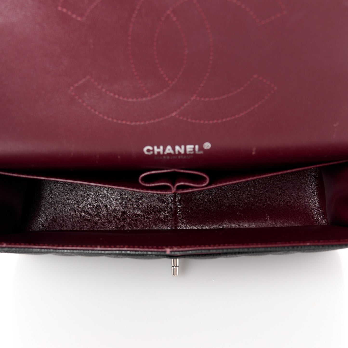 This is an authentic CHANEL Caviar Quilted Jumbo Double Flap in Black. This classic shoulder bag is crafted of caviar leather in black. The bag features leather-threaded silver chainlink shoulder straps, a rear patch pocket, and a front flap with a silver CC turn lock. This opens to a second flap and a burgundy leather interior with patch pockets.Follow this item for alerts. Chanel is a registered trademark of Chanel. FASHIONPHILE is not affiliated with Chanel.