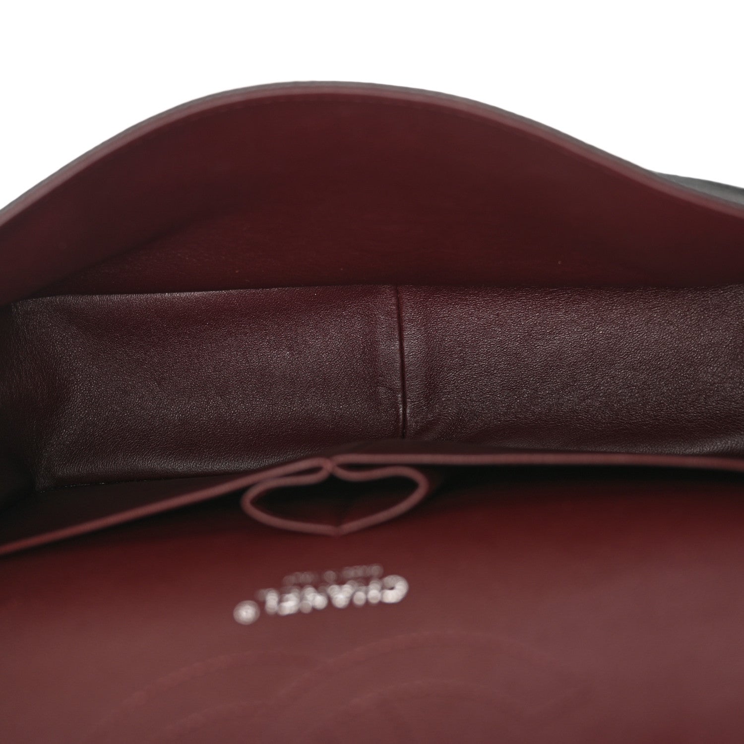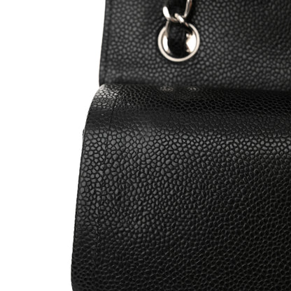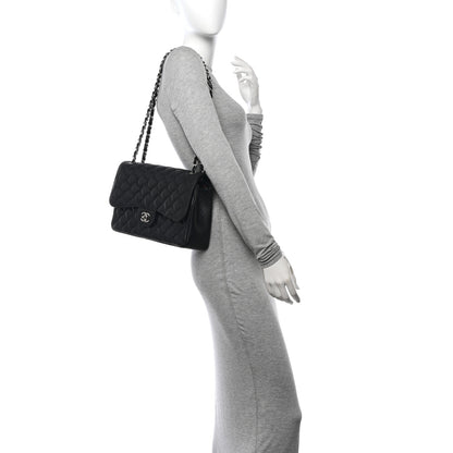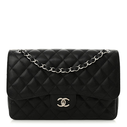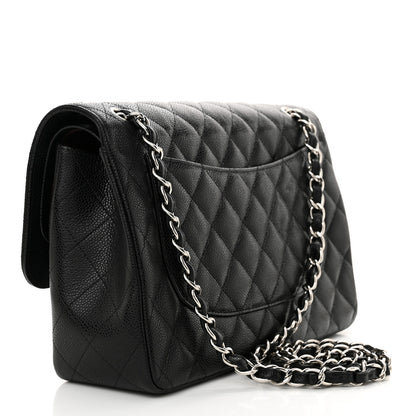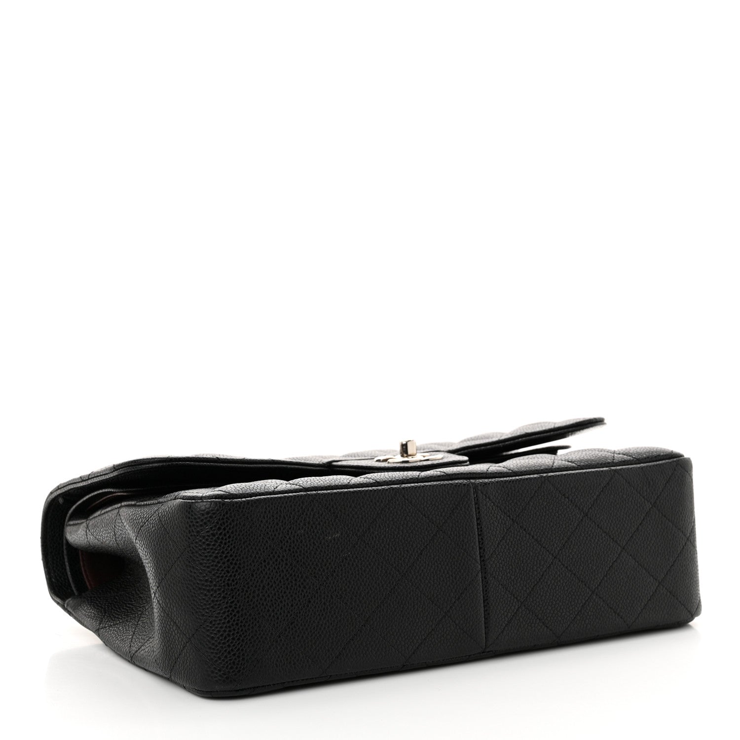 This is an authentic CHANEL Caviar Quilted Jumbo Double Flap in Black. This stylish shoulder bag is crafted of luxurious diamond-quilted caviar leather in black. It features a leather-threaded polished silver-tone chain-link shoulder strap and a rear patch pocket. The crossover flap opens with a silver-tone classic CC turn-lock to reveal an inner flap, front pocket, and a burgundy leather interior with patch pockets.Follow this item for alerts. Chanel is a registered trademark of Chanel. FASHIONPHILE is not affiliated with Chanel.