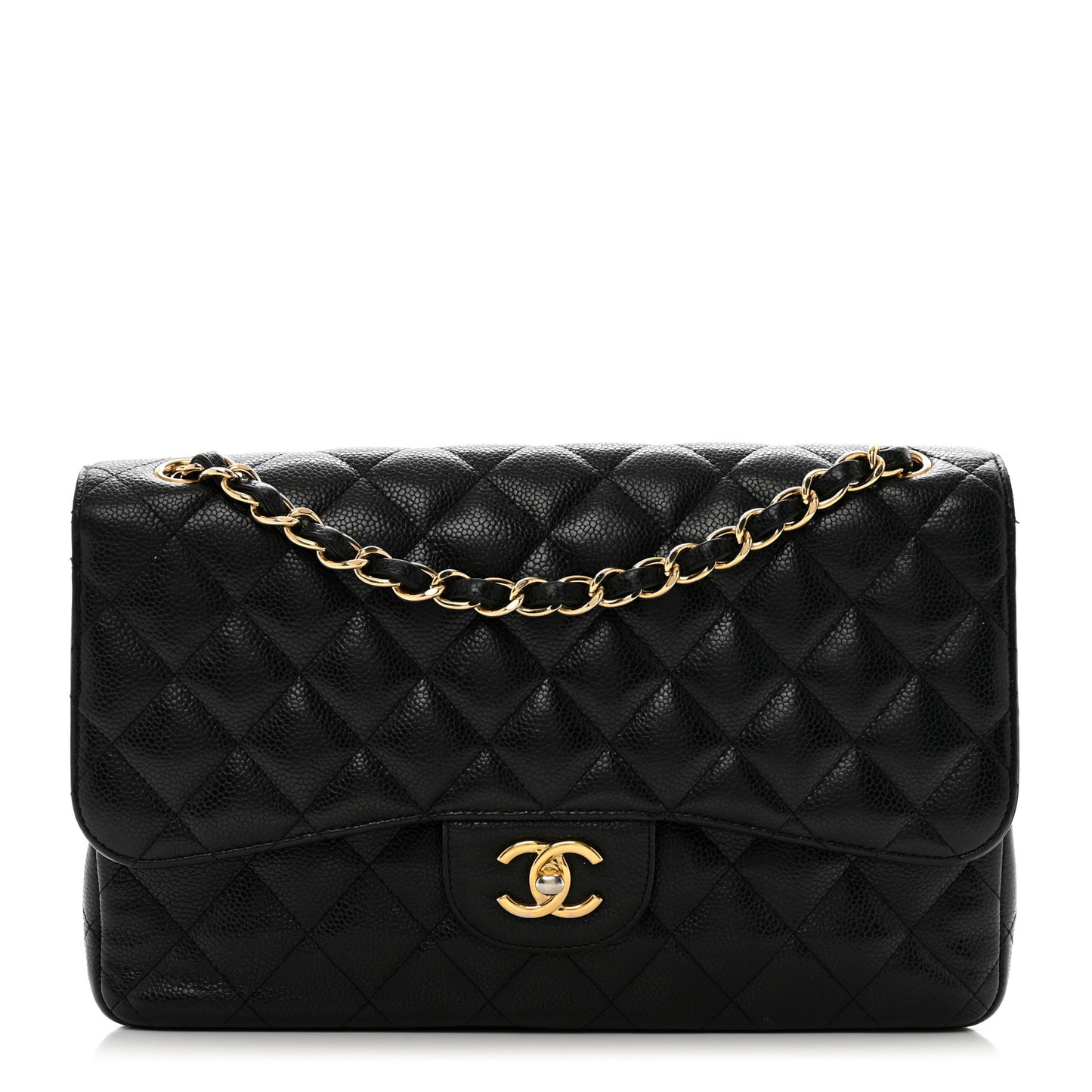 This is an authentic CHANEL Caviar Quilted Jumbo Double Flap in Black. This stylish shoulder bag is crafted of luxurious caviar textured leather. It features leather threaded polished gold chain link shoulder straps, a rear patch pocket, and a front flap with a gold CC turn lock. The flap opens to an inner flap and a burgundy leather interior with patch pockets.Follow this item for alerts. Chanel is a registered trademark of Chanel. FASHIONPHILE is not affiliated with Chanel.