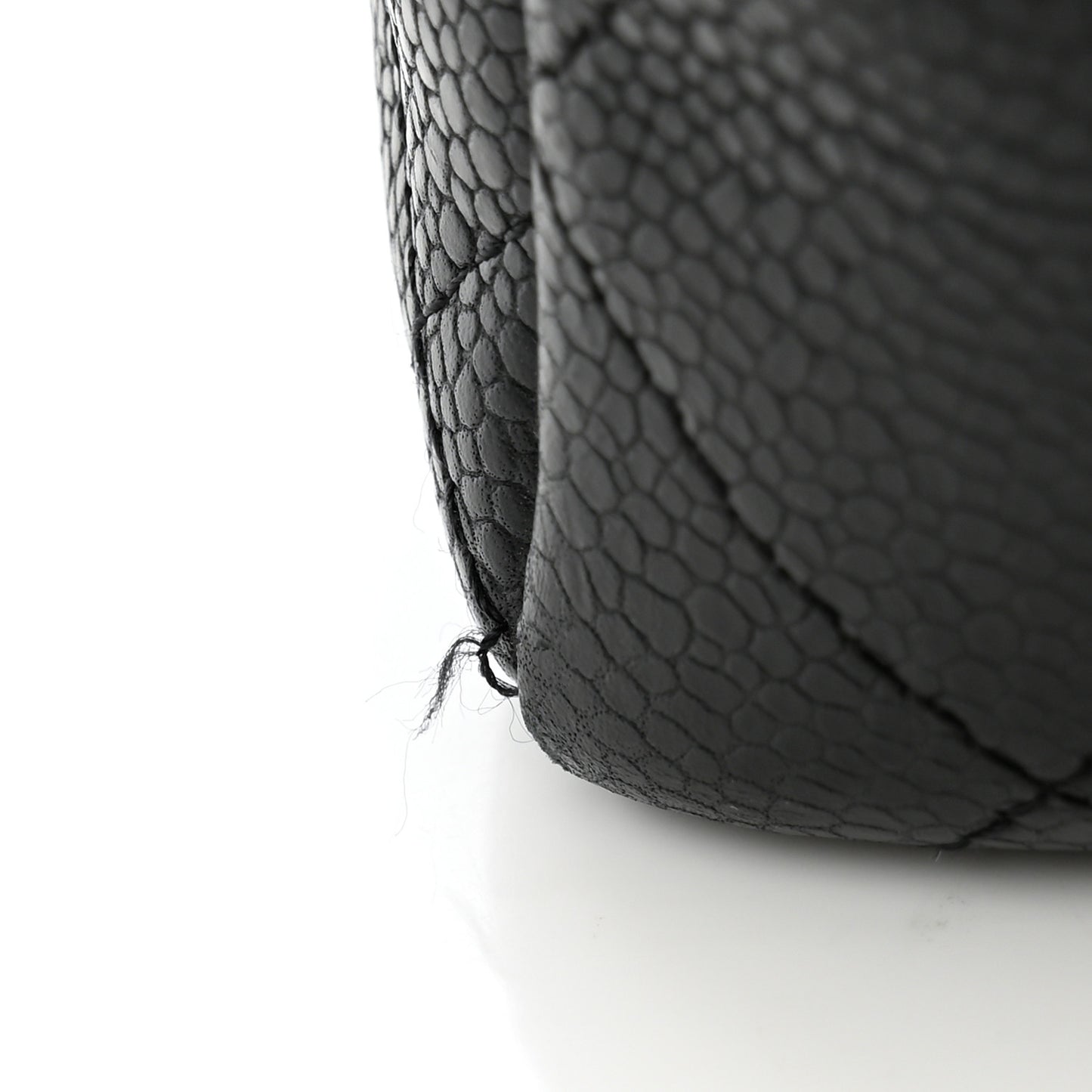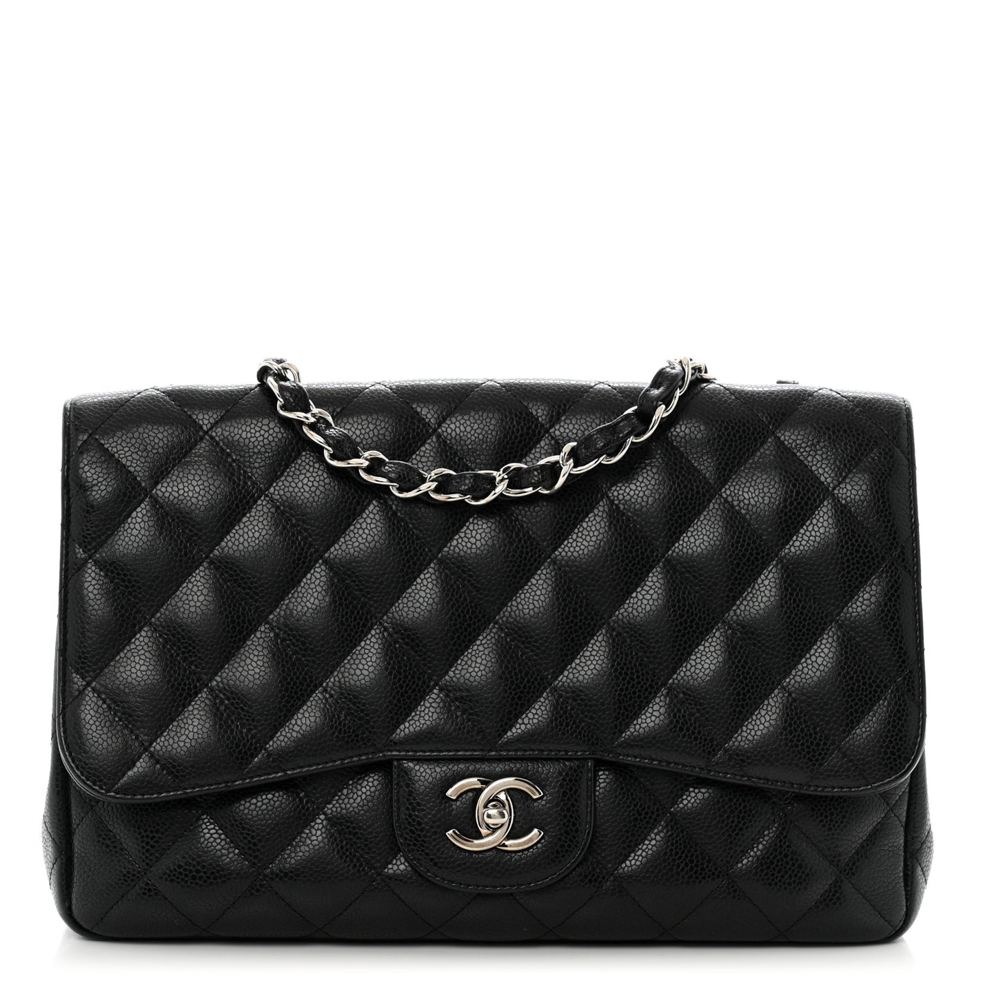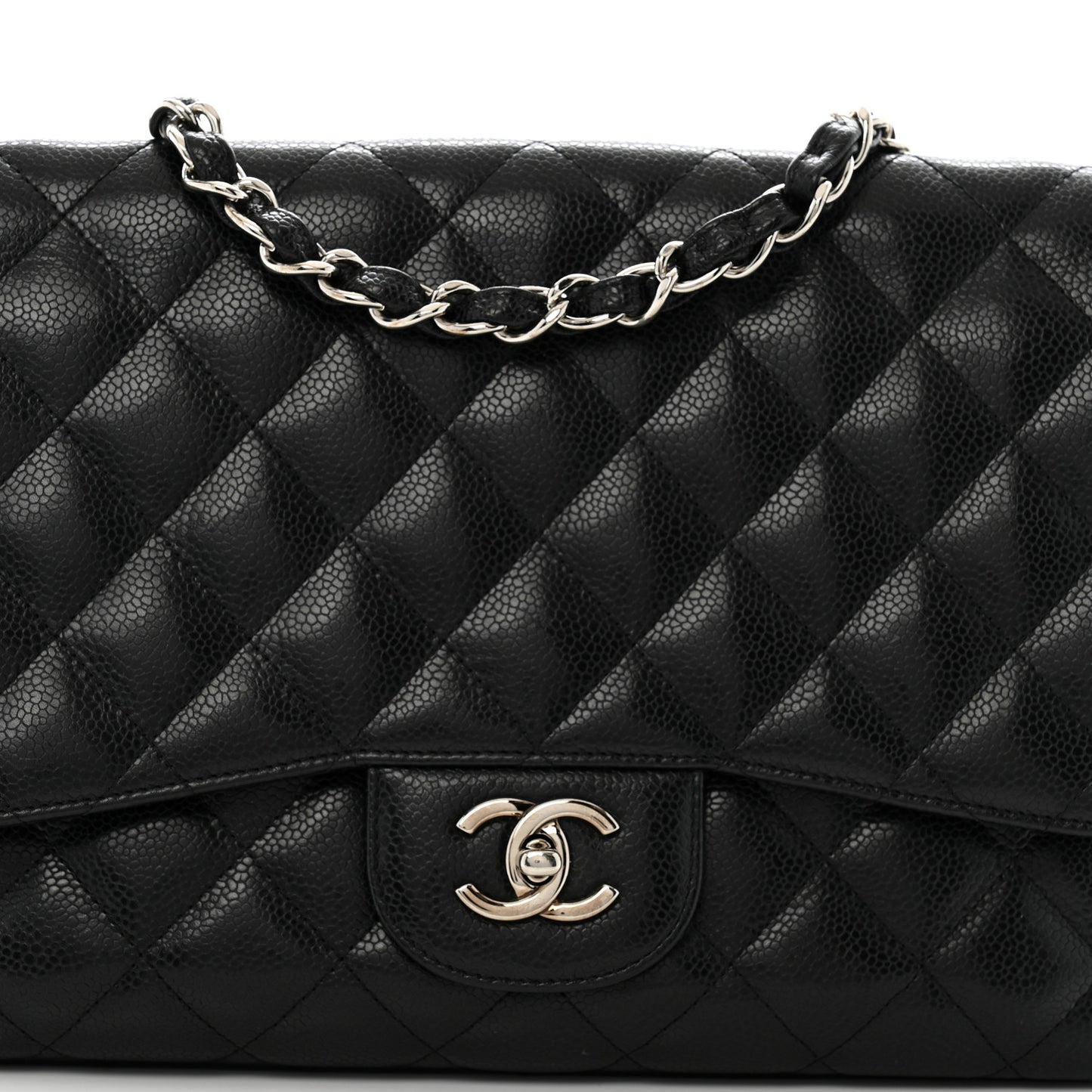 This is an authentic CHANEL Caviar Quilted Jumbo Double Flap in Black. This stylish shoulder bag is crafted of luxurious caviar textured leather. It features leather threaded polished silver chain link shoulder straps, a rear patch pocket, and a front flap with a silver CC turn lock. The flap opens to an inner flap and a black leather interior with patch pockets.Follow this item for alerts. Chanel is a registered trademark of Chanel. FASHIONPHILE is not affiliated with Chanel.