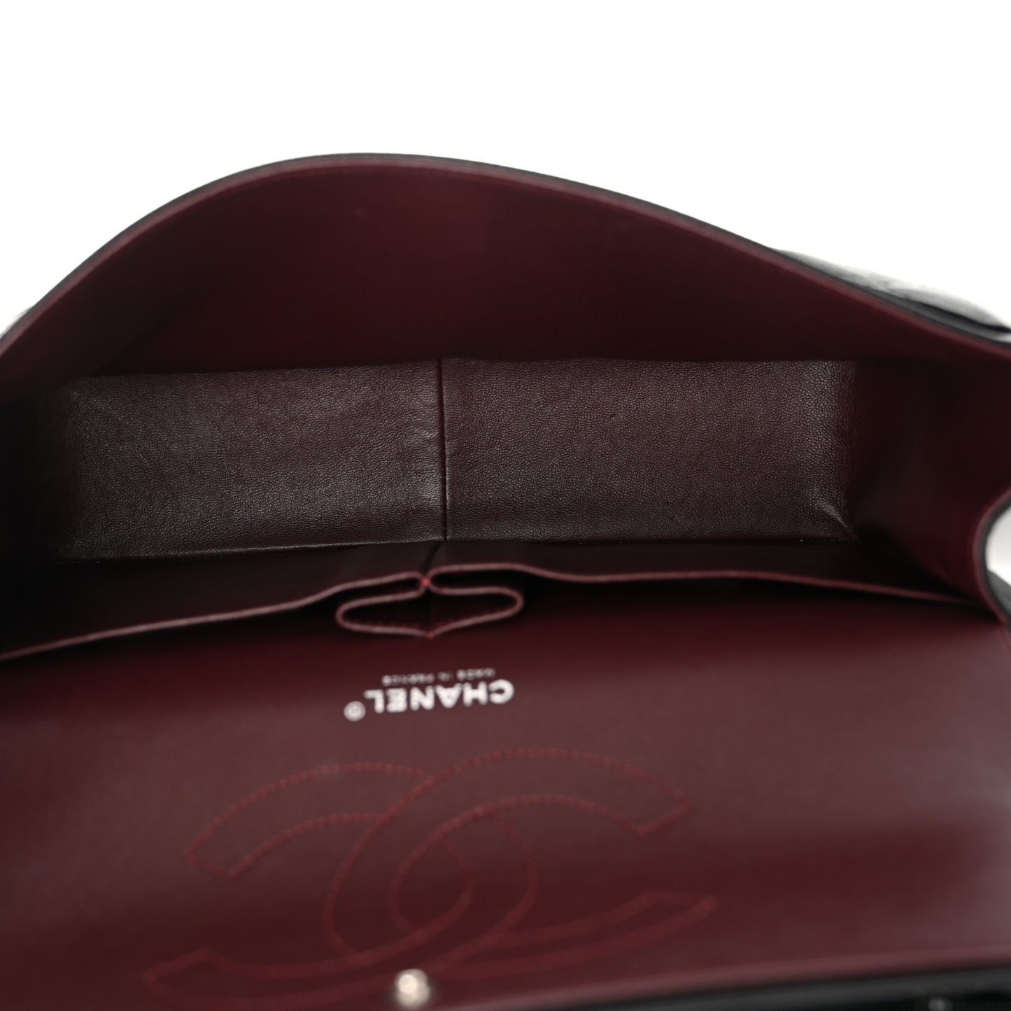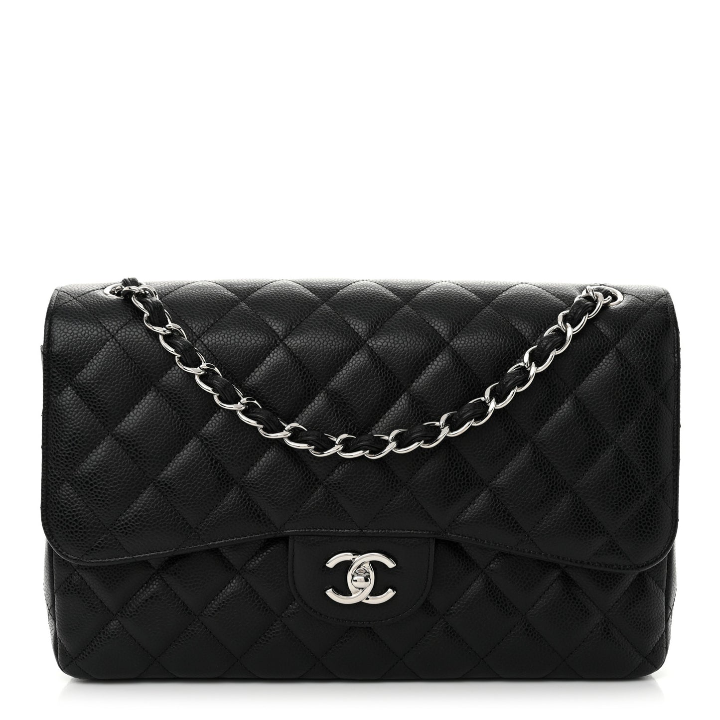 This is an authentic CHANEL Caviar Quilted Jumbo Double Flap in Black. This bag is crafted of black caviar textured leather and silver hardware. The flap opens to a burgundy leather interior with patch pockets.Follow this item for alerts. Chanel is a registered trademark of Chanel. FASHIONPHILE is not affiliated with Chanel.