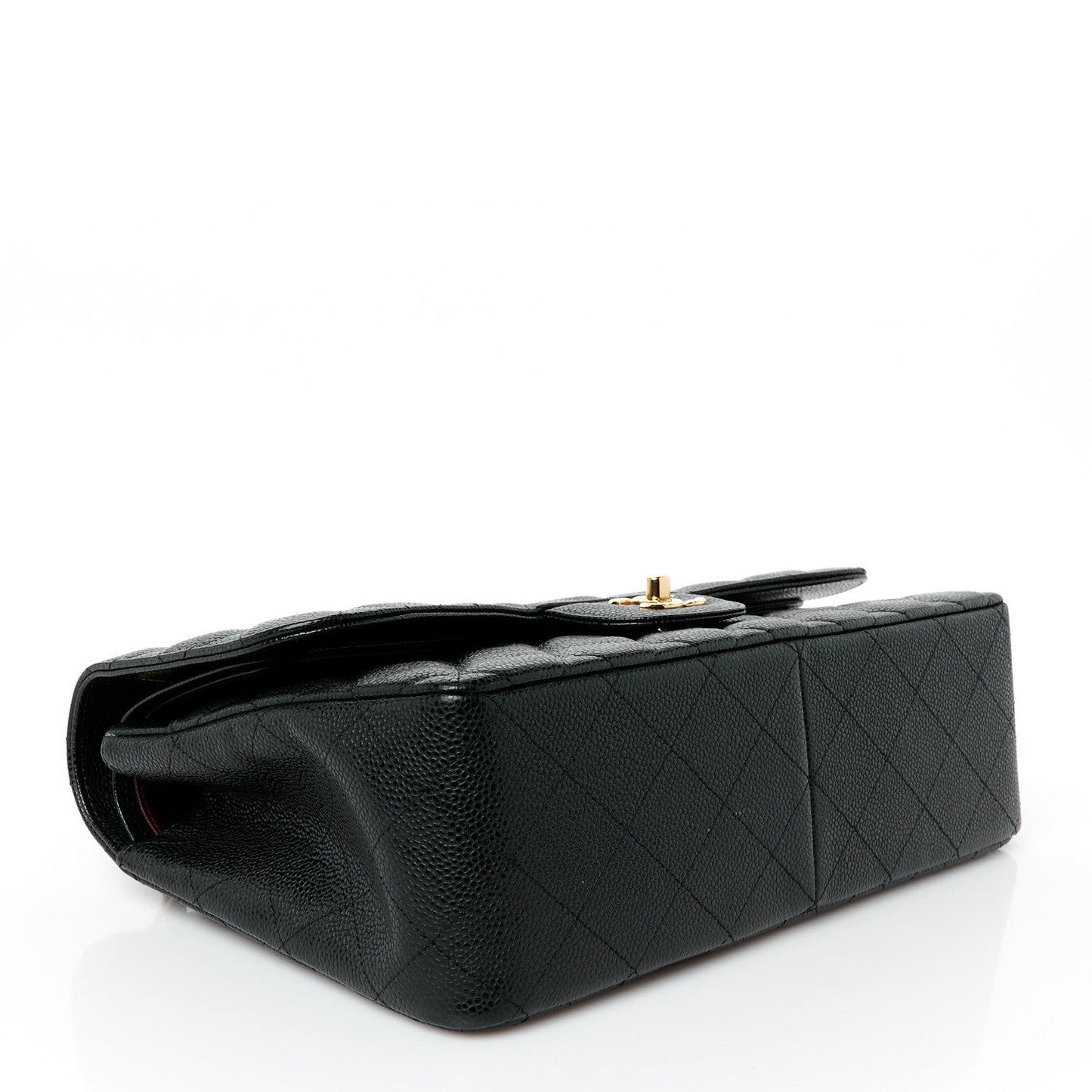 This is an authentic CHANEL Caviar Quilted Jumbo Double Flap in Black. This stylish shoulder bag is crafted of luxurious caviar textured leather. It features leather threaded polished gold chain link shoulder straps, a rear patch pocket, and a front flap with a silver CC turn lock. The flap opens to an inner flap and a bordeaux leather interior with patch pockets.Follow this item for alerts. Chanel is a registered trademark of Chanel. FASHIONPHILE is not affiliated with Chanel.