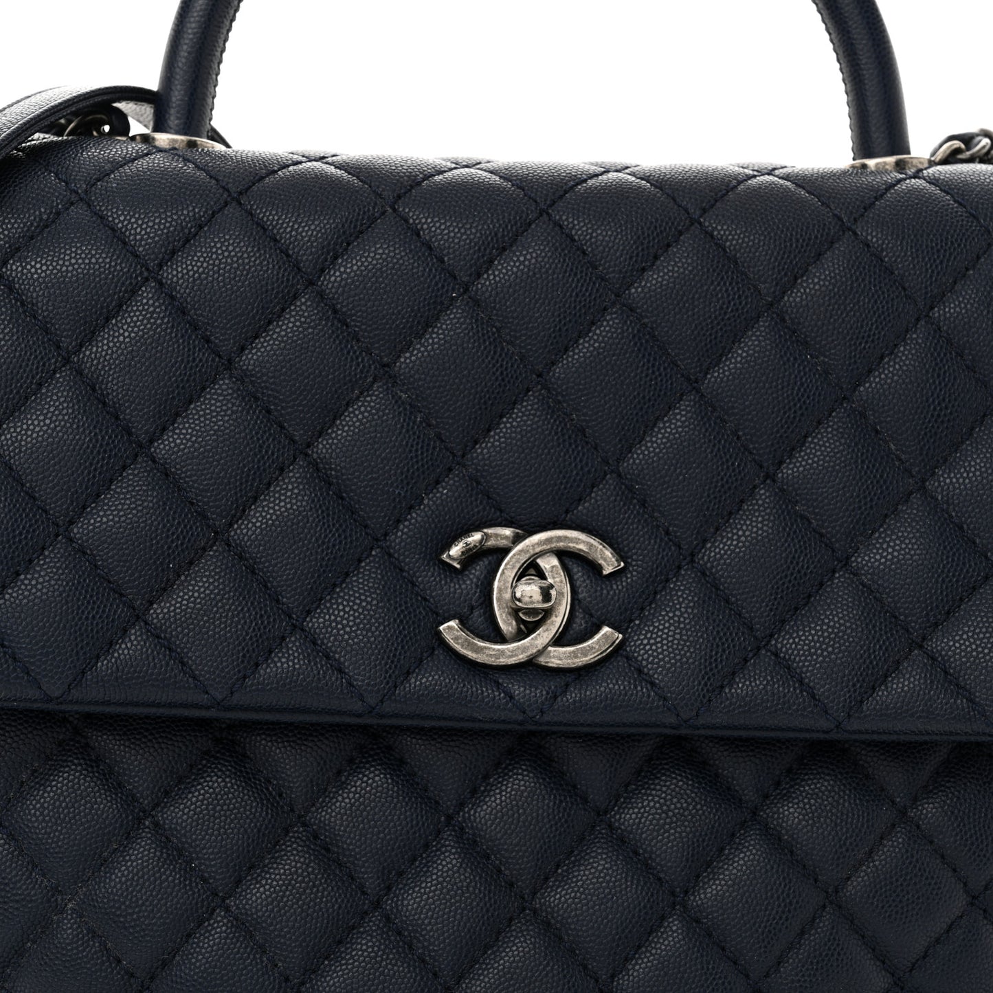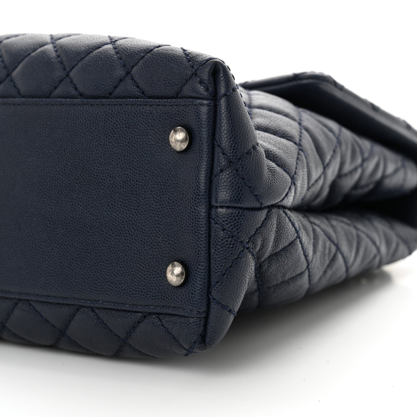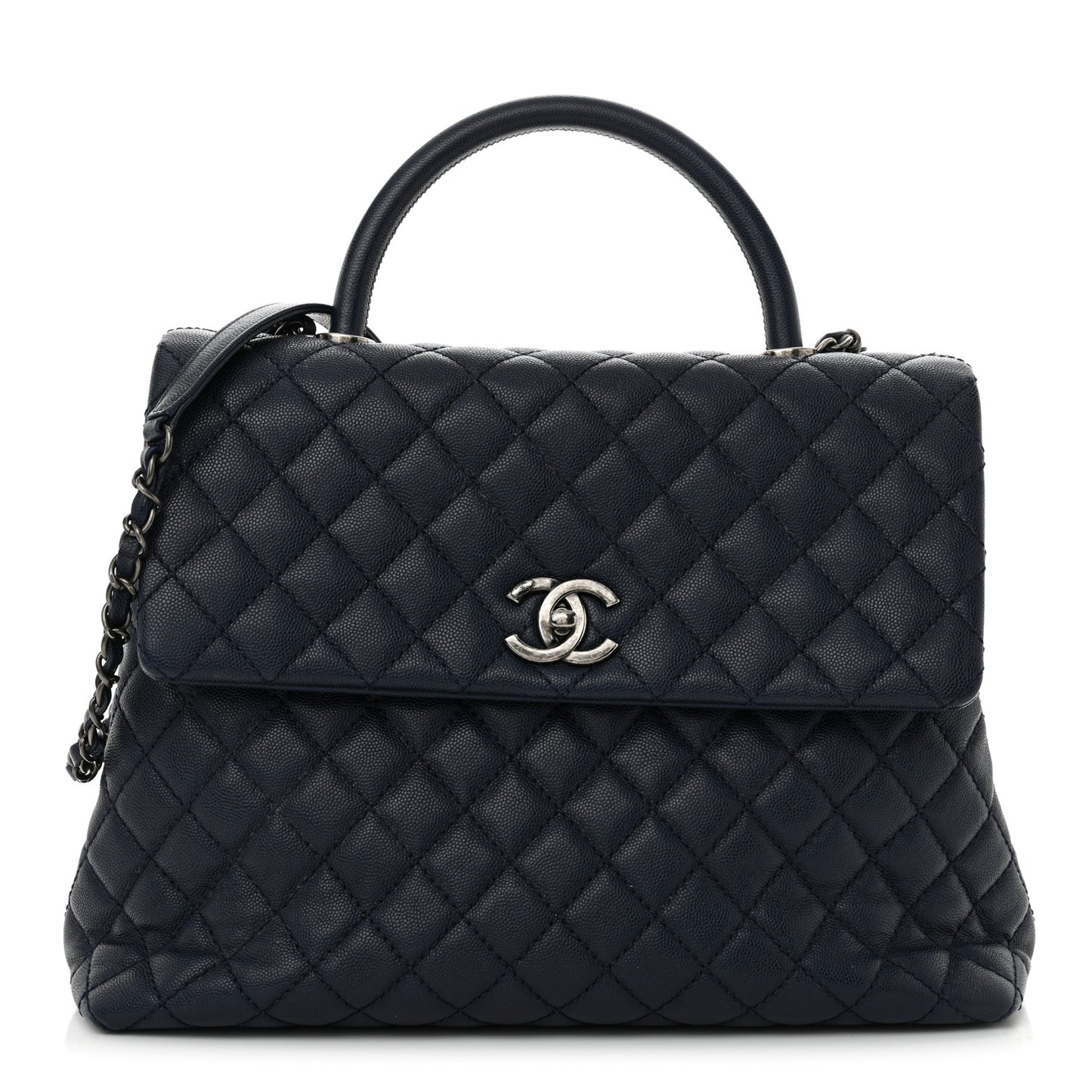 This is an authentic CHANEL Caviar Quilted Large Coco Handle Flap in Navy. This stylish tote is crafted of diamond quilted luxurious caviar leather in blue. The bag features a sturdy and reinforced leather top handle with ruthenium links, a rear patch pocket, and a ruthenium Chanel CC turn lock for the facing flap. This opens to a fabric interior with a zipper and patch pocket. This tote has room for all your essentials for every occasion with the timeless style of Chanel!Follow this item for alerts. Chanel is a registered trademark of Chanel. FASHIONPHILE is not affiliated with Chanel.