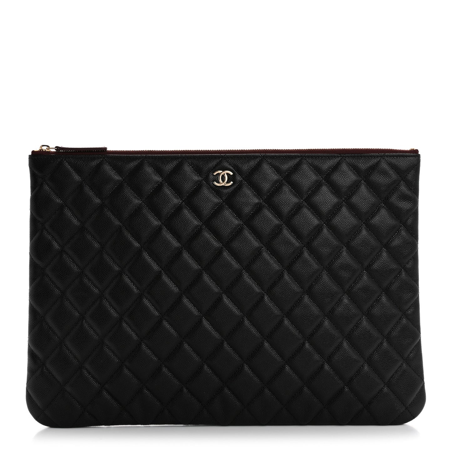 This is an authentic CHANEL Caviar Quilted Large Cosmetic Case in Black. This stylish cosmetic pouch is crafted of diamond quilted caviar leather in black, with a small light gold Chanel CC logo on the front. The top zipper opens to a spacious diamond-quilted burgundy nylon lining with a zipper pocket.Follow this item for alerts. Chanel is a registered trademark of Chanel. FASHIONPHILE is not affiliated with Chanel.