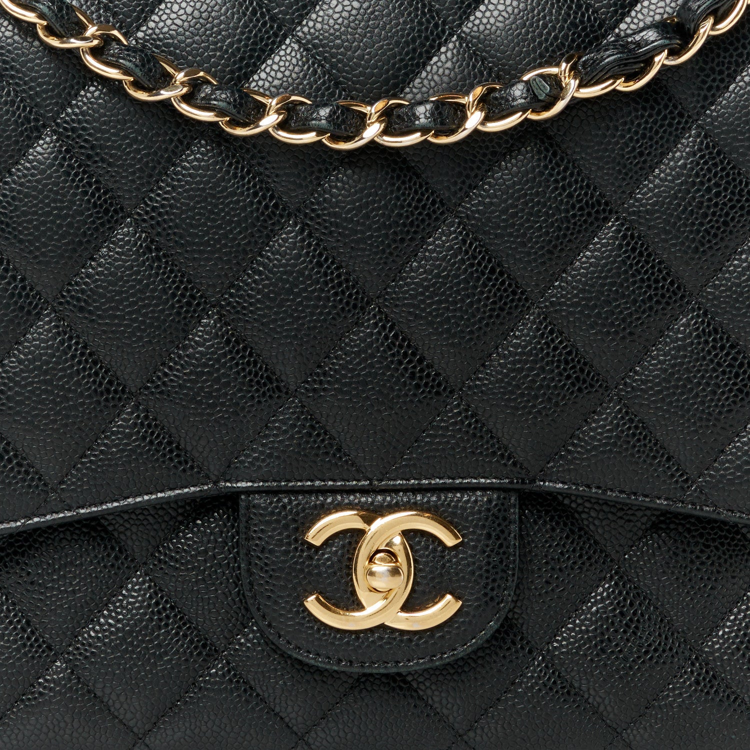 This is an authentic CHANEL Caviar Quilted Maxi Double Flap in Black. This stylish shoulder bag is crafted of luxurious caviar textured leather in black. It features leather threaded polished gold chain-link shoulder straps, a rear patch pocket, and a front flap with a gold CC turn lock. The flap opens to a burgundy leather interior with patch pockets.Follow this item for alerts. Chanel is a registered trademark of Chanel. FASHIONPHILE is not affiliated with Chanel.