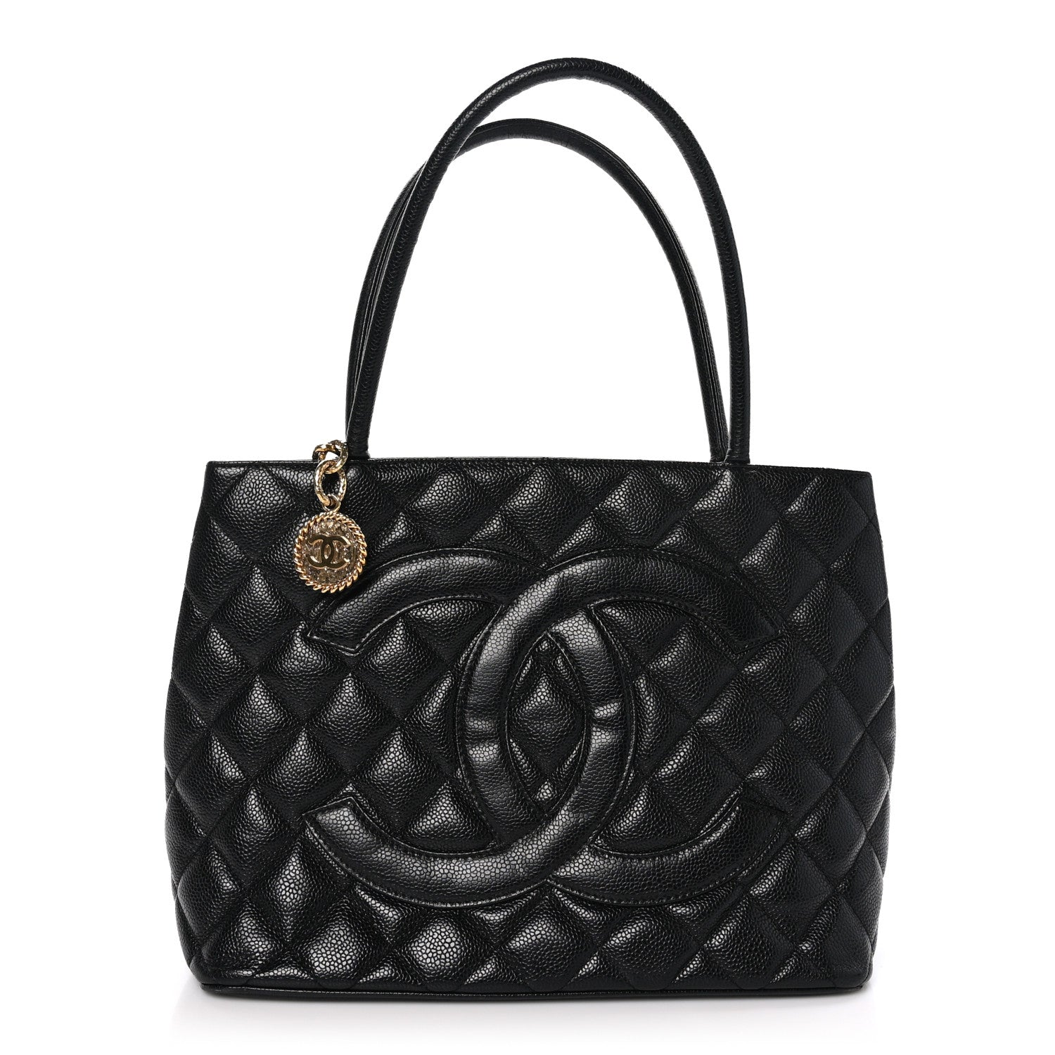 This is an authentic CHANEL Caviar Quilted Medallion Tote in Black. This stylish tote is beautifully crafted of diamond-quilted caviar leather in black with a prominent Chanel CC logo patch on the front. The bag features a rear patch pocket and rolled leather top handles. The brushed silver medallion zipper pull opens the bag to a smooth black leather interior with zipper and patch pockets.Follow this item for alerts. Chanel is a registered trademark of Chanel. FASHIONPHILE is not affiliated with Chanel.