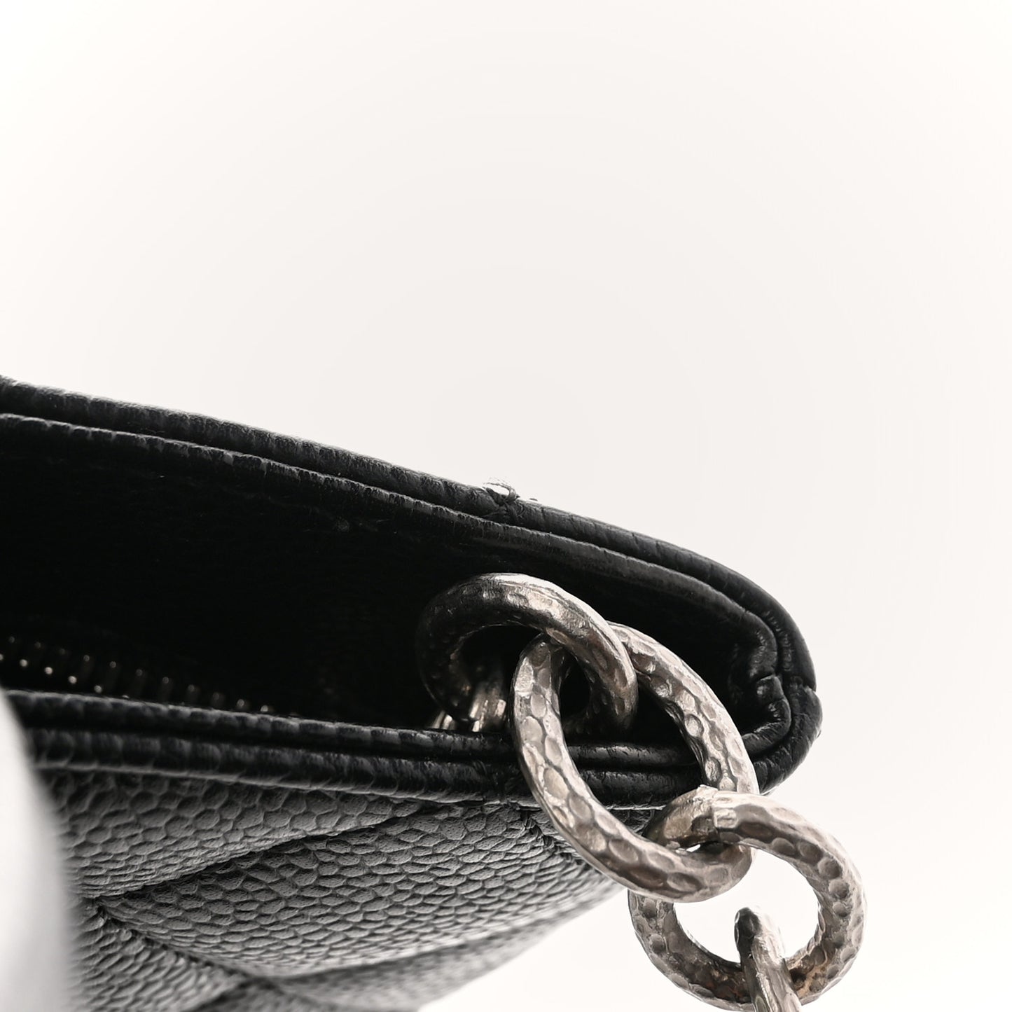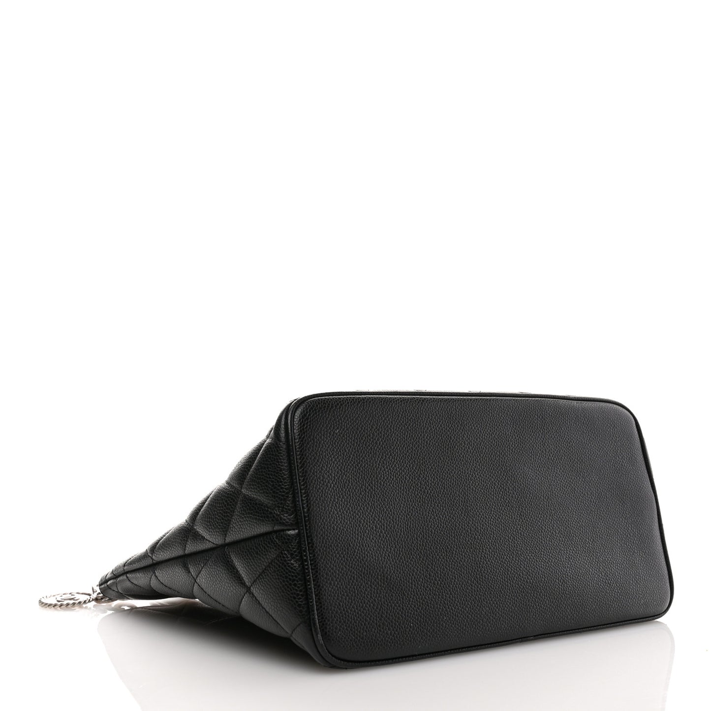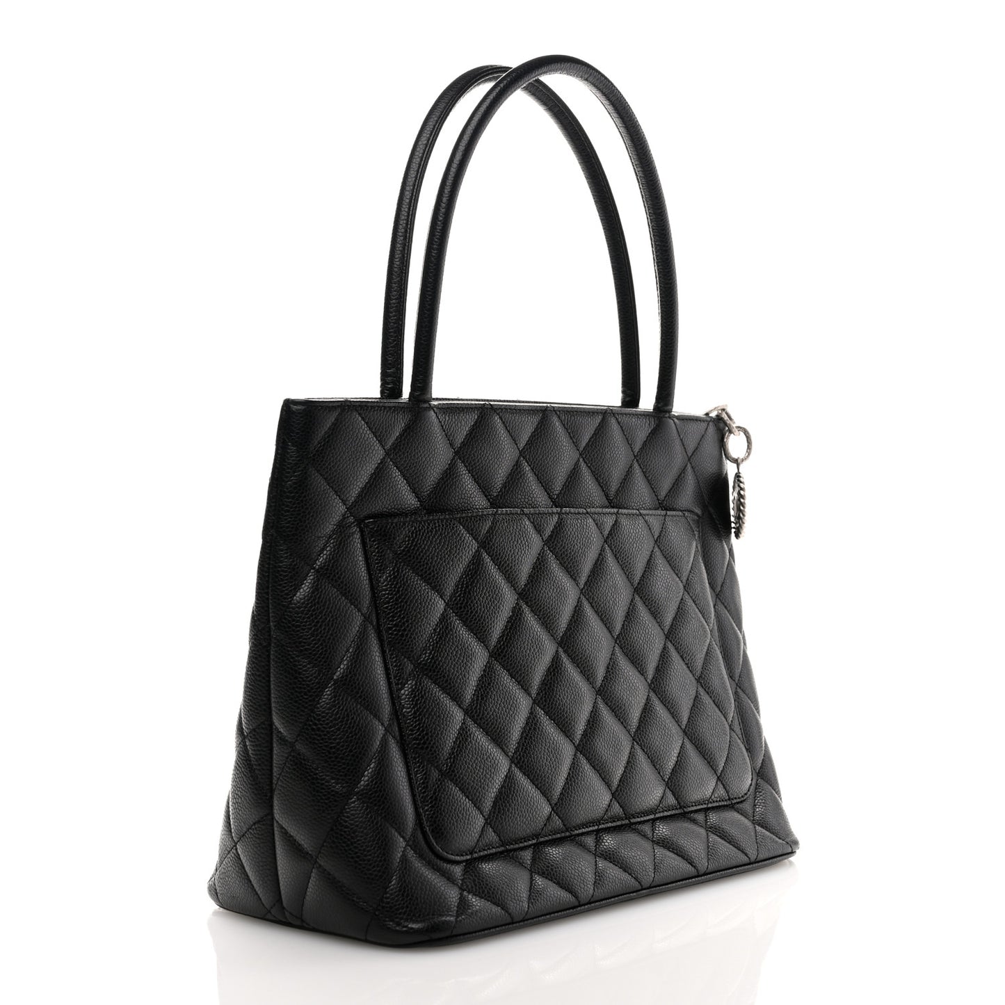 This is an authentic CHANEL Caviar Quilted Medallion Tote in Black. This stylish tote is beautifully crafted of diamond-quilted caviar leather in black with a prominent Chanel CC logo patch on the front. The bag features a rear patch pocket and rolled leather top handles. The silver medallion zipper pull opens the bag to a smooth black leather interior with zipper and patch pockets.Follow this item for alerts. Chanel is a registered trademark of Chanel. FASHIONPHILE is not affiliated with Chanel.