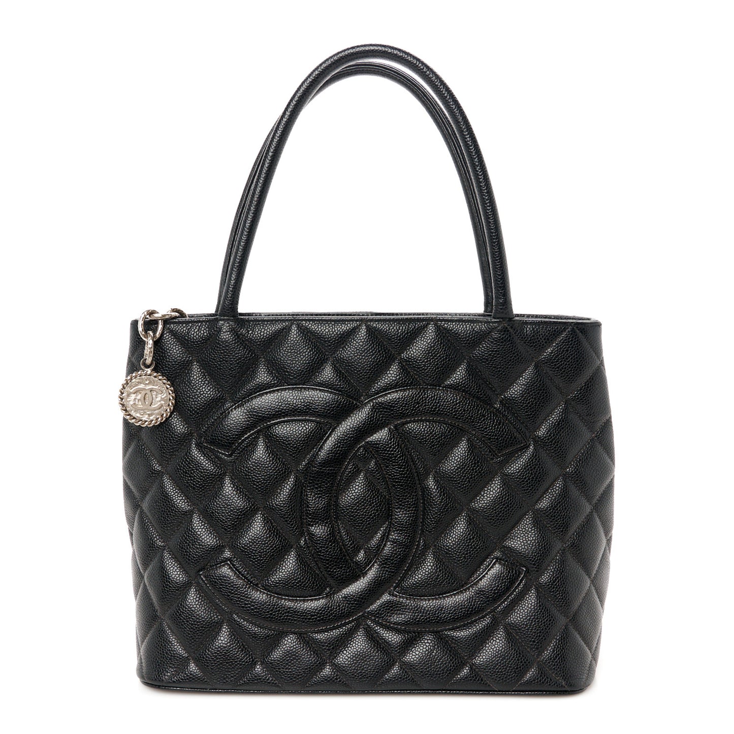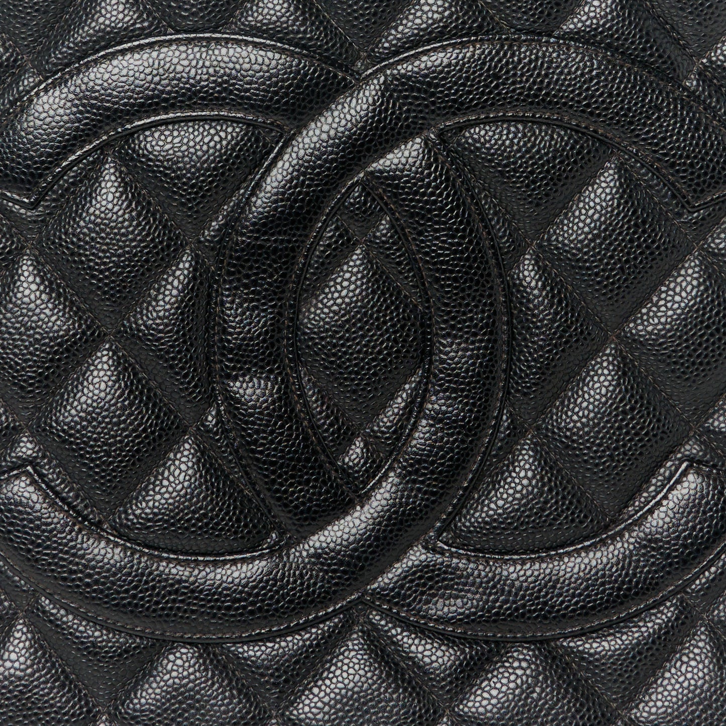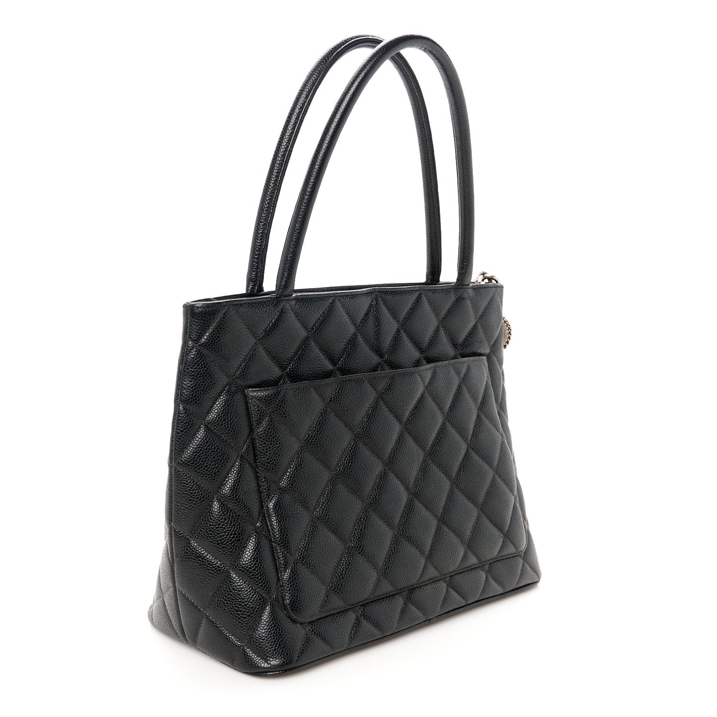 This is an authentic CHANEL Caviar Quilted Medallion Tote in Black. This stylish tote is beautifully crafted of diamond-quilted caviar leather in black with a prominent Chanel CC logo patch on the front. The bag features a rear patch pocket and rolled leather top handles. The silver medallion zipper pull opens the bag to a smooth black leather interior with zipper and patch pockets.Follow this item for alerts. Chanel is a registered trademark of Chanel. FASHIONPHILE is not affiliated with Chanel.