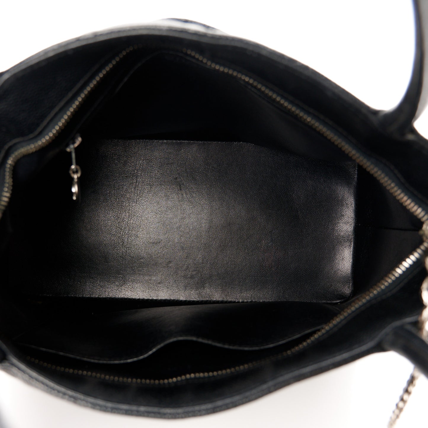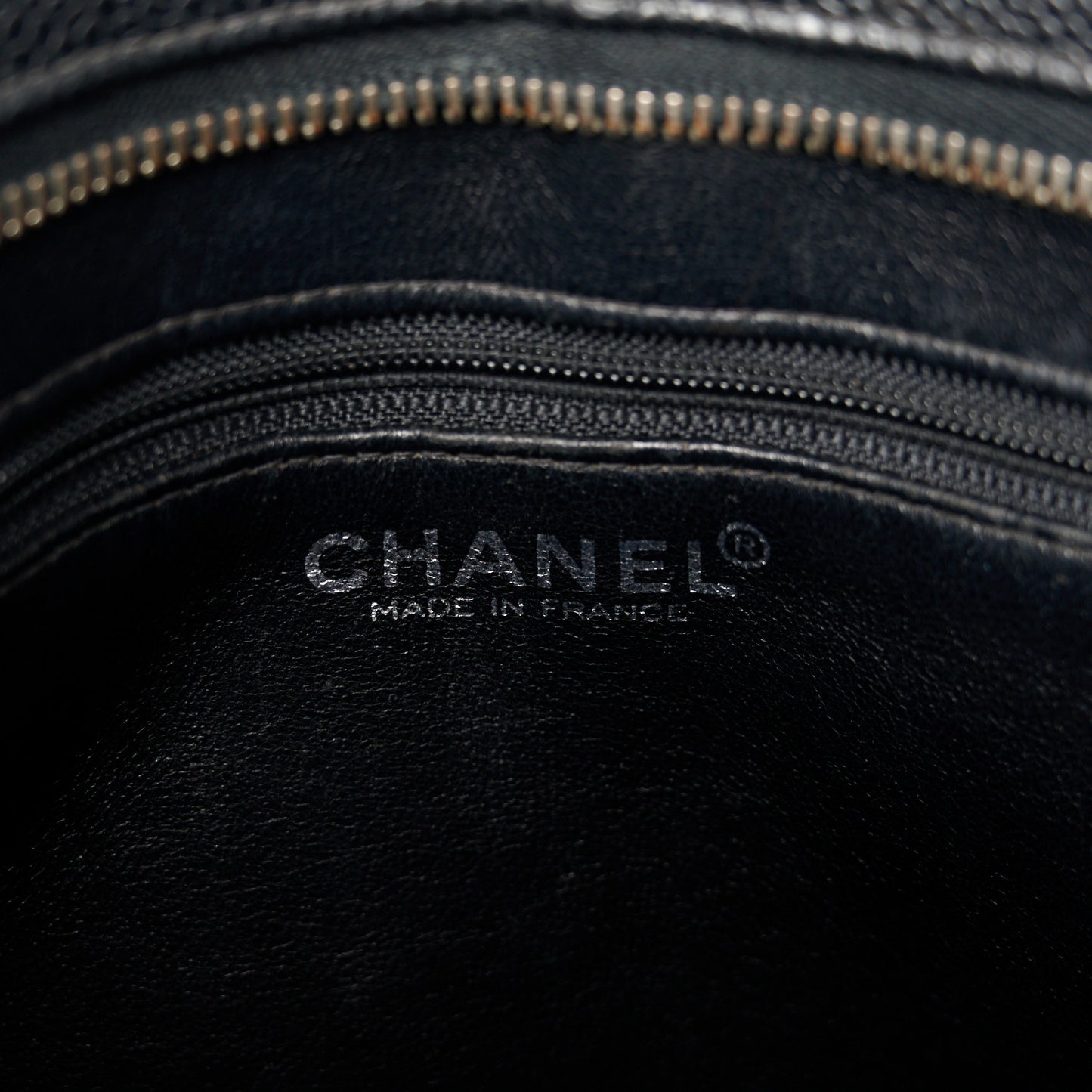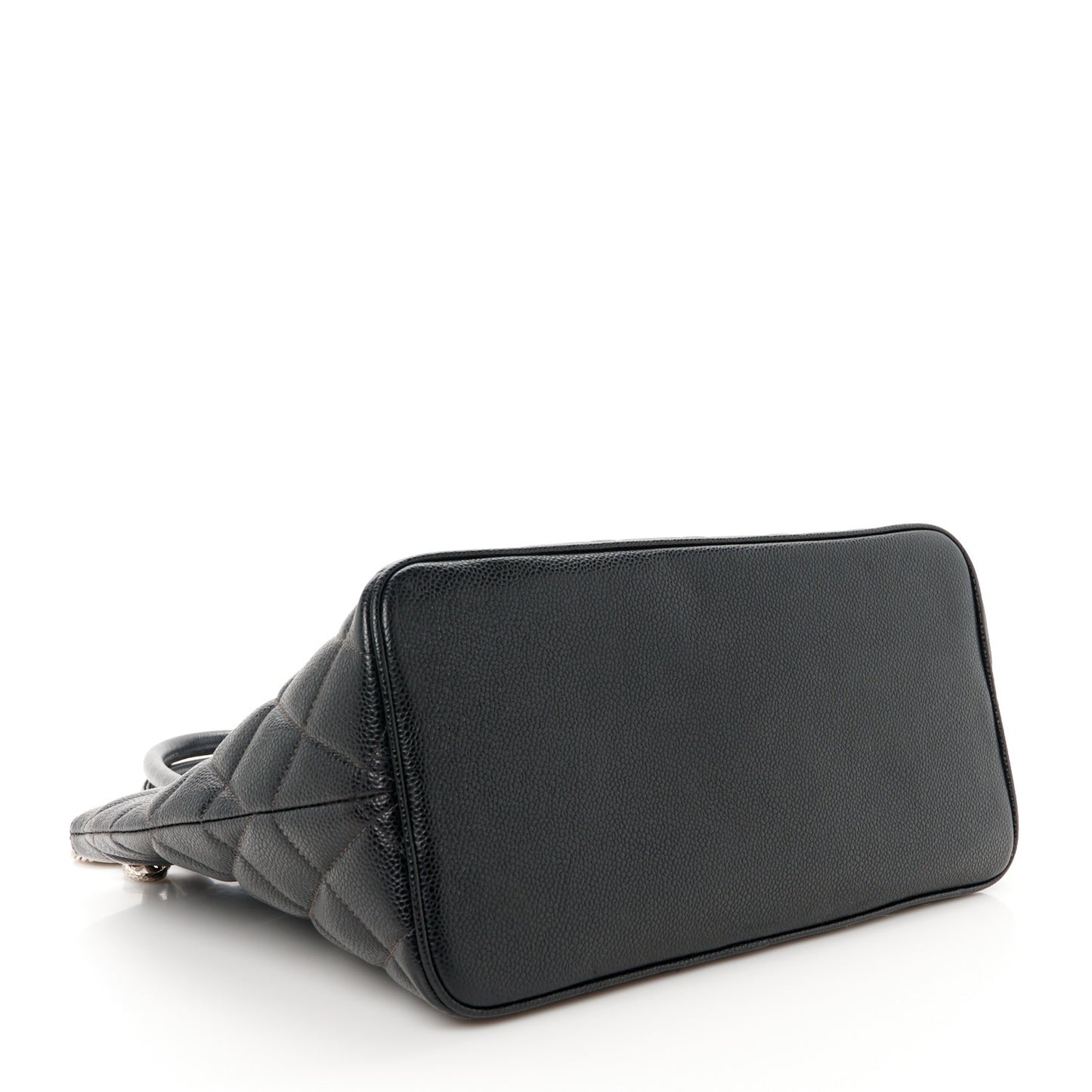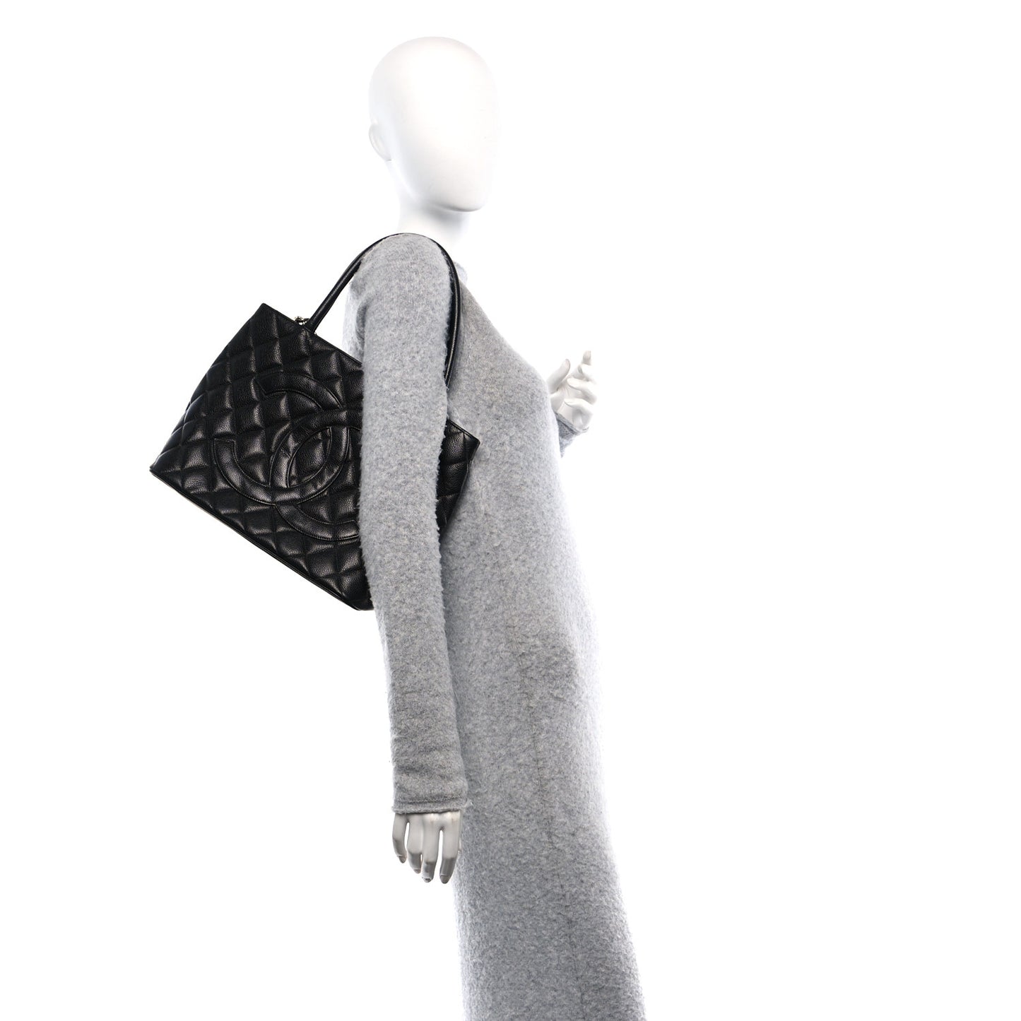 This is an authentic CHANEL Caviar Quilted Medallion Tote in Black. This stylish tote is beautifully crafted of diamond-quilted caviar leather in black with a prominent Chanel CC logo patch on the front. The bag features a rear patch pocket and rolled leather top handles. The silver medallion zipper pull opens the bag to a smooth black leather interior with zipper and patch pockets.Follow this item for alerts. Chanel is a registered trademark of Chanel. FASHIONPHILE is not affiliated with Chanel.