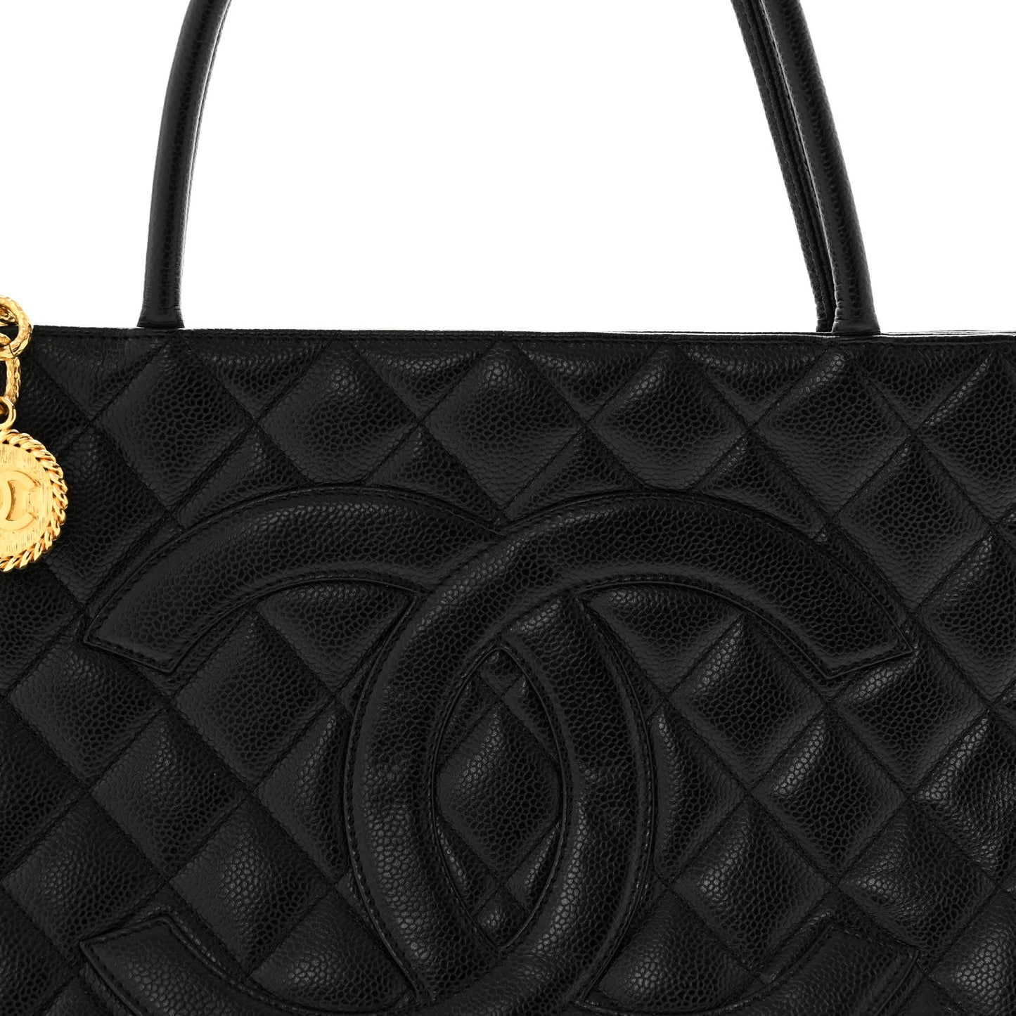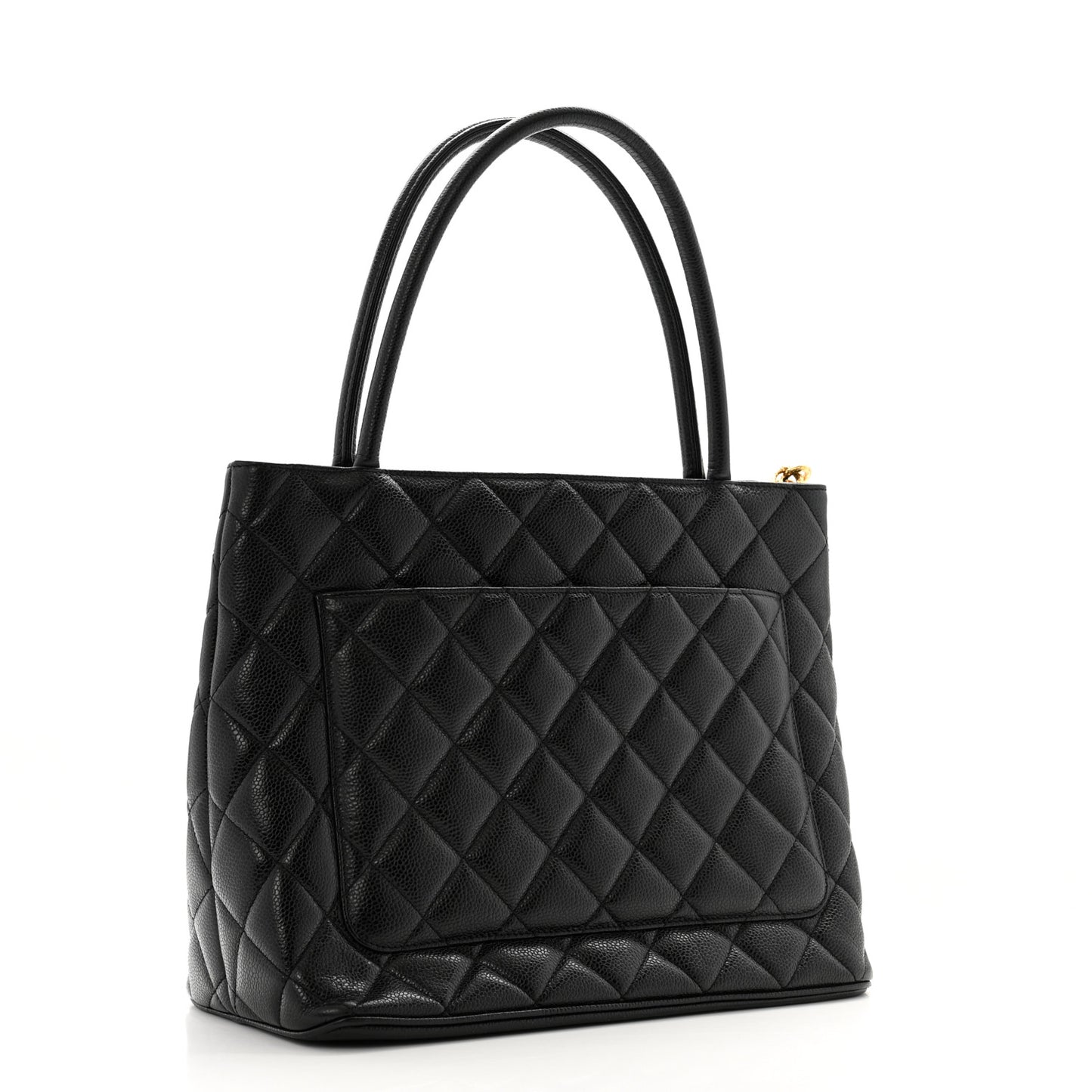 This is an authentic CHANEL Caviar Quilted Medallion Tote in Black. This stylish tote is beautifully crafted of diamond-quilted caviar leather in black with a prominent Chanel CC logo patch on the front. The bag features a rear patch pocket and rolled leather top handles. The gold medallion zipper pull opens the bag to a smooth black leather interior with zipper and patch pockets.Follow this item for alerts. Chanel is a registered trademark of Chanel. FASHIONPHILE is not affiliated with Chanel.