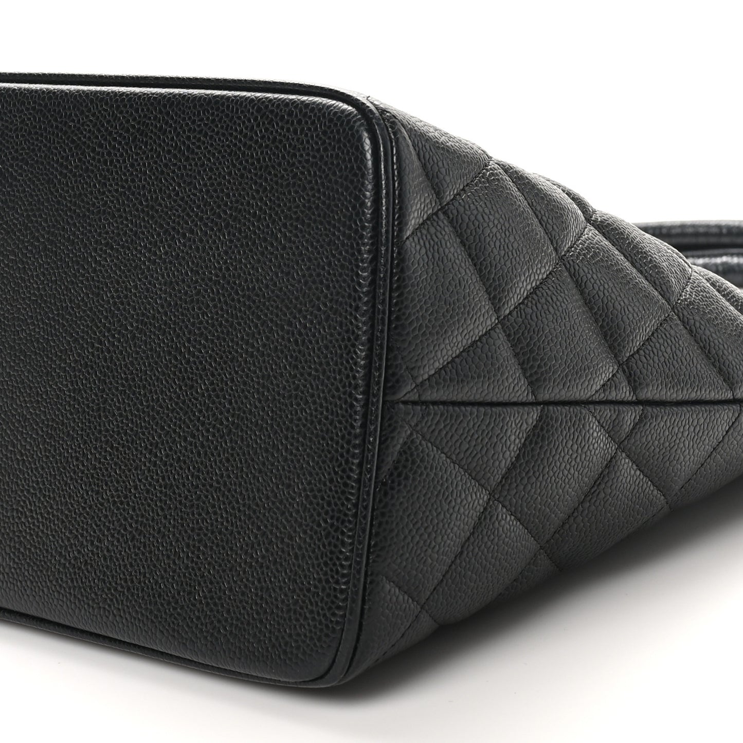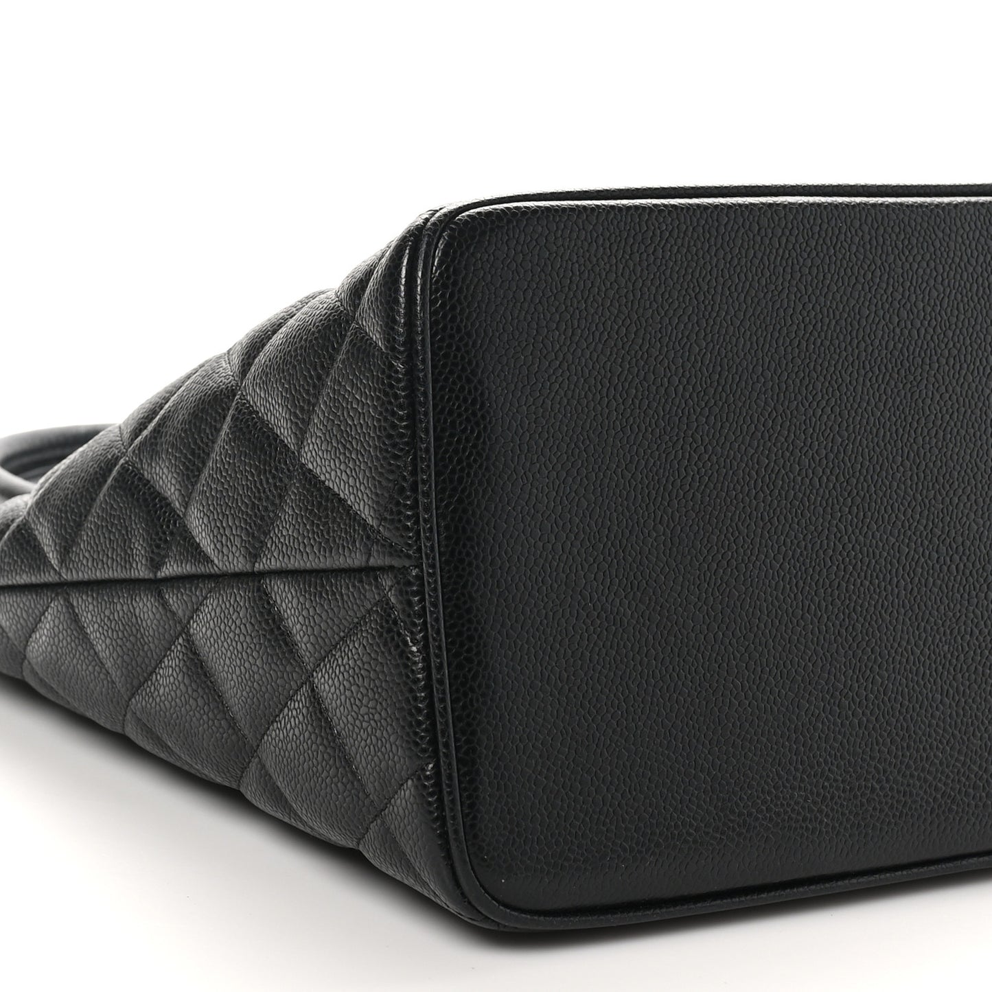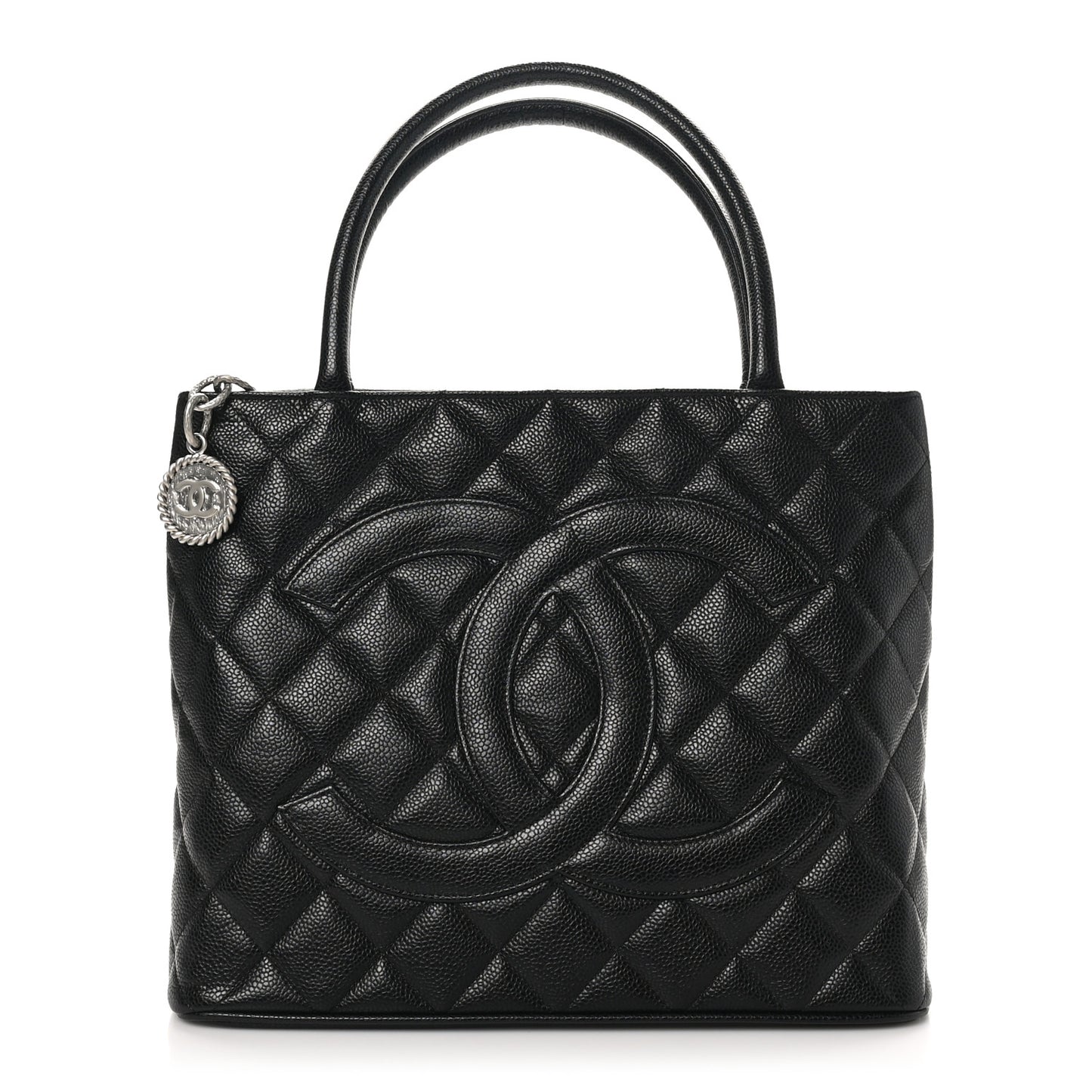 This is an authentic CHANEL Caviar Quilted Medallion Tote in Black. This stylish tote is beautifully crafted of diamond-quilted caviar leather in black with a prominent Chanel CC logo patch on the front. The bag features a rear patch pocket and rolled leather top handles. The silver medallion zipper pull opens the bag to a smooth black leather interior with zipper and patch pockets.Follow this item for alerts. Chanel is a registered trademark of Chanel. FASHIONPHILE is not affiliated with Chanel.