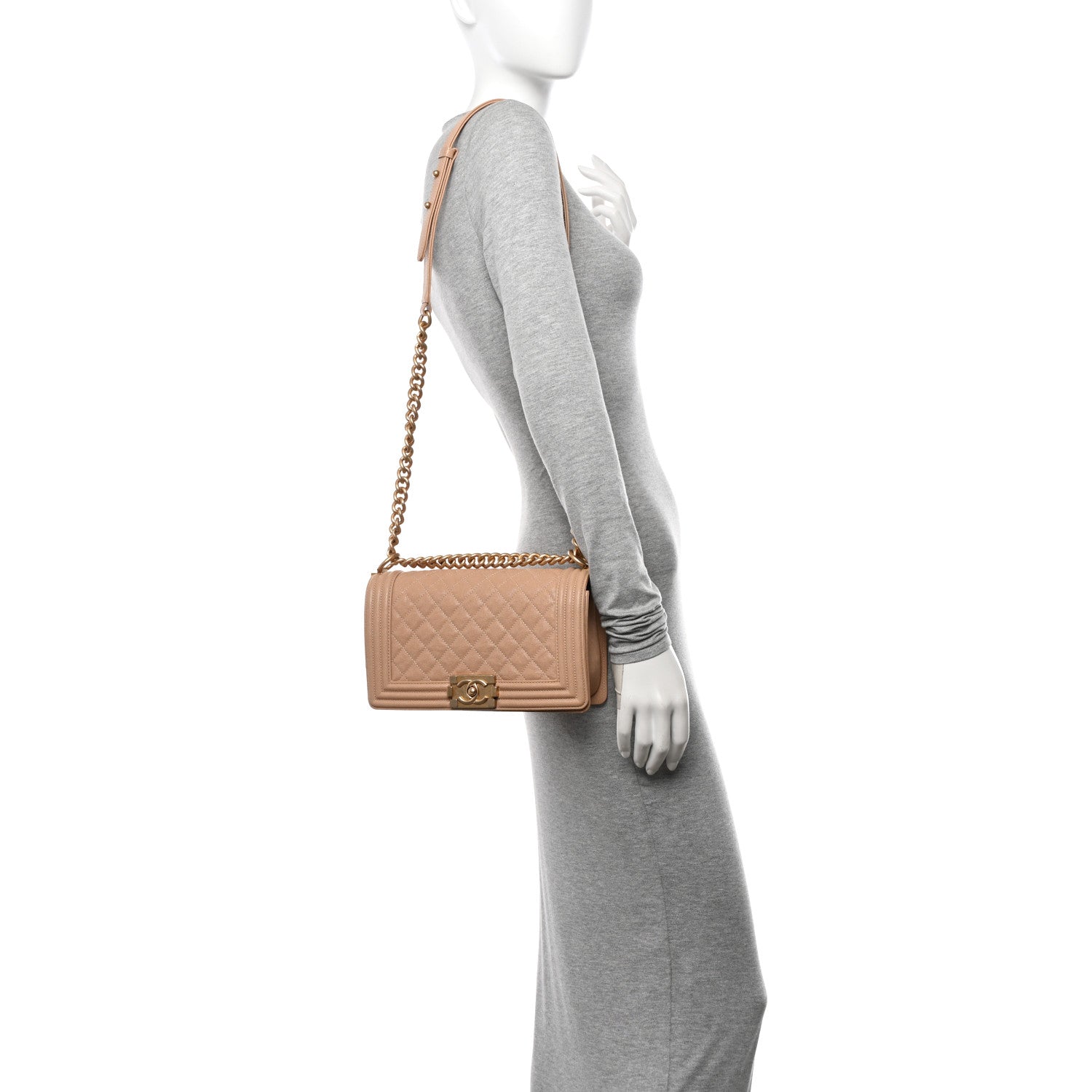 This is an authentic CHANEL Caviar Quilted Medium Boy Flap in Beige. This chic shoulder bag is crafted of diamond quilted caviar leather in beige with a linear quilted border. The bag features an aged gold chainlink shoulder strap with a leather shoulder pad and a Chanel boy CC push lock on the front flap. This opens to a matching beige fabric interior with a patch pocket.Follow this item for alerts. Chanel is a registered trademark of Chanel. FASHIONPHILE is not affiliated with Chanel.
