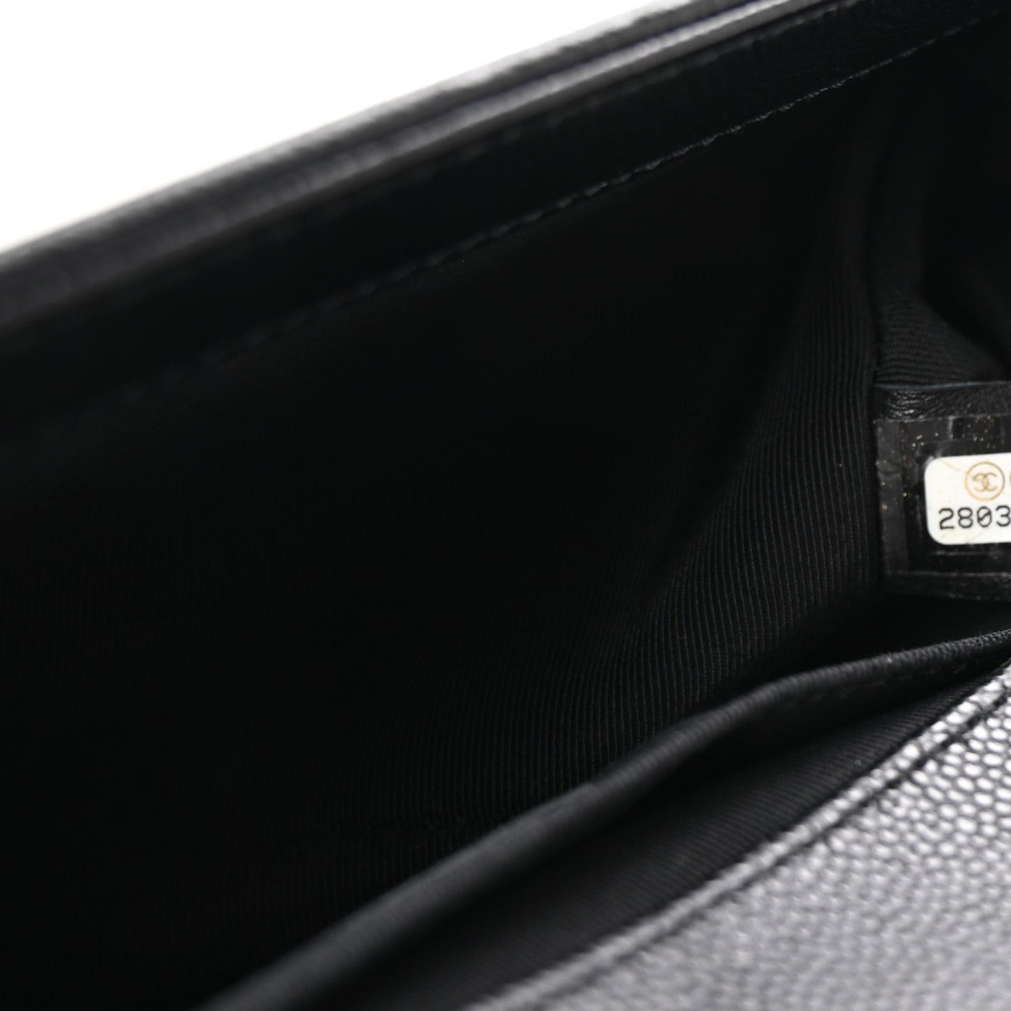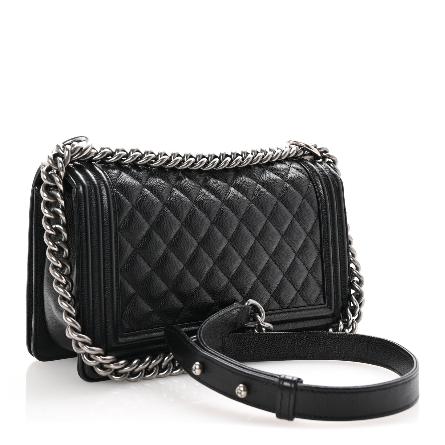 This is an authentic CHANEL Caviar Quilted Medium Boy Flap in Black. This shoulder bag is crafted of caviar leather in black. The bag features a dark silver chain shoulder strap with a leather shoulder pad, a diamond quilted crossover flap with a linear quilted border, and a dark silver boy CC push lock. This opens to a black fabric interior with a patch pocket.Follow this item for alerts. Chanel is a registered trademark of Chanel. FASHIONPHILE is not affiliated with Chanel.