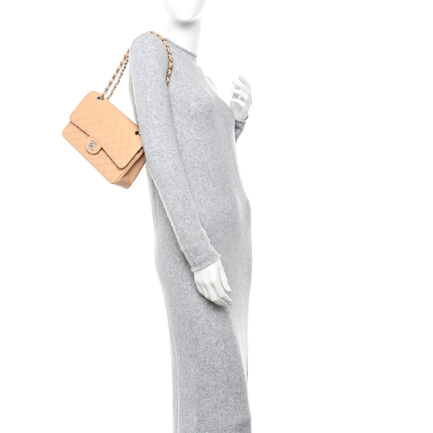 This is an authentic CHANEL Caviar Quilted Medium Double Flap in Beige. This stylish shoulder bag is crafted of luxurious caviar leather in light beige. The bag features polished silver chain link leather threaded shoulder straps and Chanel CC interlocking turn lock for the front flap. This opens to an inner flap and a matching leather interior with patch pockets.Follow this item for alerts. Chanel is a registered trademark of Chanel. FASHIONPHILE is not affiliated with Chanel.
