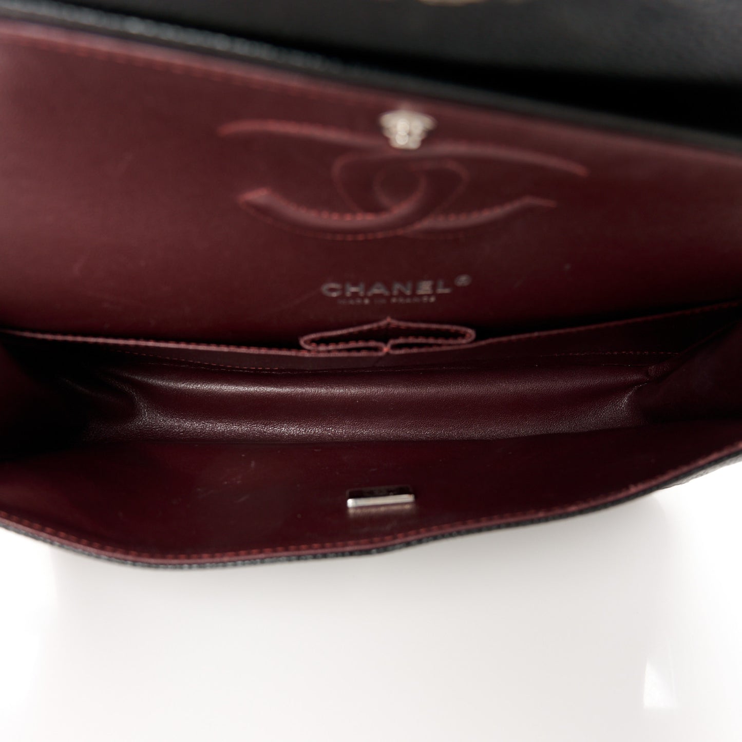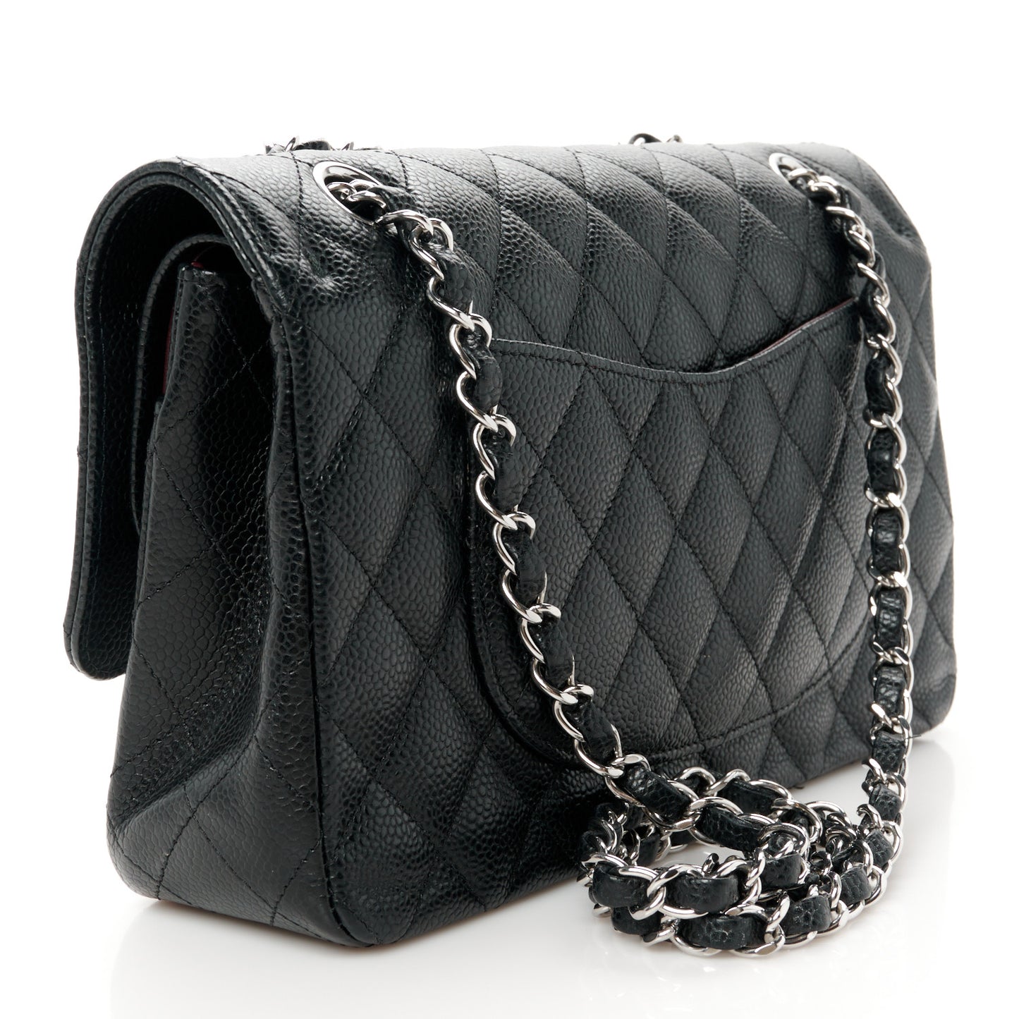 This is an authentic CHANEL Caviar Quilted Medium Double Flap in Black. This elegant shoulder bag is crafted of luxurious caviar textured leather in black. The bag features a leather-threaded silver chain-link shoulder strap, a rear patch pocket, and a crossover flap with a silver classic CC turn lock. The flap opens to reveal an inner flap and a burgundy leather interior with pockets.Follow this item for alerts. Chanel is a registered trademark of Chanel. FASHIONPHILE is not affiliated with Chanel.