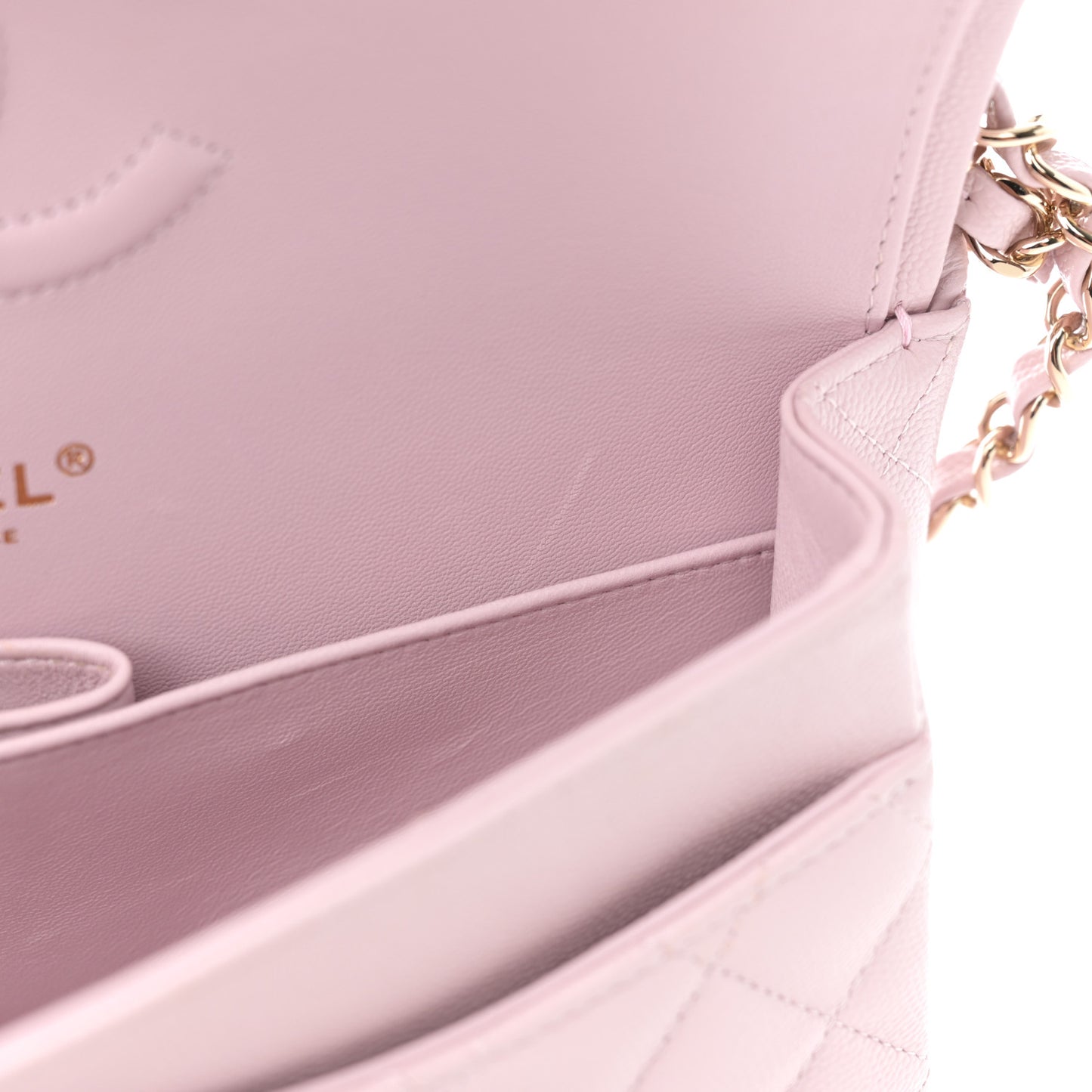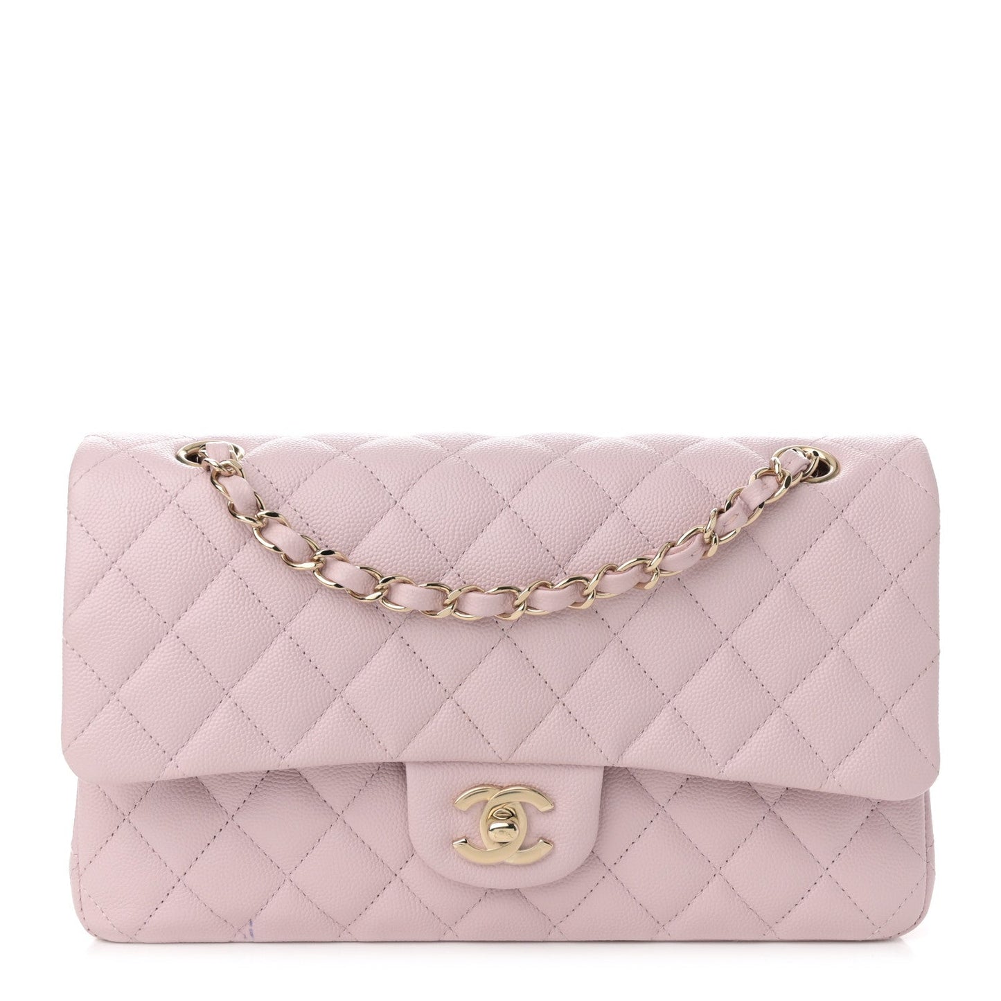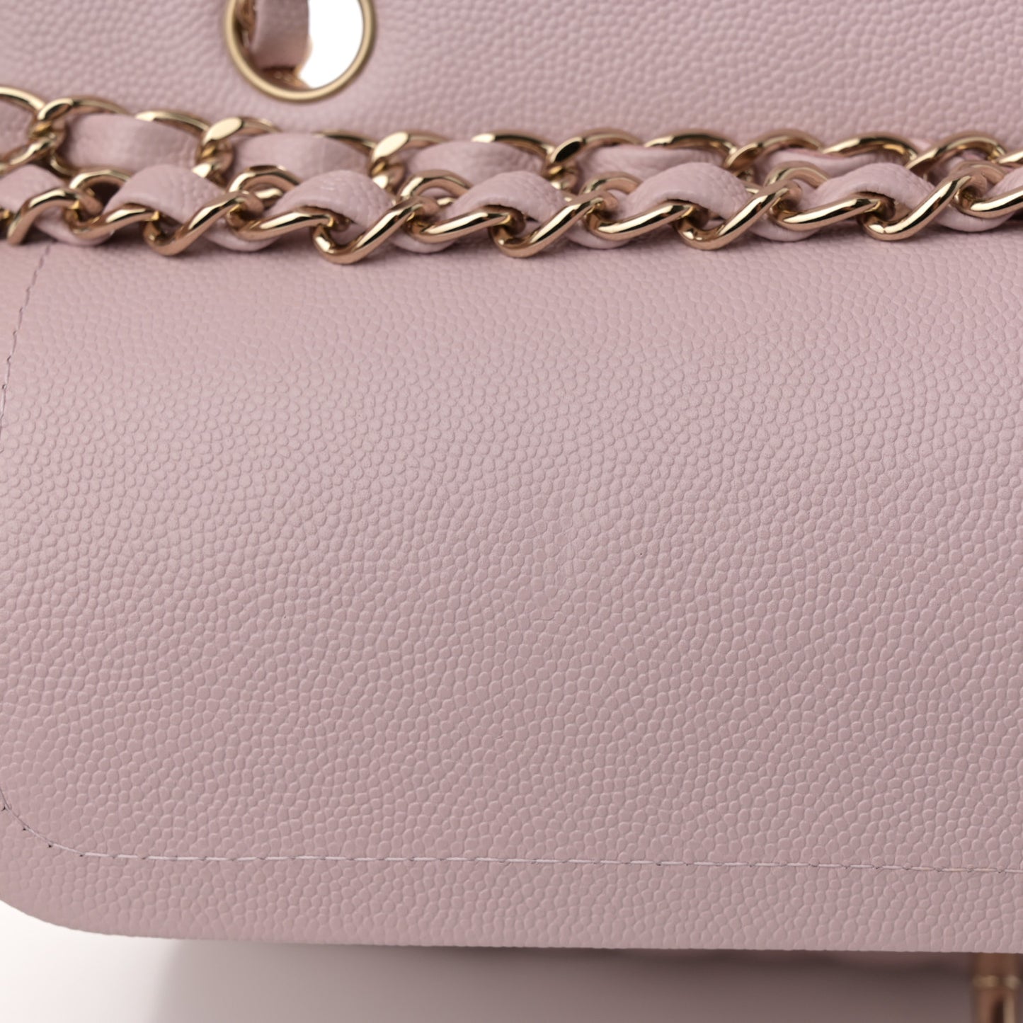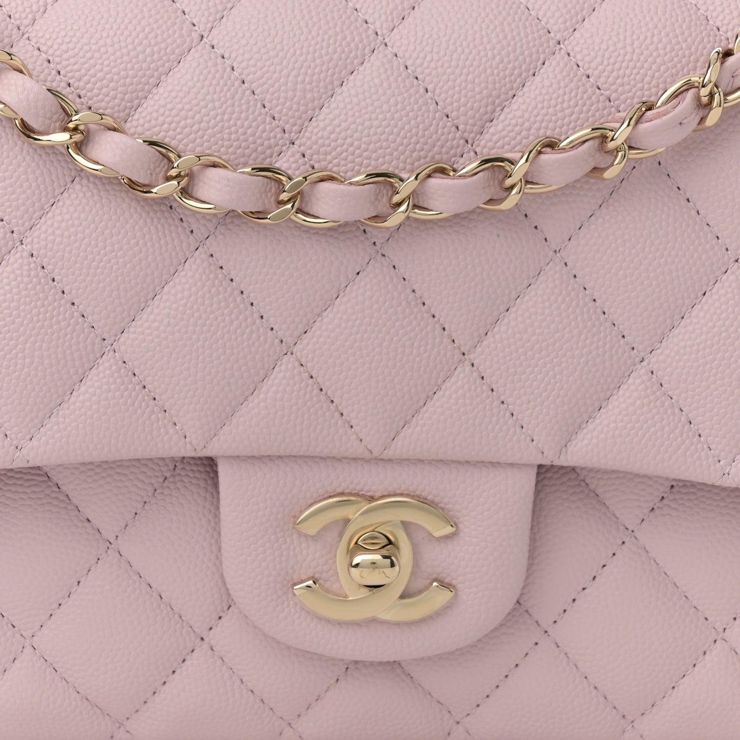 This is an authentic CHANEL Caviar Quilted Medium Double Flap in Light Pink. This classic flap bag is crafted of diamond quilted caviar leather in pink. The bag features a light gold chain-link shoulder strap threaded with pink leather, a crossover flap, and a light gold Chanel CC turn-lock on the front. This handbag opens to an inner flap and a matching pink matte leather interior with pockets.Follow this item for alerts. Chanel is a registered trademark of Chanel. FASHIONPHILE is not affiliated with Chanel.