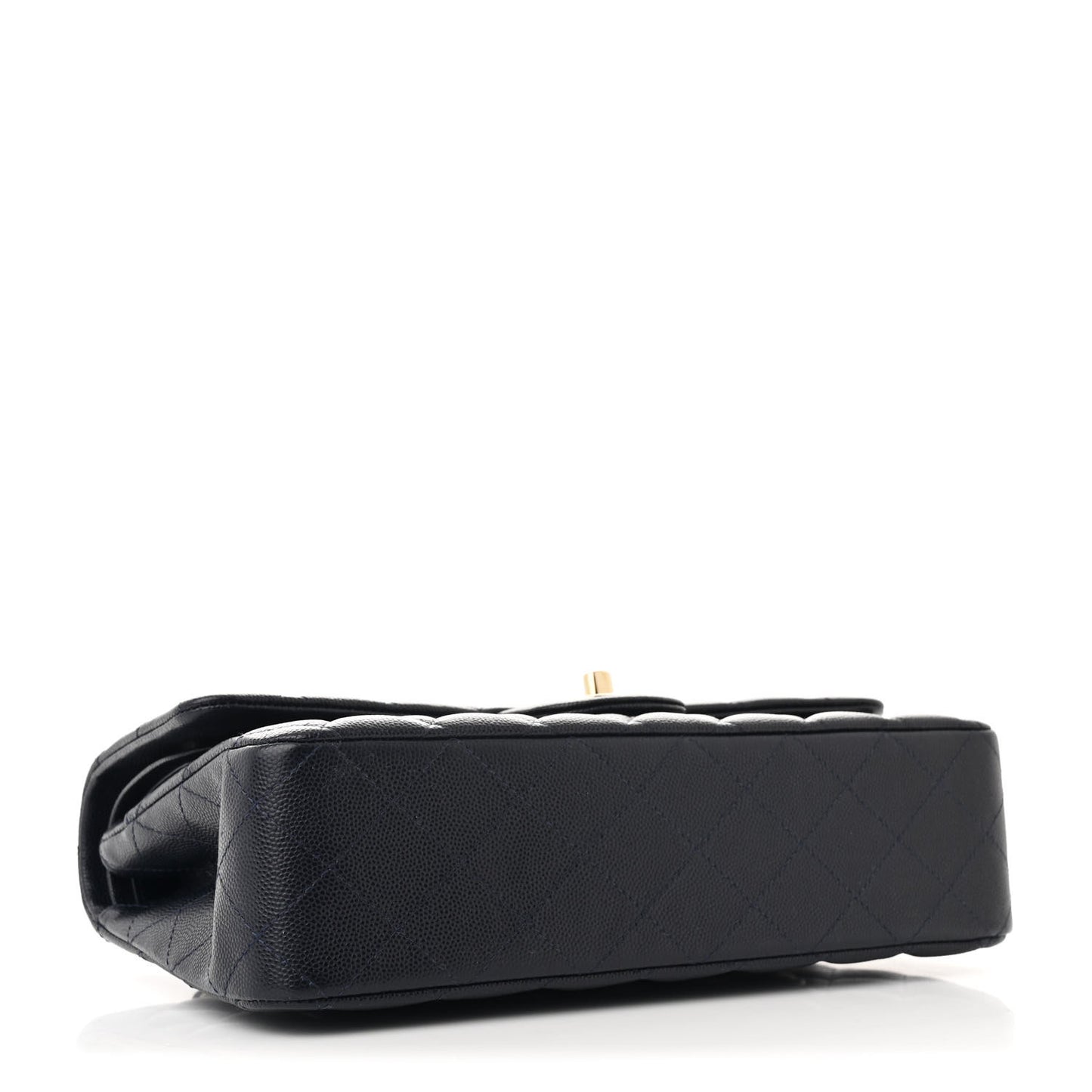 This is an authentic CHANEL Caviar Quilted Medium Double Flap in Navy. This elegant shoulder bag is crafted of luxurious caviar textured leather in dark navy blue. The bag features leather threaded gold chain-link shoulder strap, a rear patch pocket, and a crossover flap with a gold classic CC turn lock. The flap opens to reveal an inner flap and a leather interior with patch pockets.Follow this item for alerts. Chanel is a registered trademark of Chanel. FASHIONPHILE is not affiliated with Chanel.
